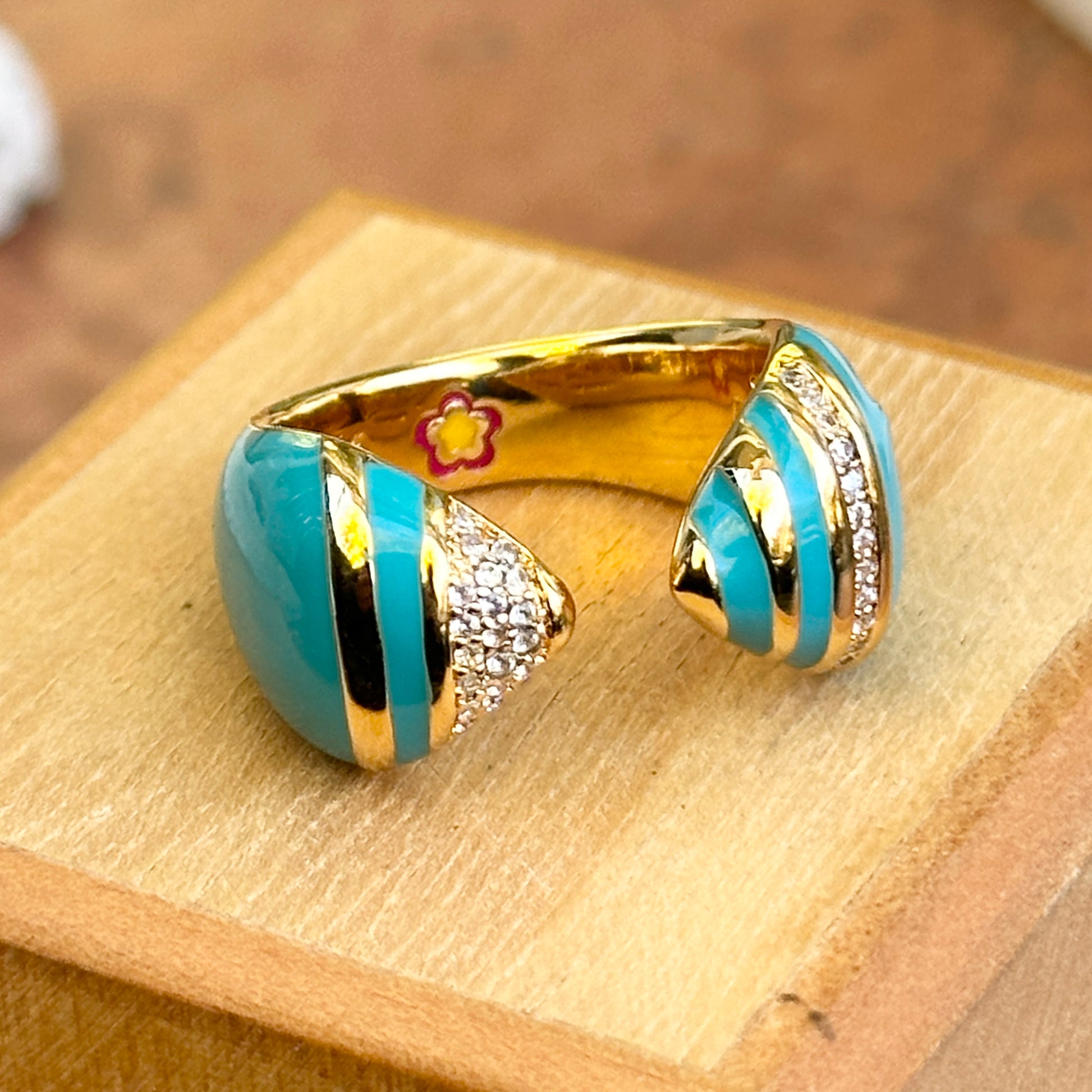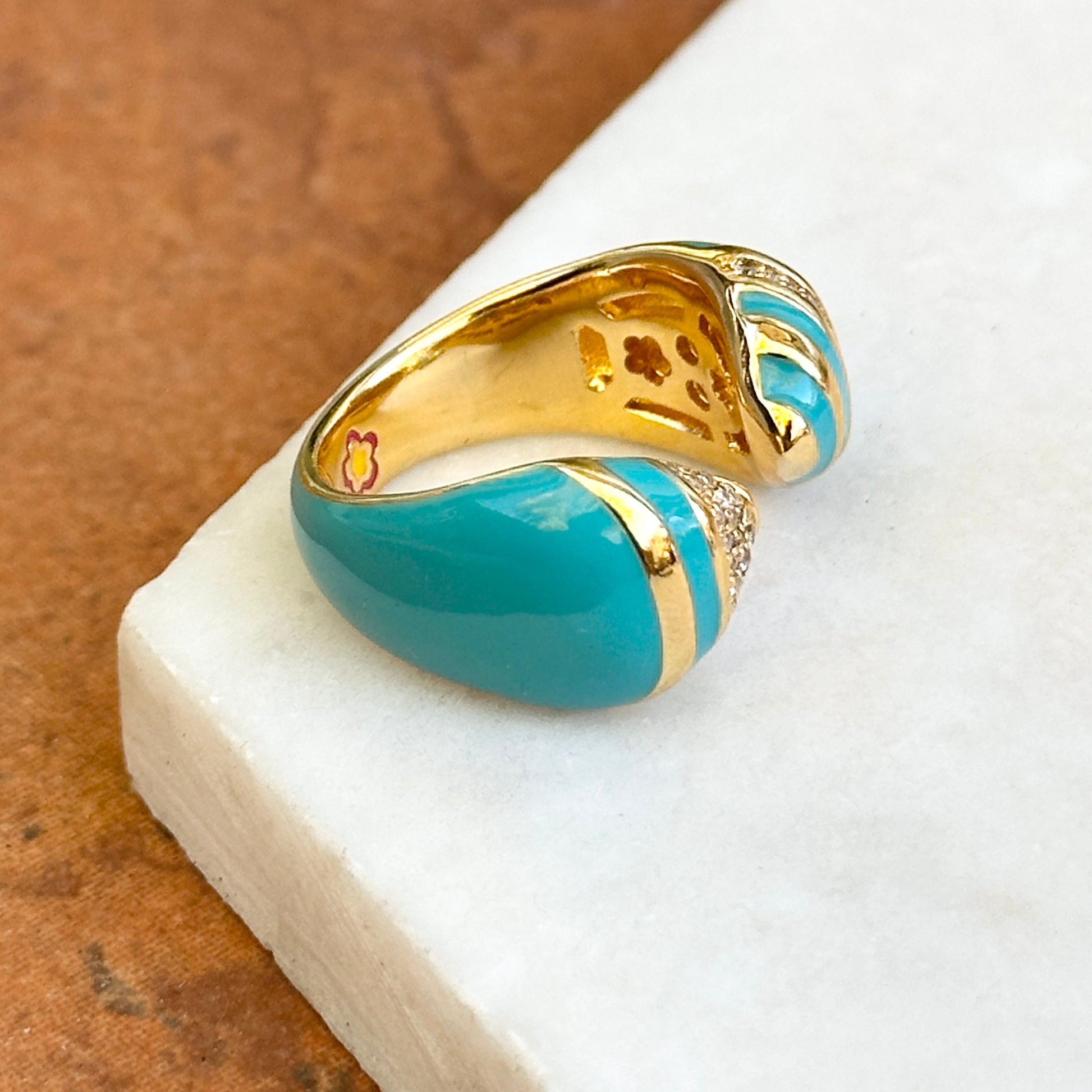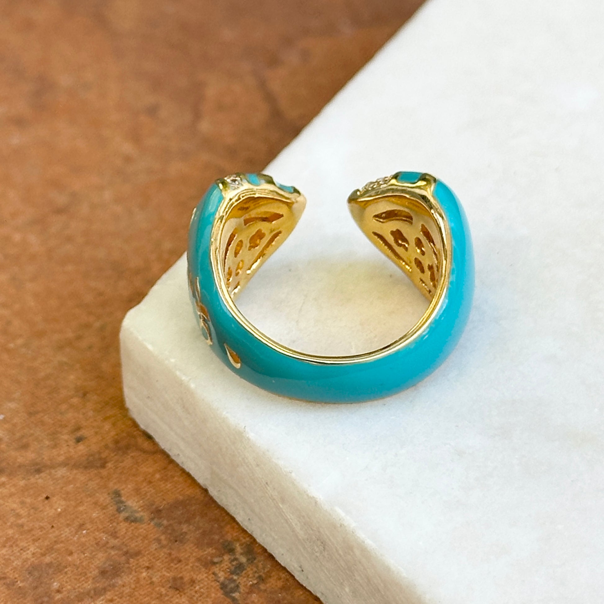 18K Yellow Gold-Plated Brass Round Cubic Zirconia Turquoise Blue Enamel Ring 7