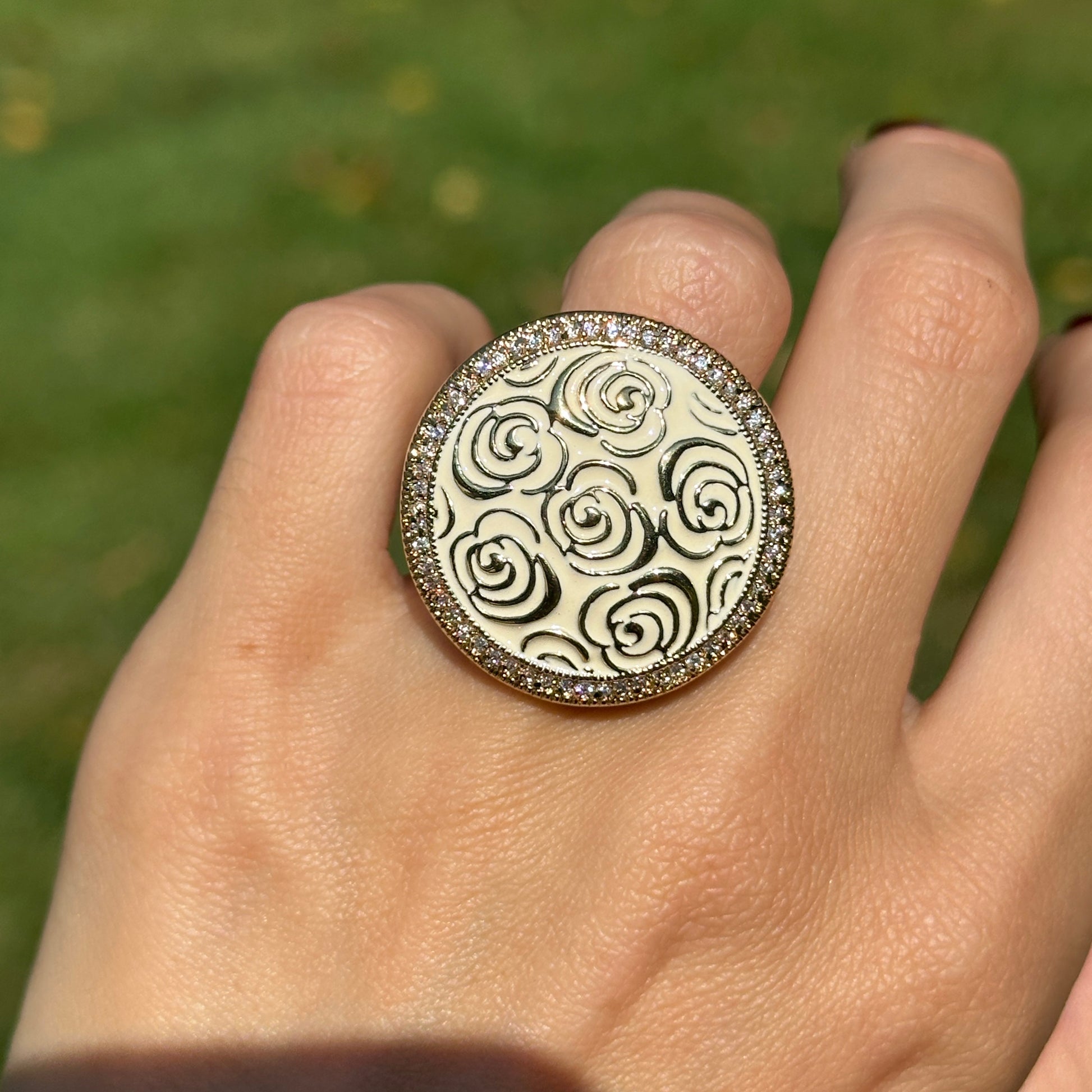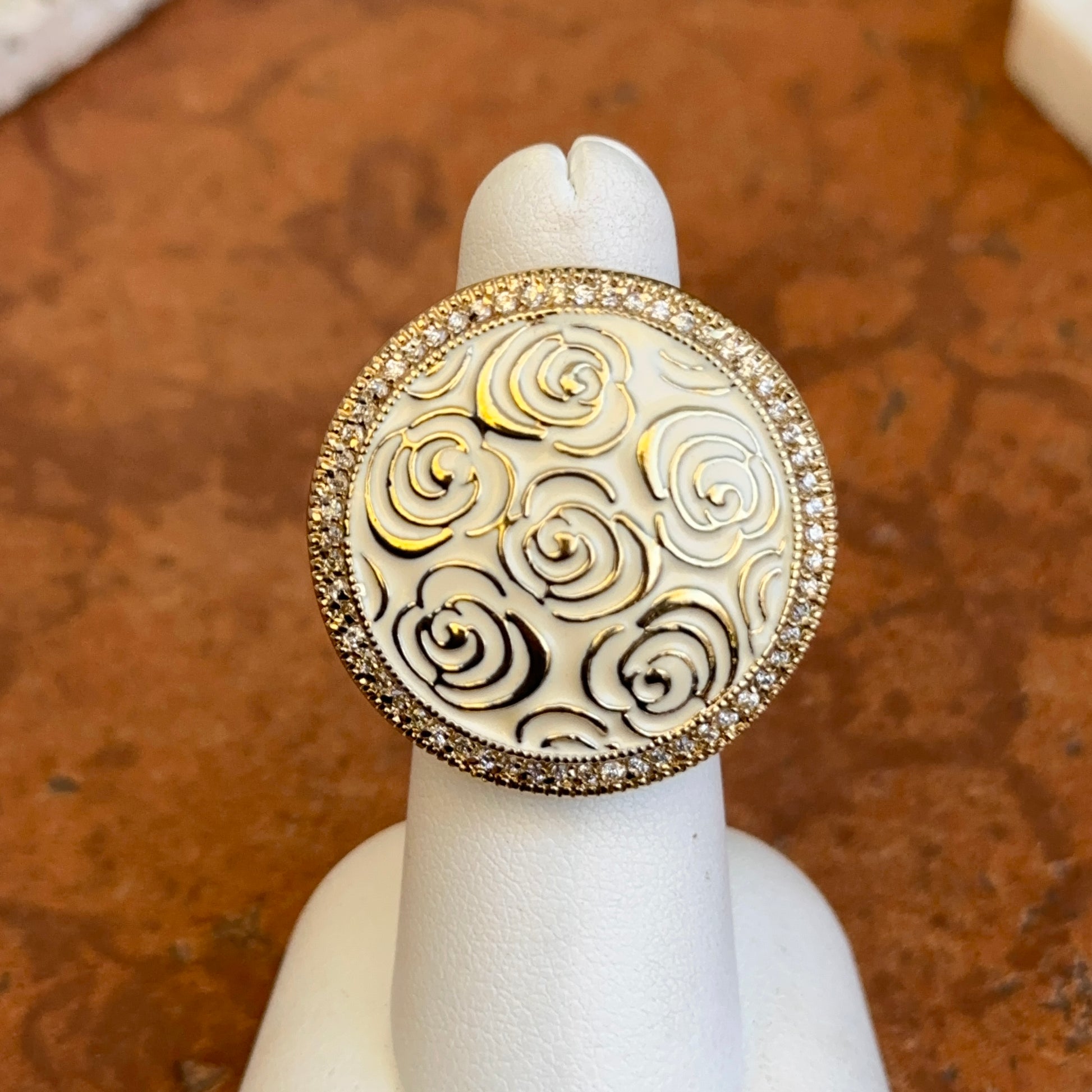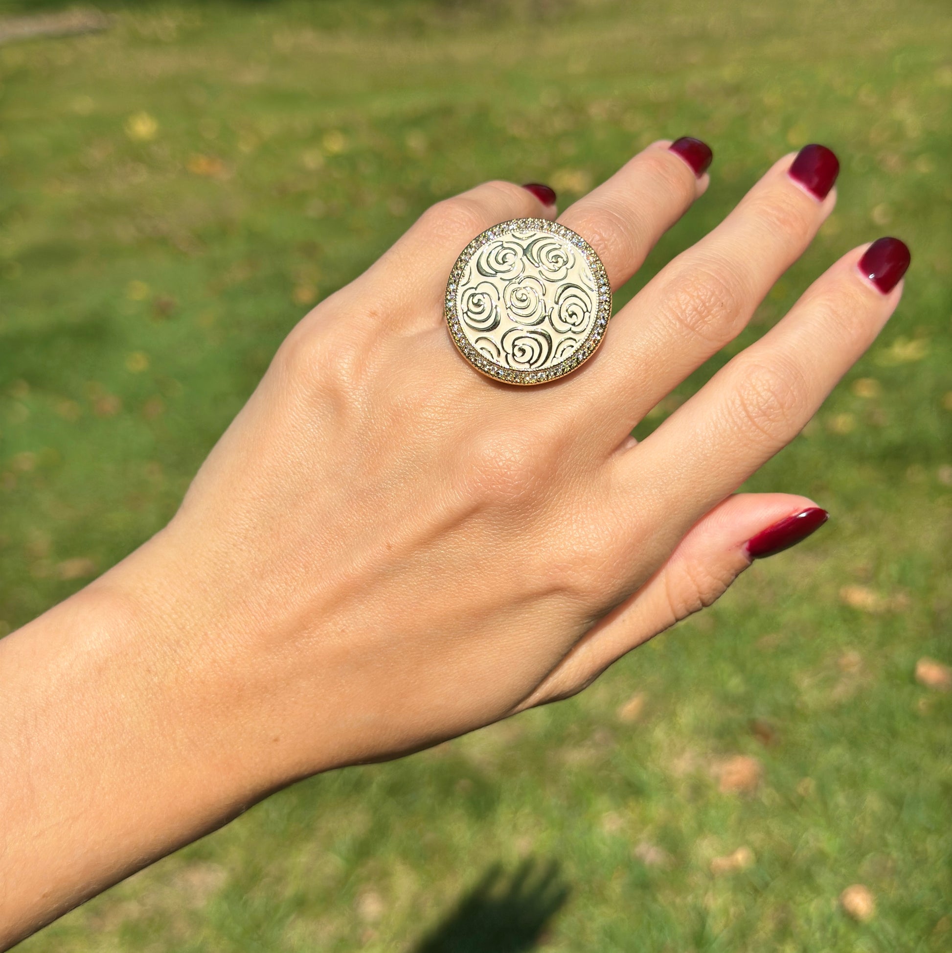 18K Yellow Gold-Plated Brass Round Cubic Zirconia White Enamel Rose Ring 6