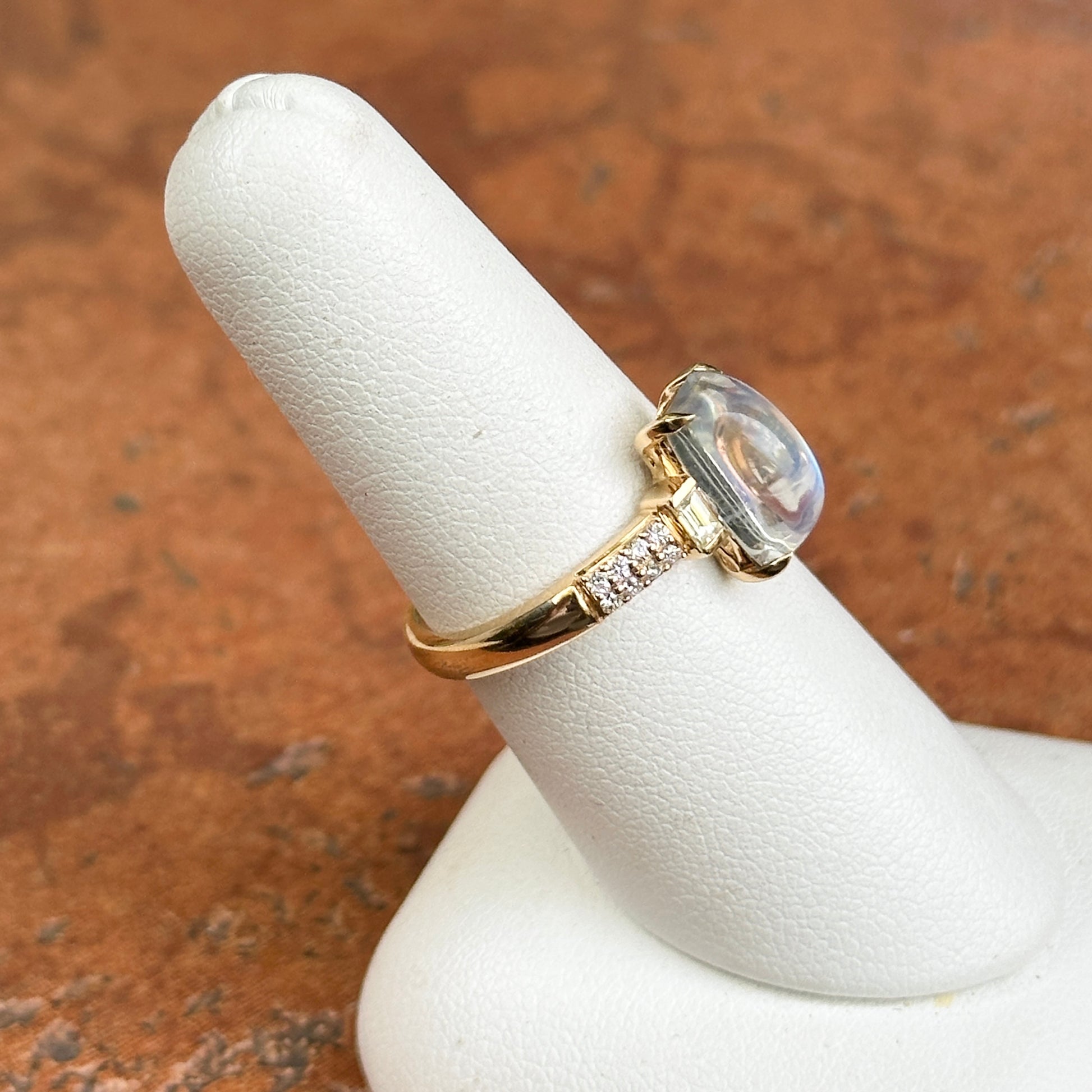 18K Yellow Gold Rectangle Cabochon Moonstone with Baguette and Round Diamond Ring