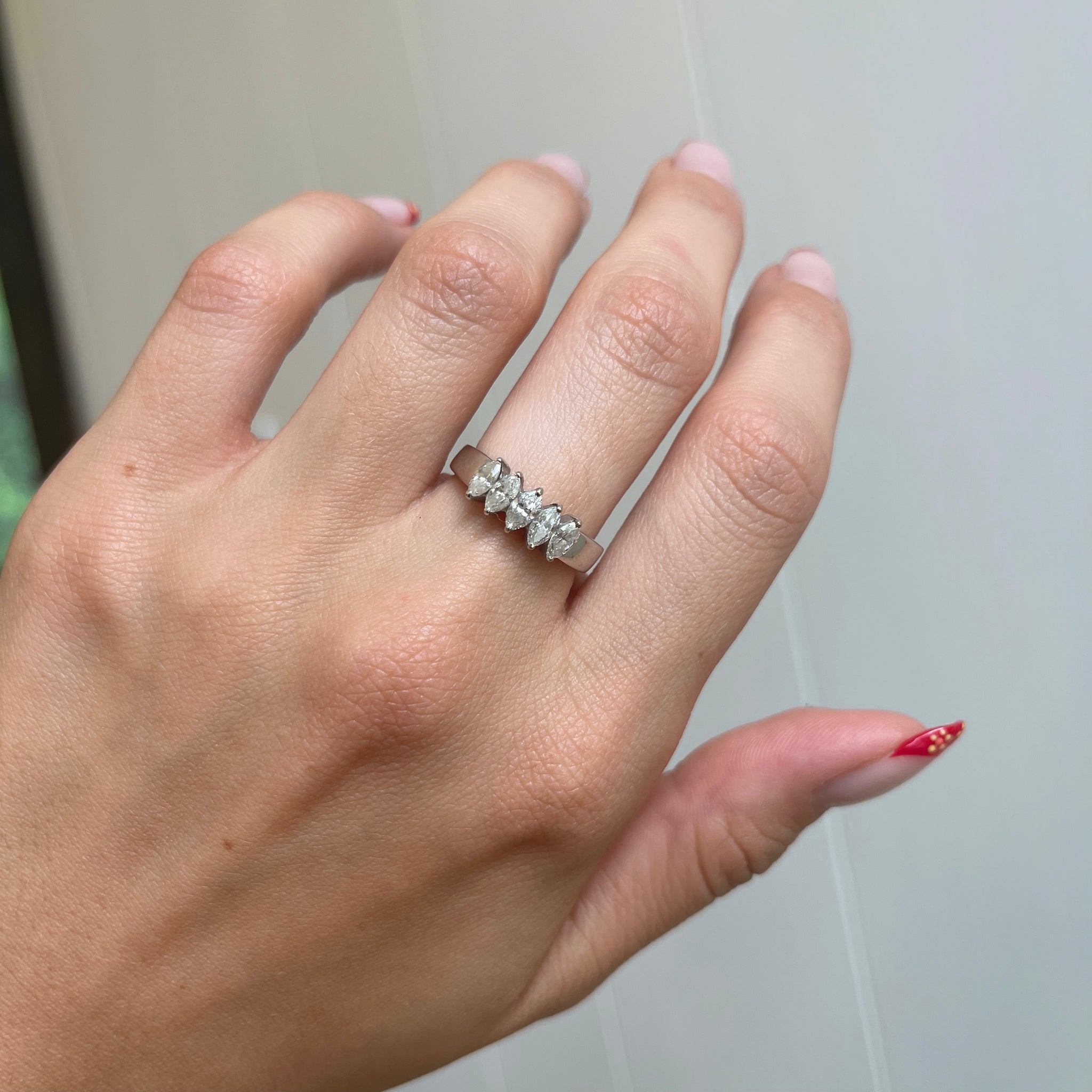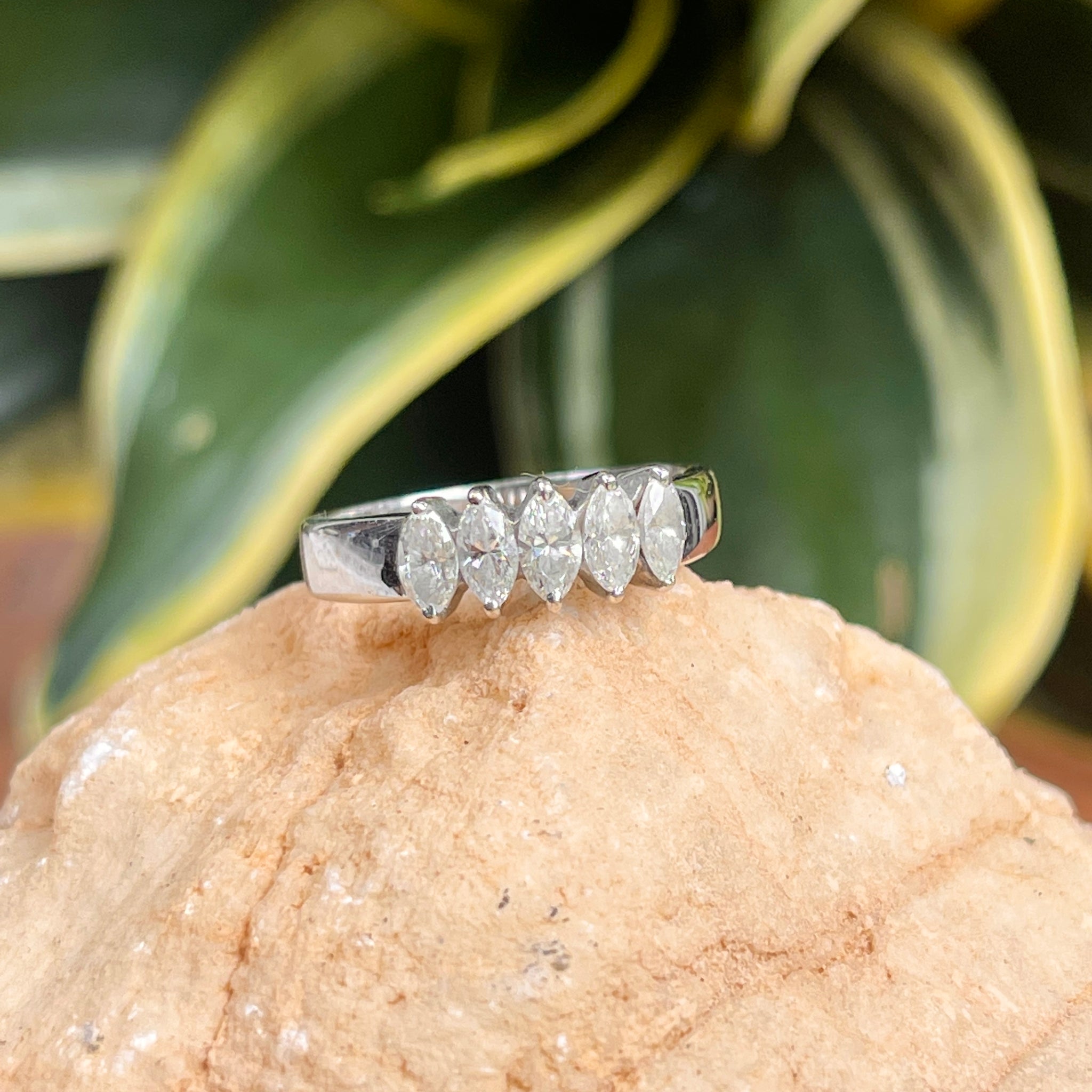 Vintage/ Antique 18KT white gold faceted marquise diamond ring. Beautiful 5-stone diamond right hand/anniversary band ring.