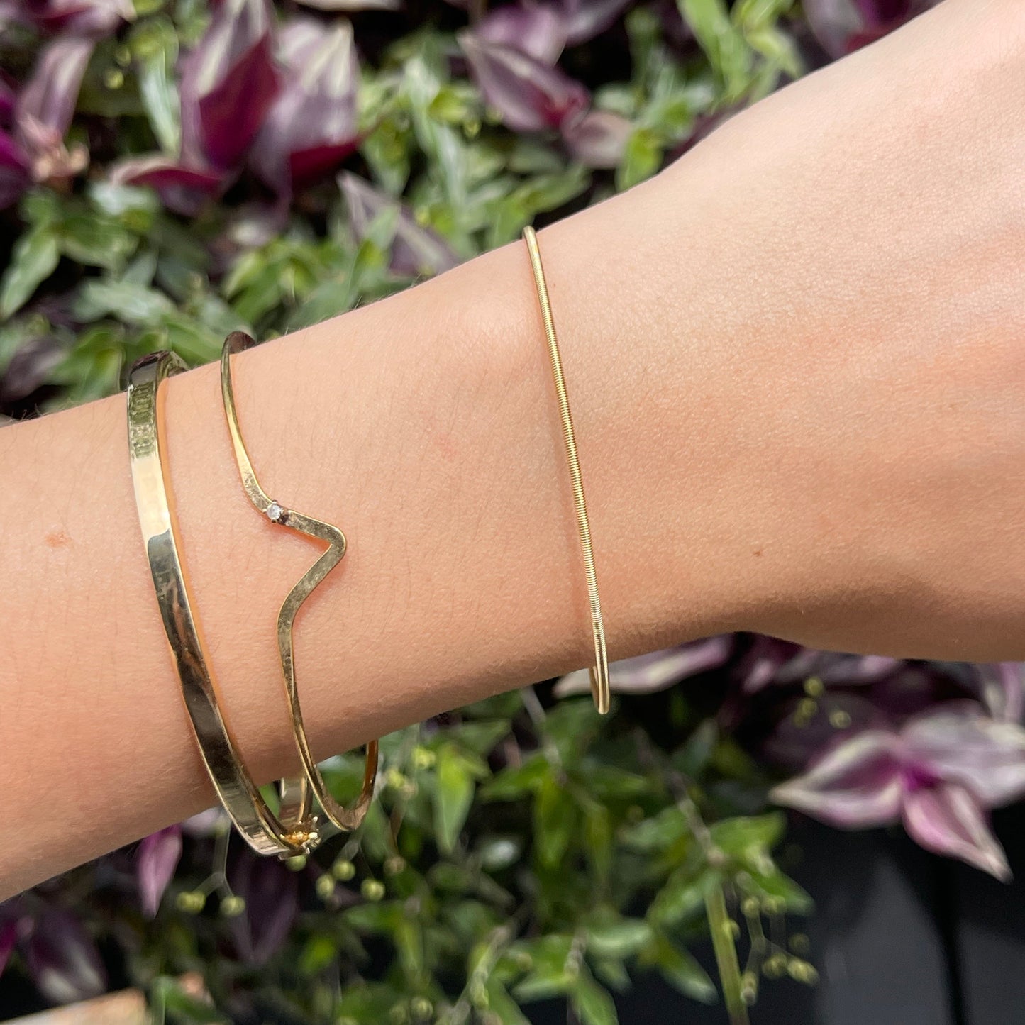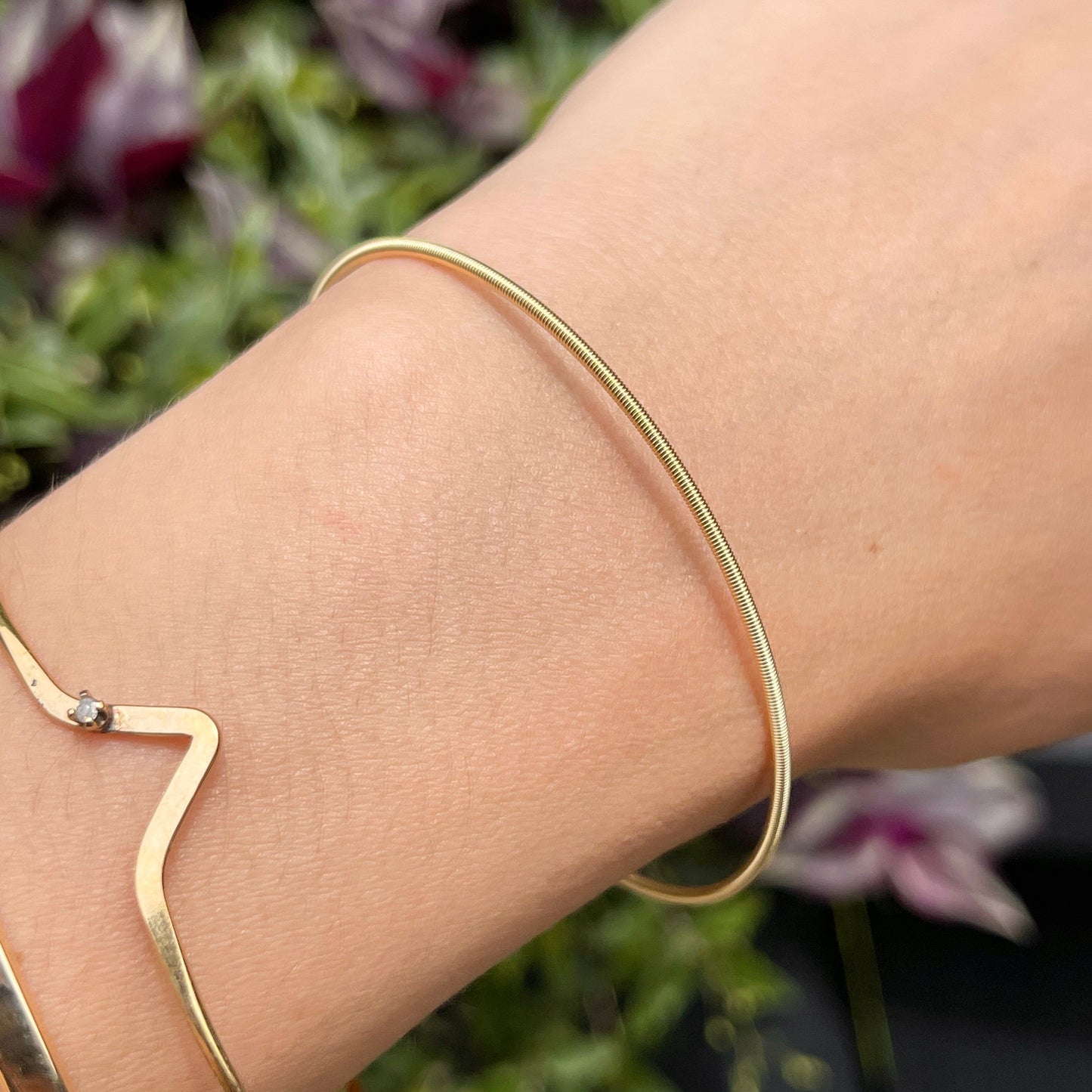 14KT yellow gold thin, twist, coil chain bracelet. A great, stackable, solid 14k, stiff bracelet.