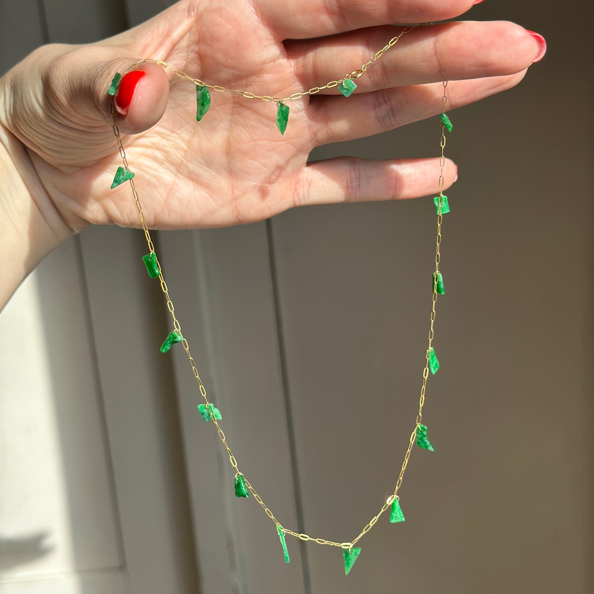 18K yellow gold thin paper clip chain necklace with abstract-cut, genuine, green jade station dangles.