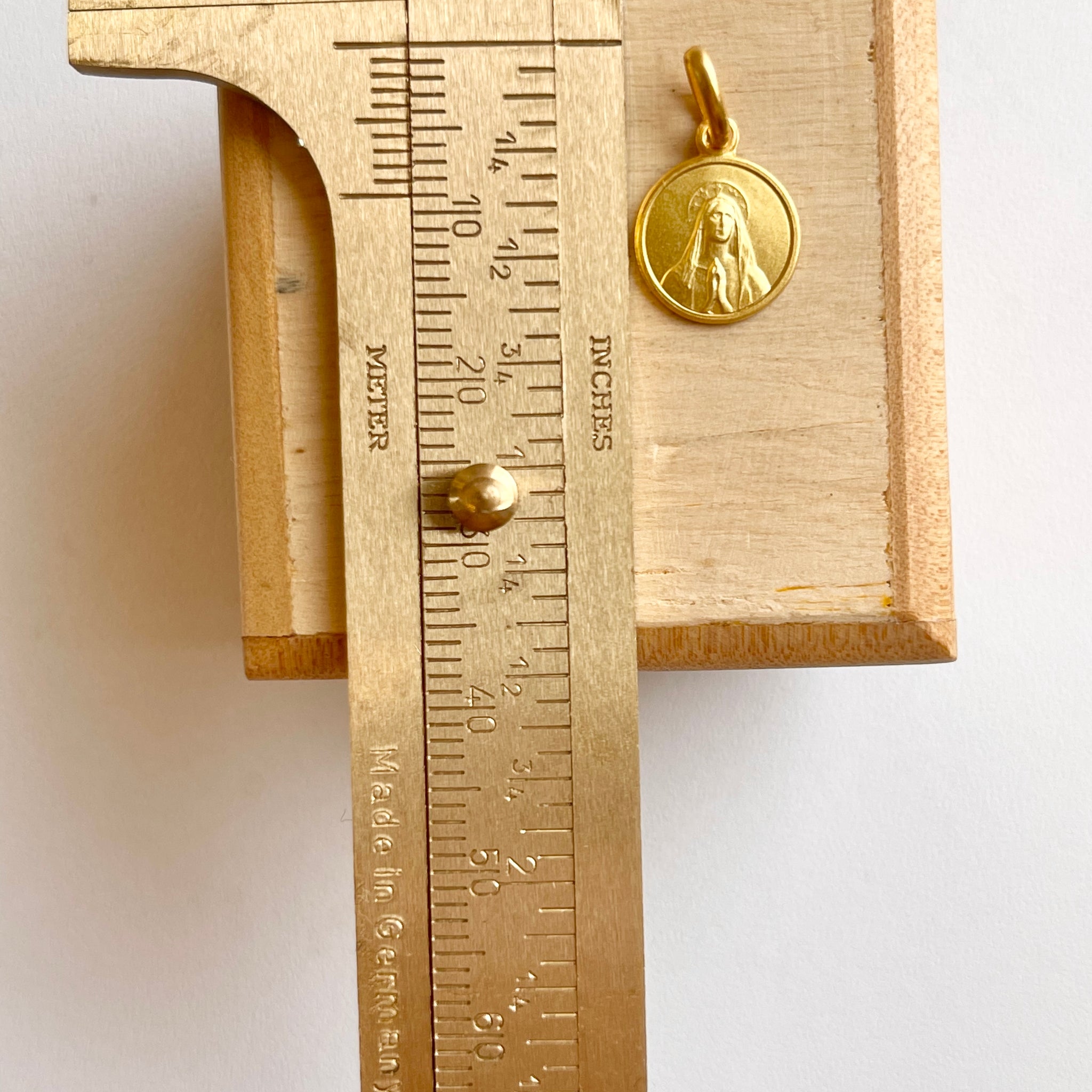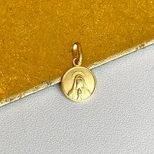 18KT yellow gold matte-finish, Our Lady of Lourdes (Lourdes Volto) round medal pendant charm. Our Lady of Lourdes is another title for the Virgin Mary.