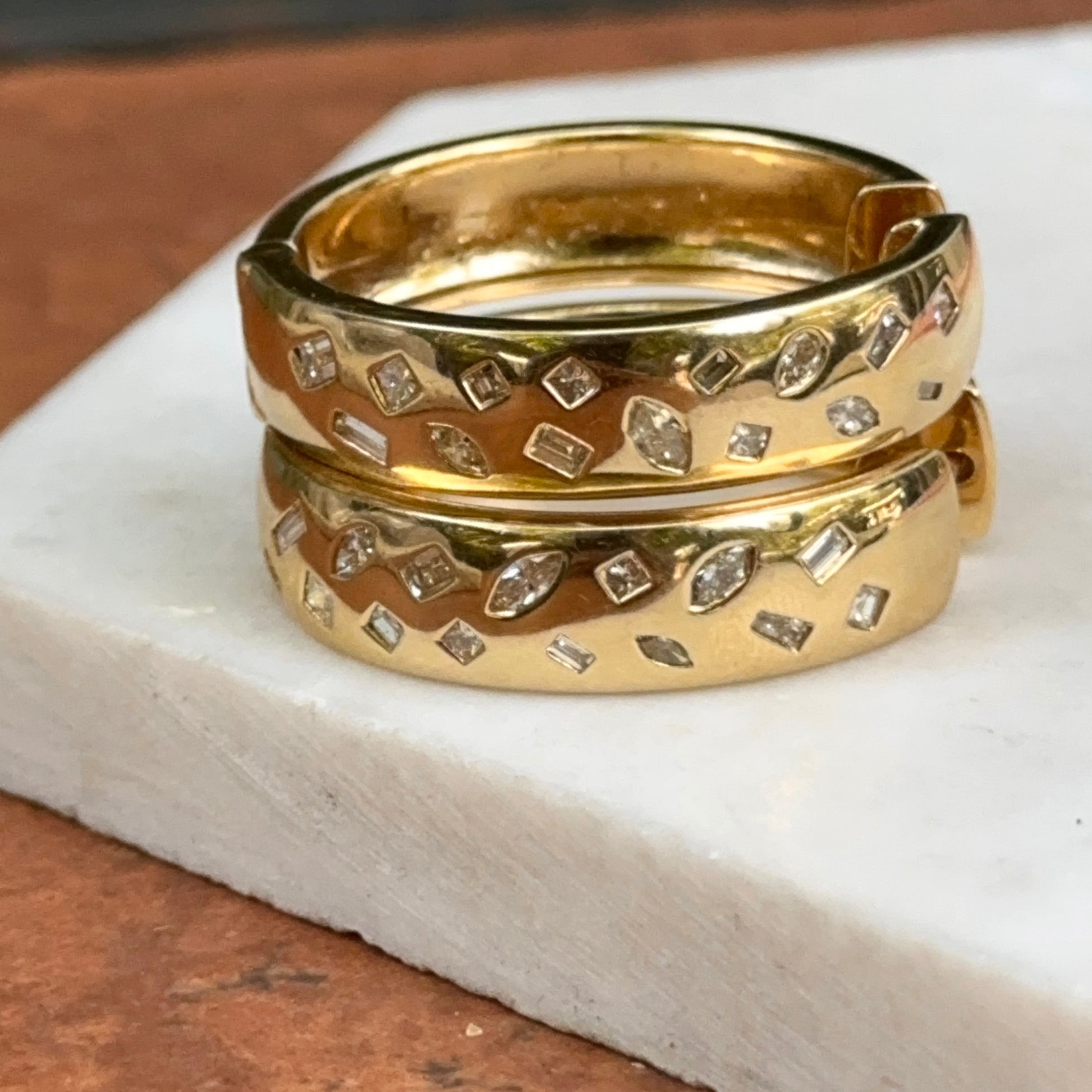 Estate 18KT Yellow Gold Multi-Shapes Gypsy Set Diamond Hoop Earrings Large