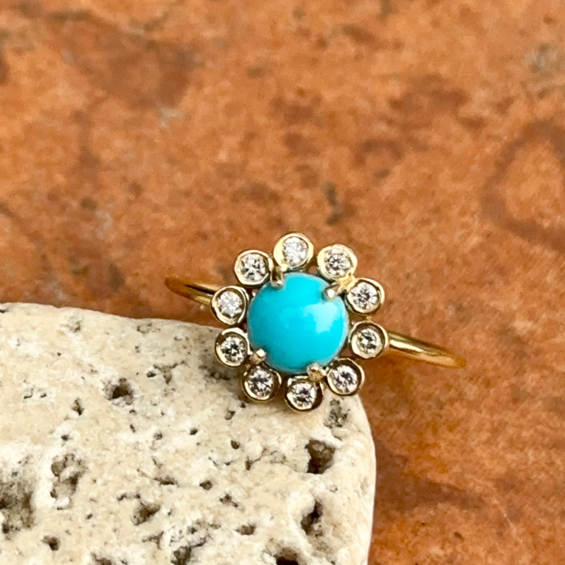18K yellow gold ring round, cabochon, genuine turquoise with a bezel-set diamond halo.