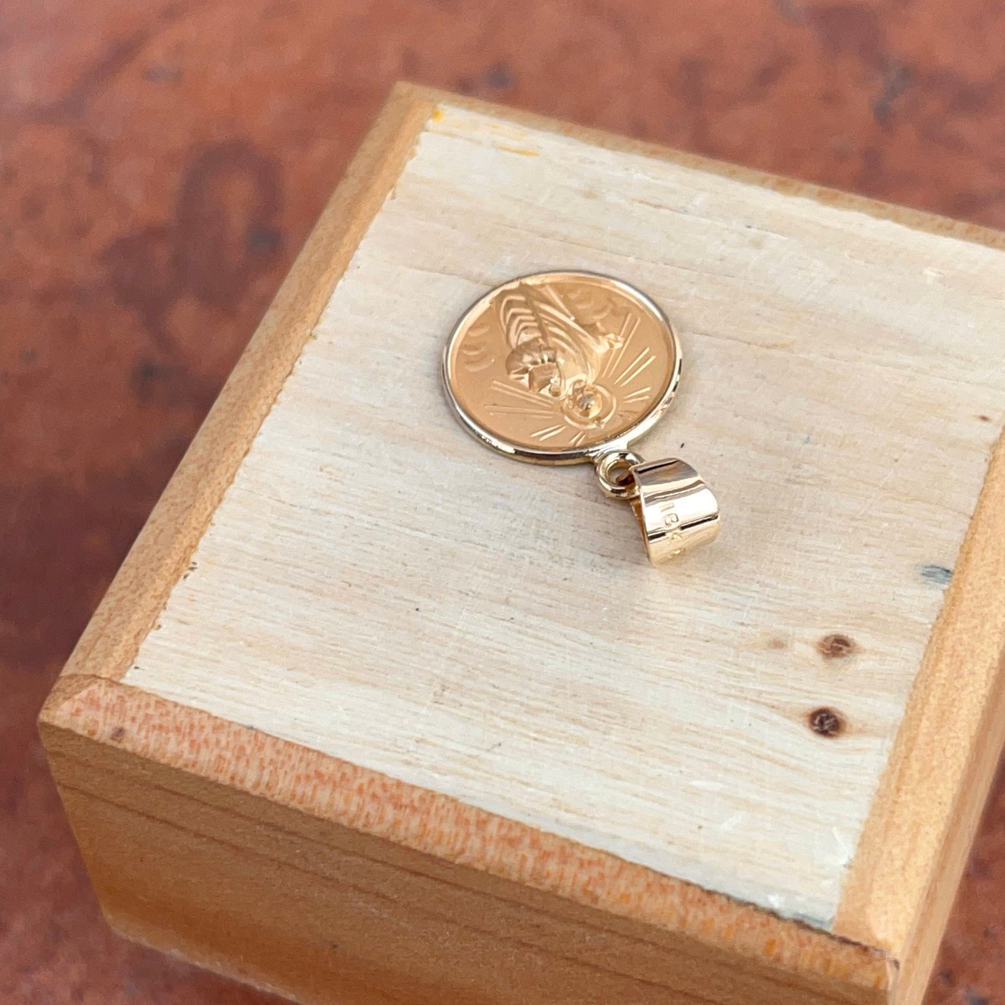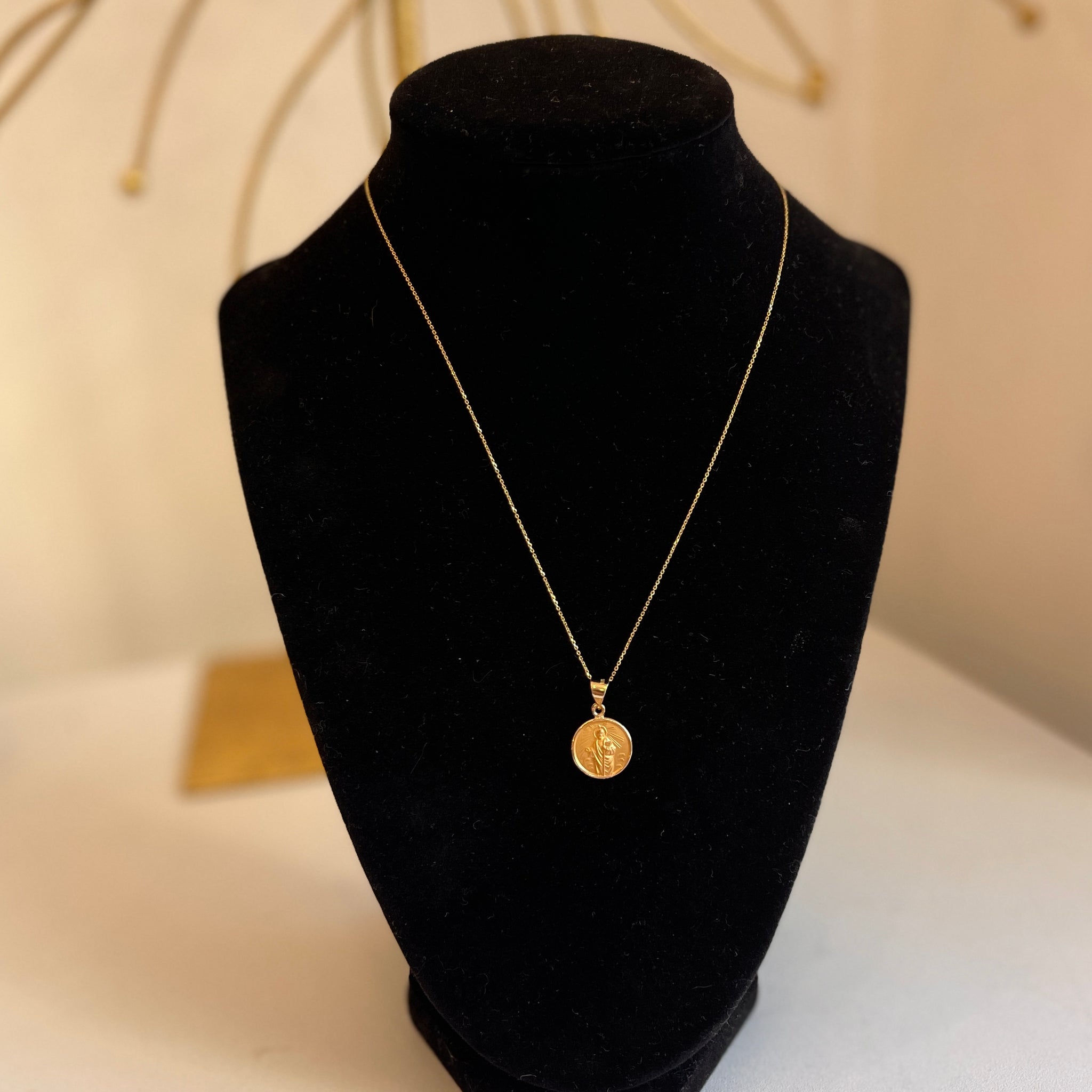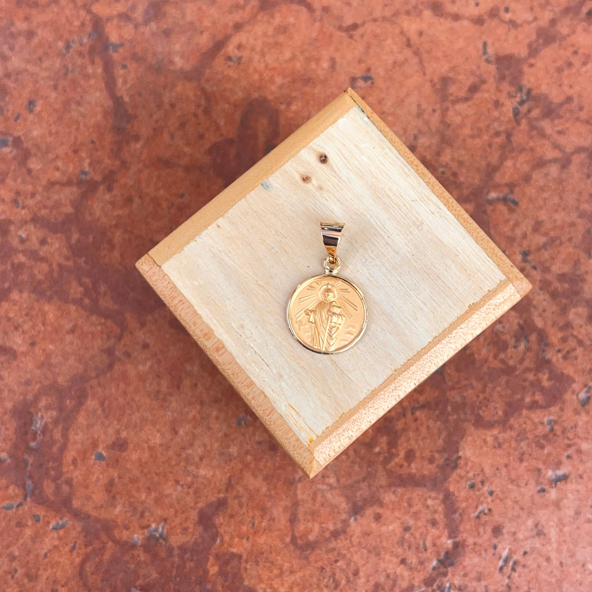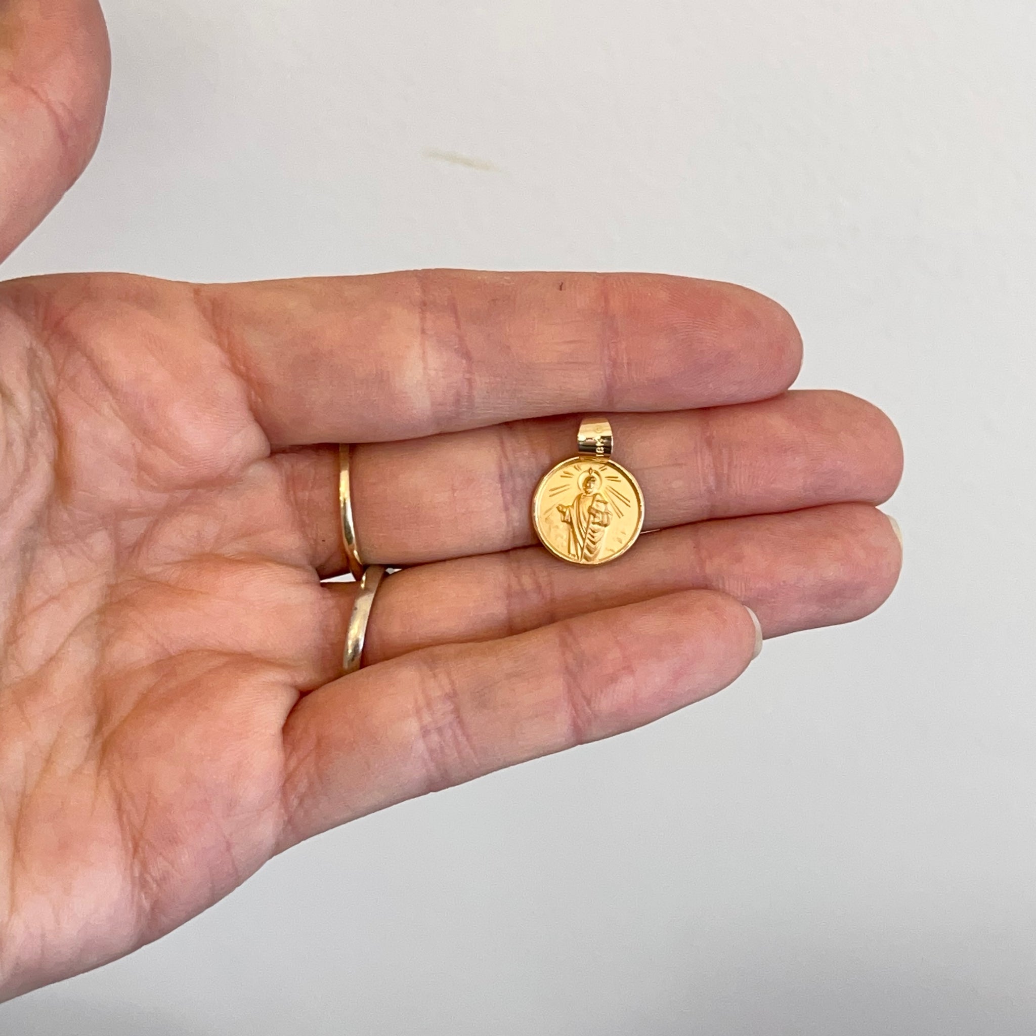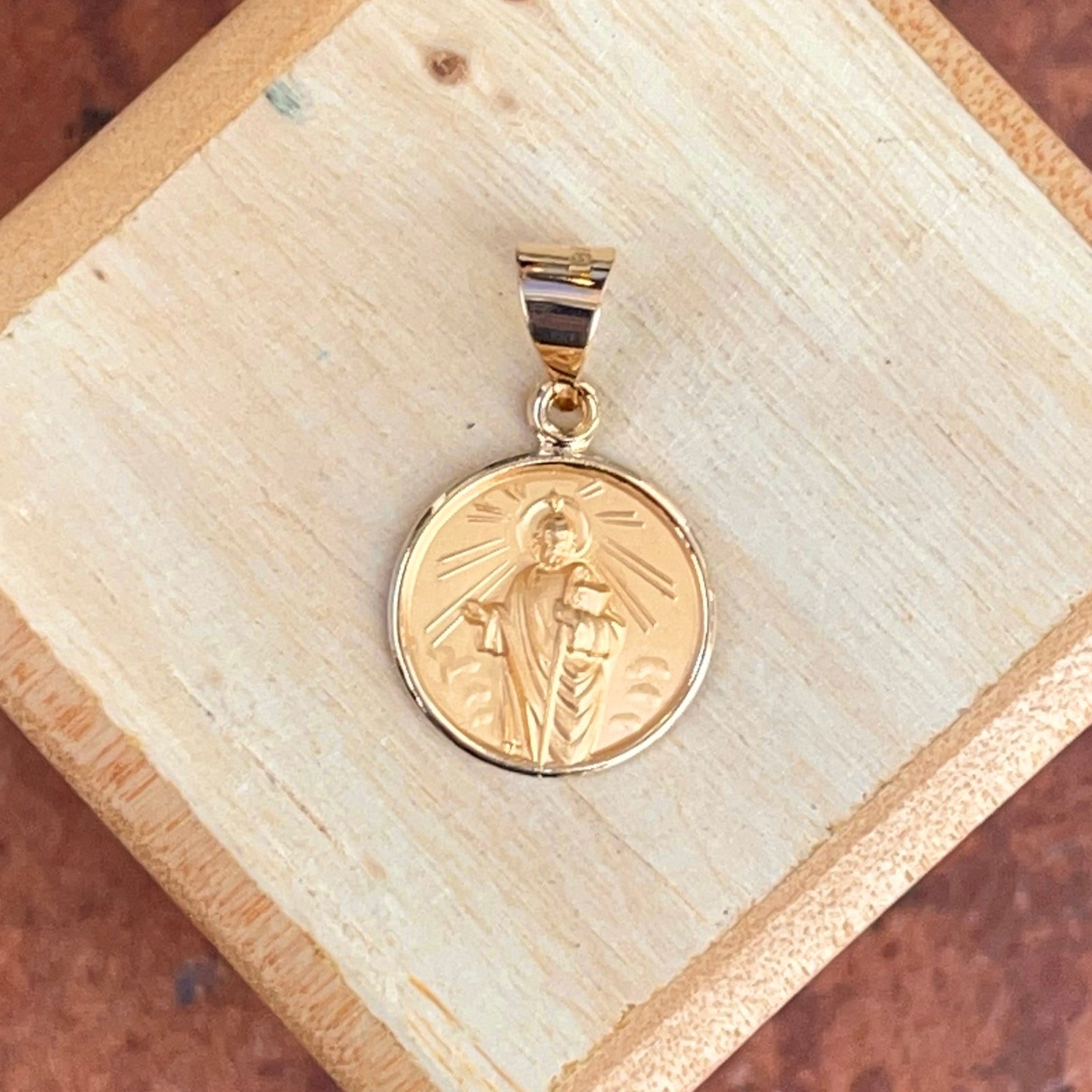 Satin-finished 18KT yellow gold round Saint Jude Thaddeus medal pendant charm. St. Jude Thaddeus is the patron saint of lost causes. This makes a wonderful gift for a friend/family member. Or someone who needs to be reminded that there is hope!