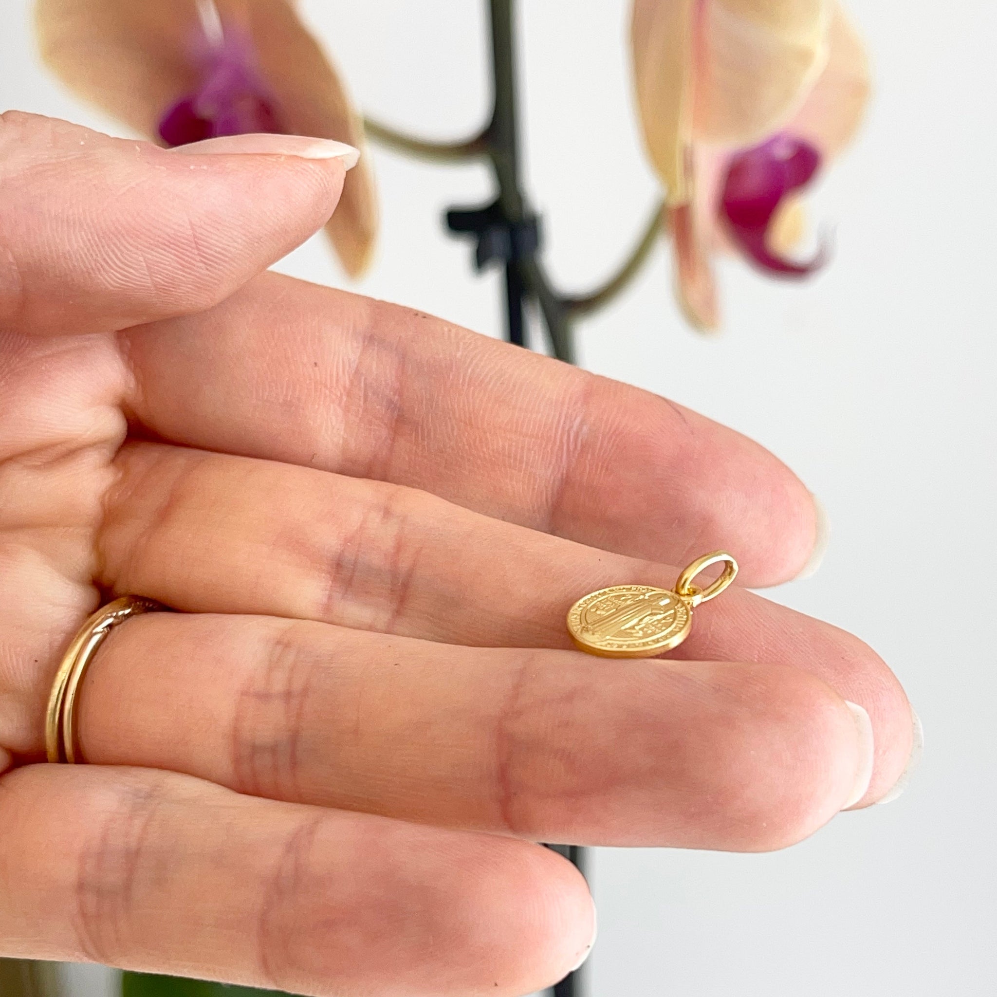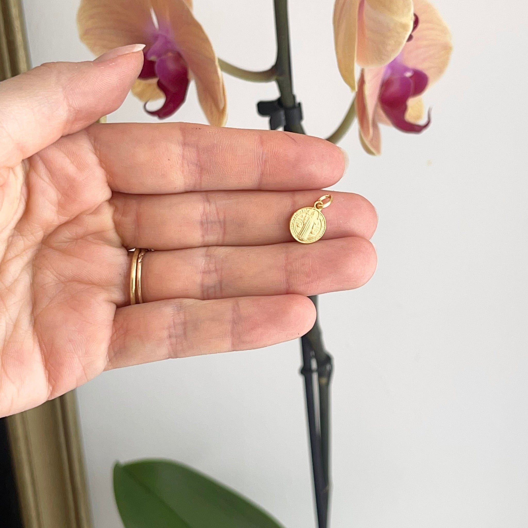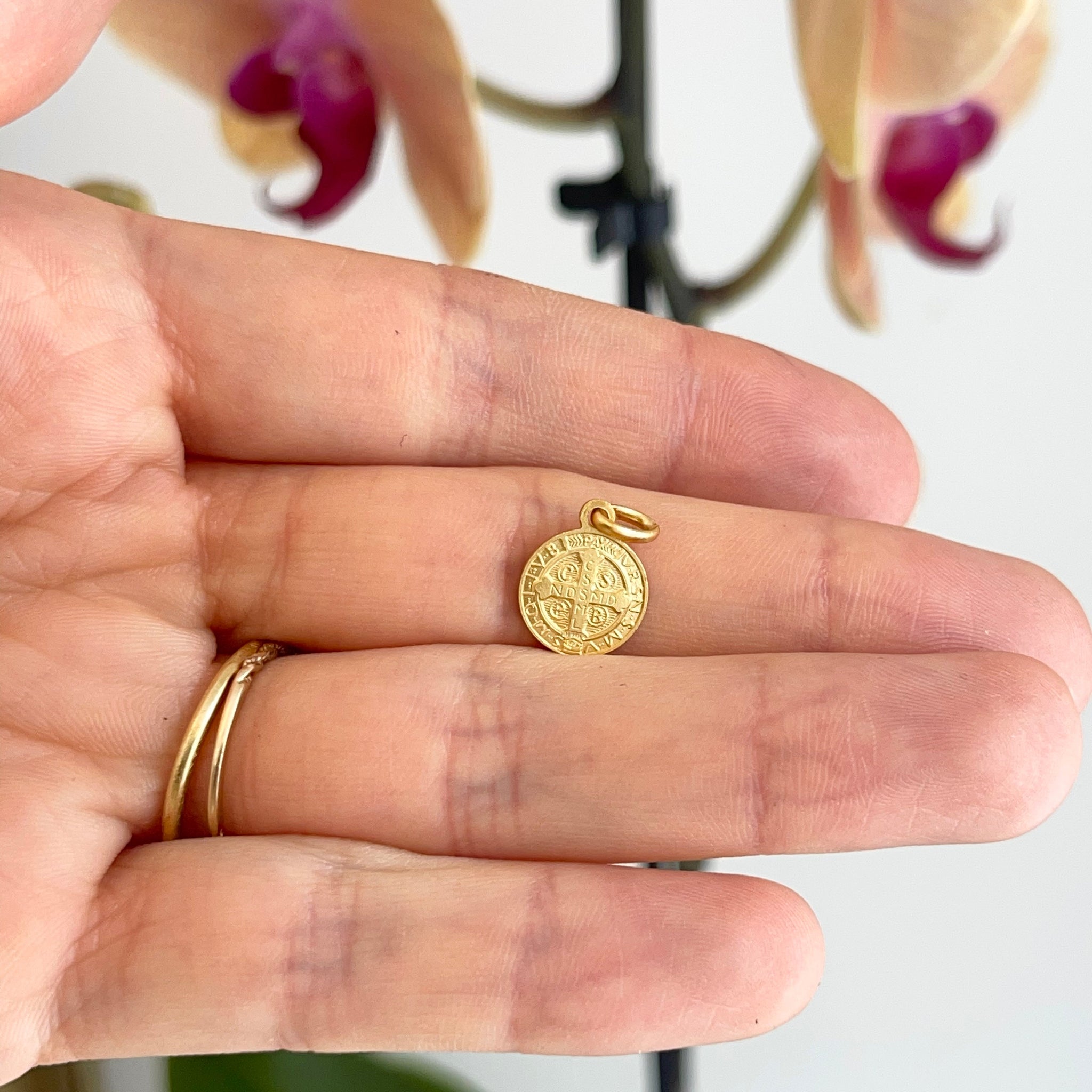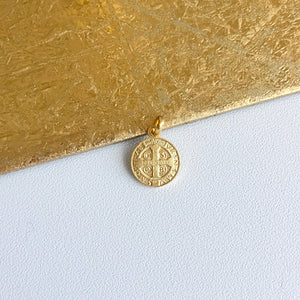 18KT yellow gold Saint Benedetto/ Benedict round medal pendant charm. St. Benedict is the patron saint of students, Europe, + agriculture workers. This medal makes a fantastic gift!