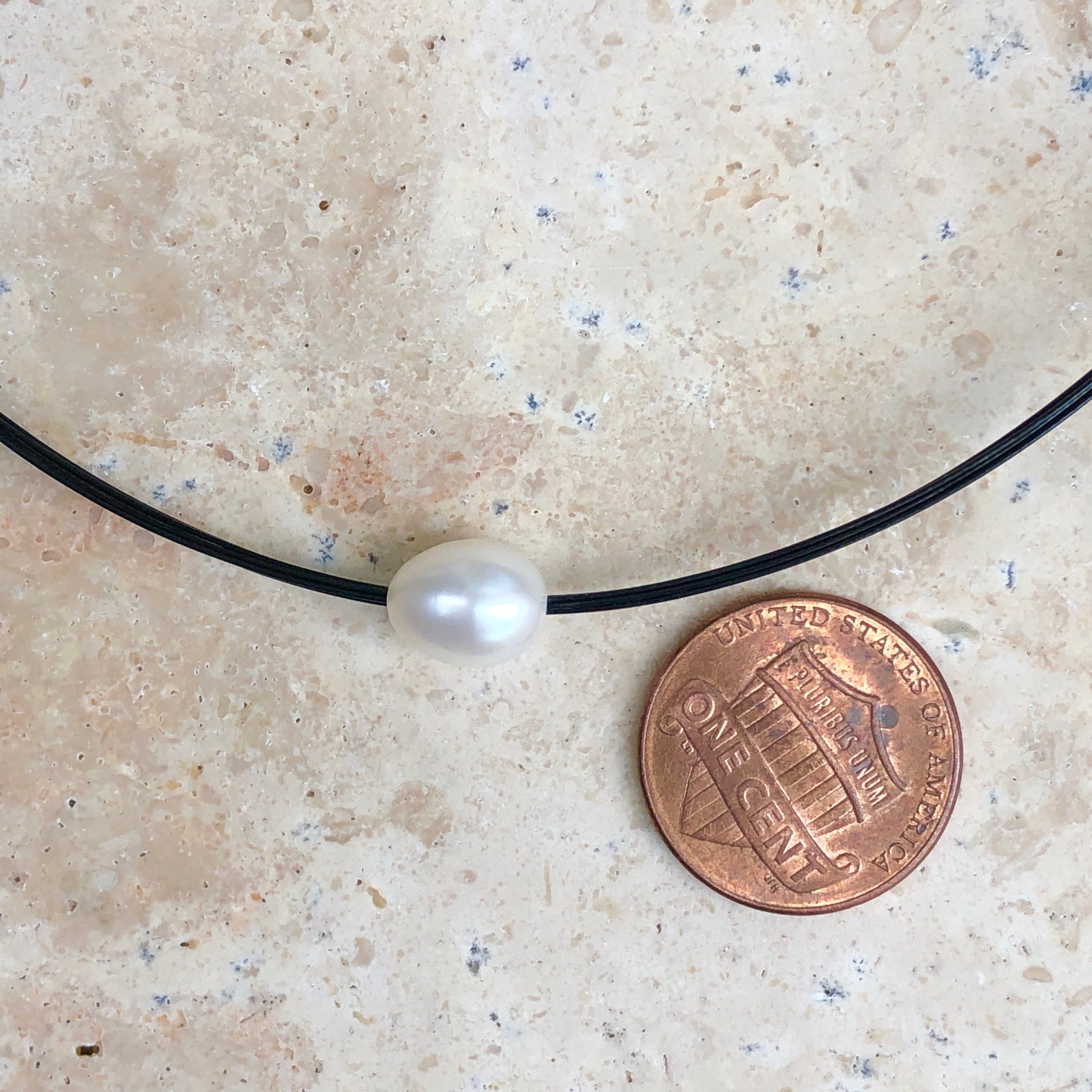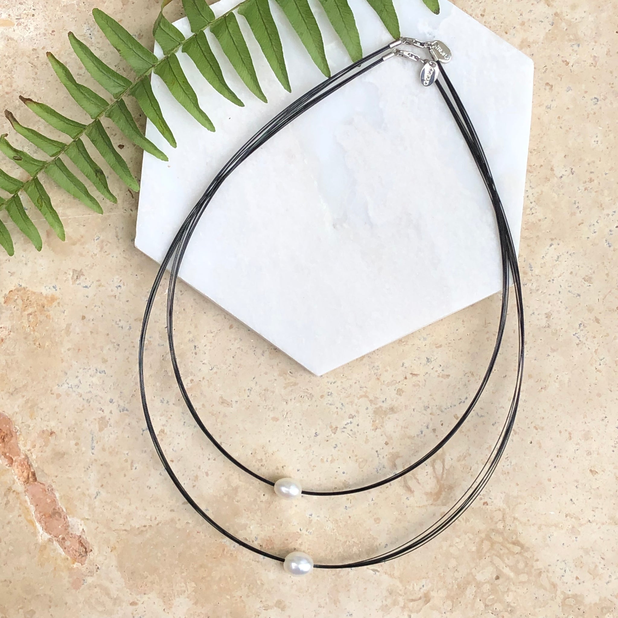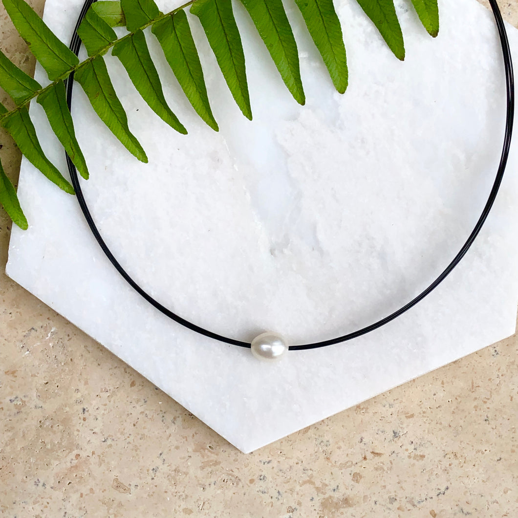 Stainless steel round, black-coated multi-wire necklace with genuine, cultured freshwater pearl.