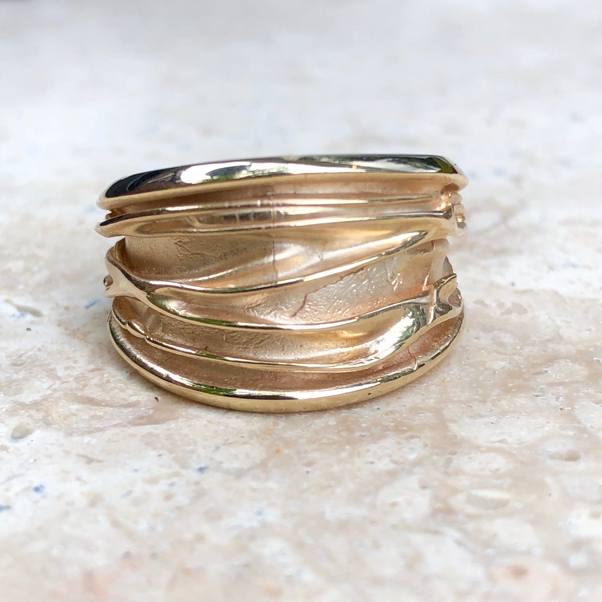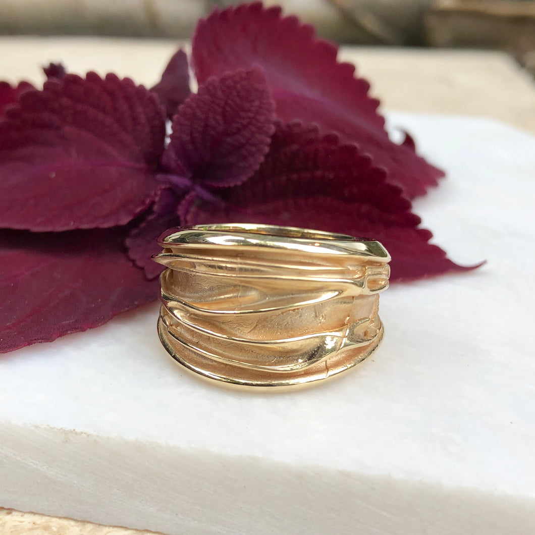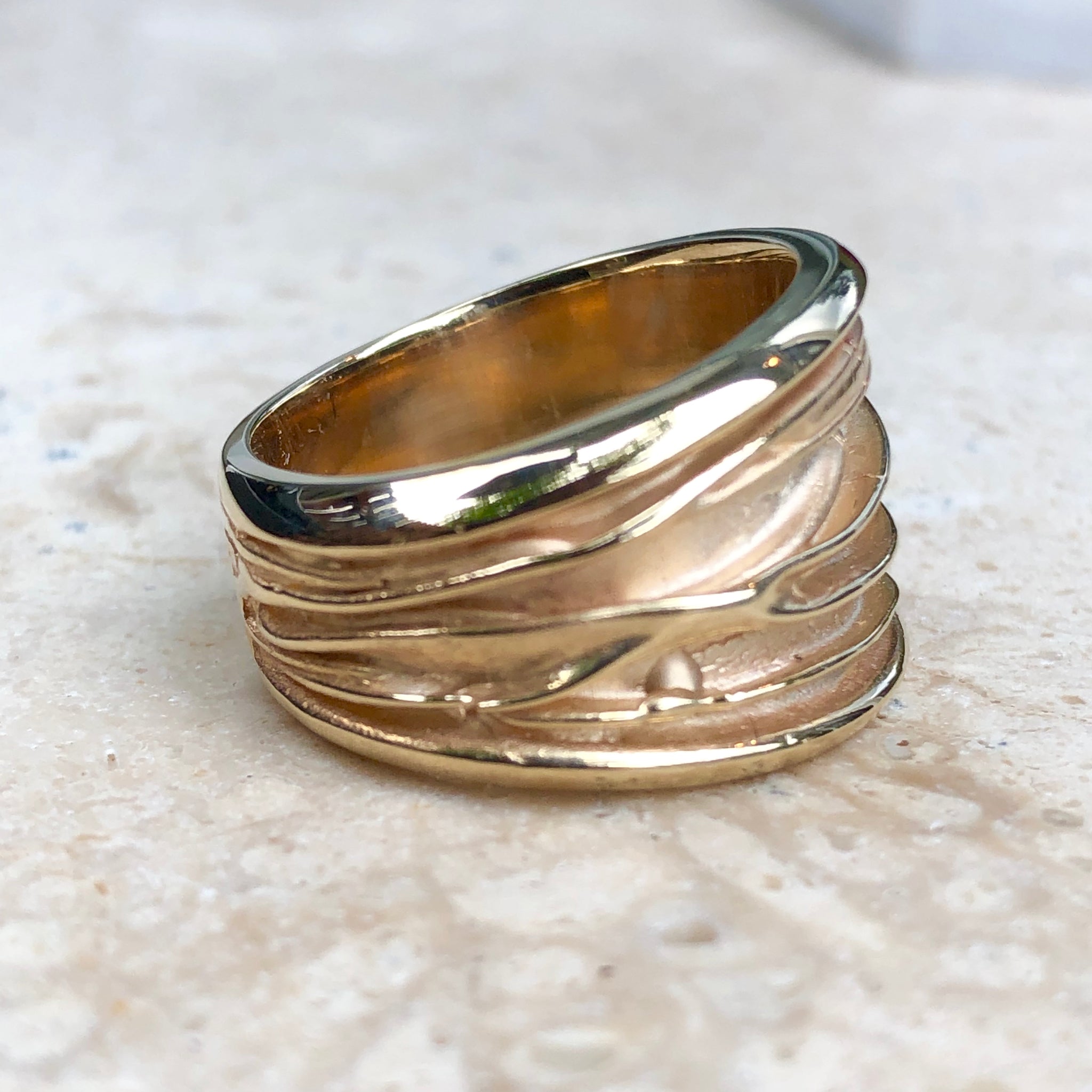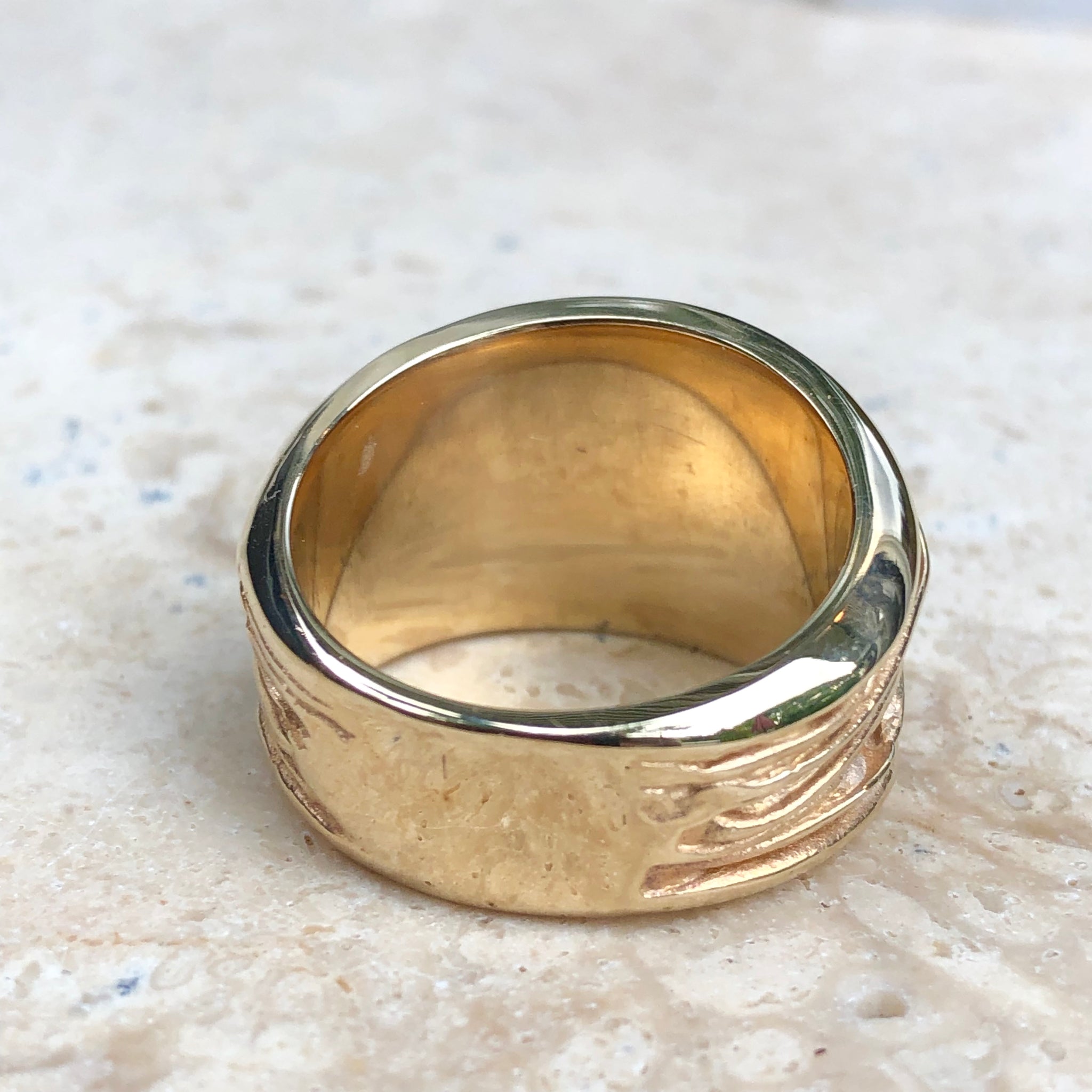 14KT Yellow Gold Wide Artistic Shiny Grooved Cigar Band Ring