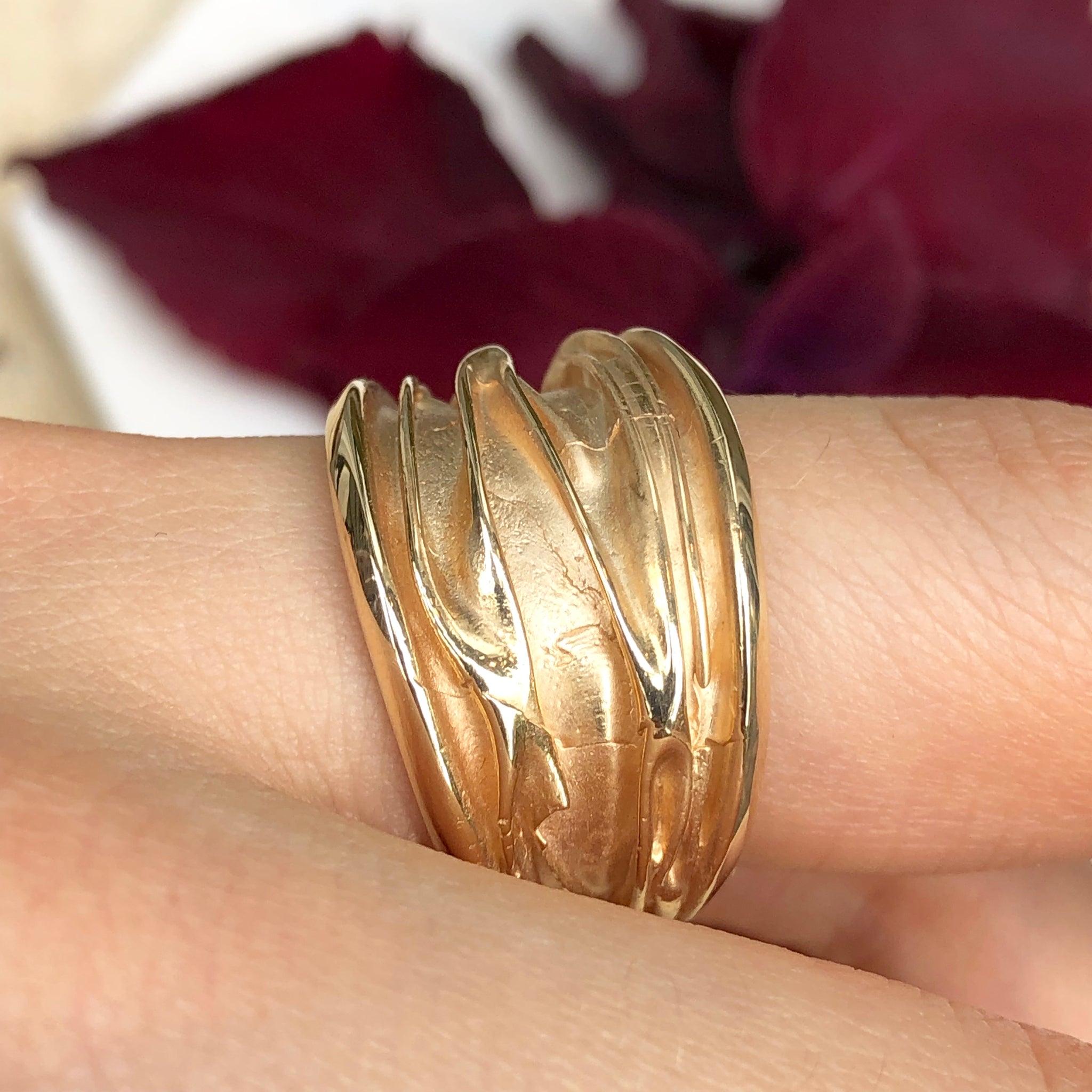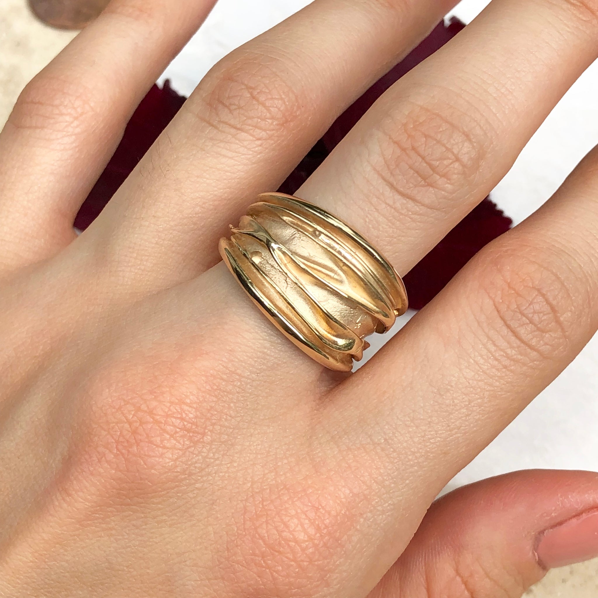 14KT yellow gold wide artistic, shiny grooved design cigar bad ring. Slightly tapers in back. Please note this ring runs small due to lack of tapering in back. You may want to go up a size.