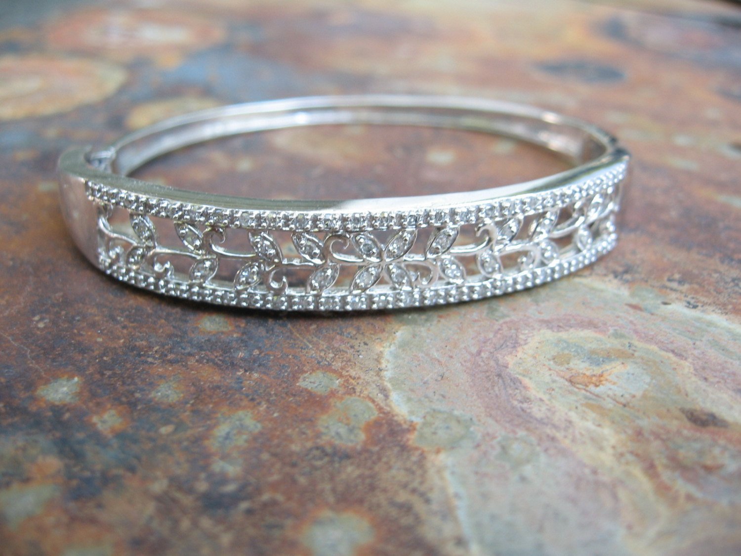 Estate 10KT white gold + pave diamond filigree design leaves bangle bracelet. Open hinge design with safety lock. Bracelet tapers in back. Not marked- however it has been tested + fully guaranteed to be 10 KT white gold.