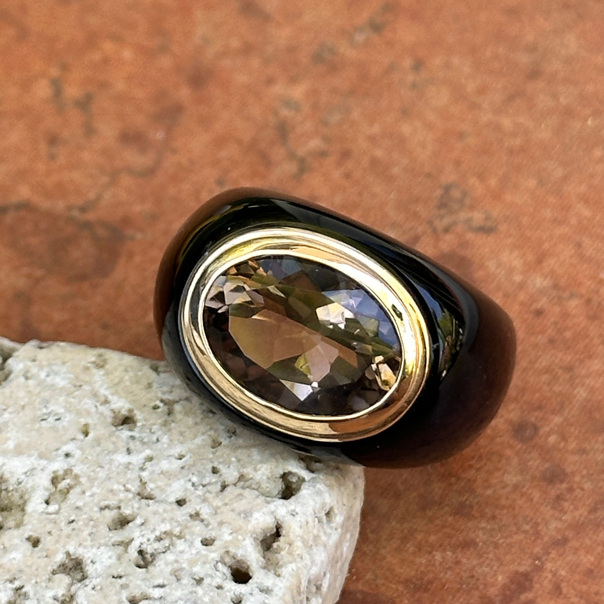 Estate 10KT Yellow Gold Black Onyx Rounded Band + Genuine Oval Smokey Quartz Bezel Set Ring