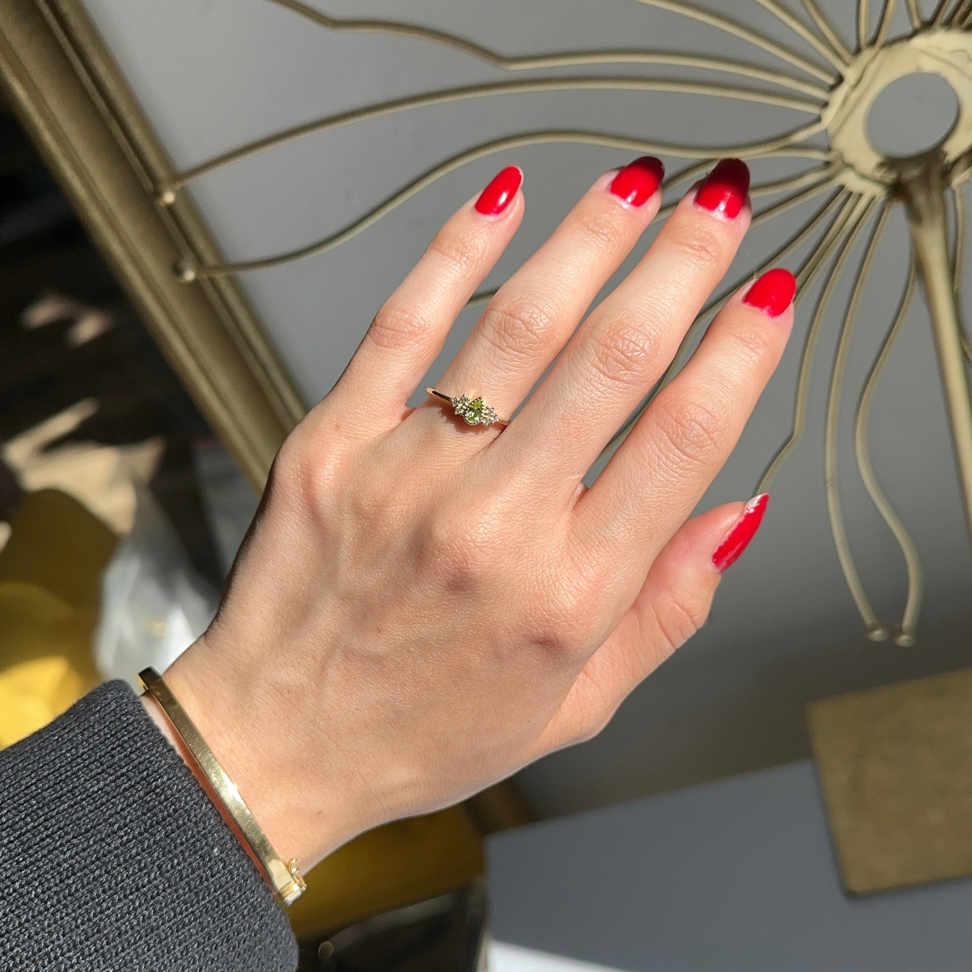 Estate/Vintage 10KT Yellow Gold Pear-Cut Green Peridot + Diamond Accent Ring