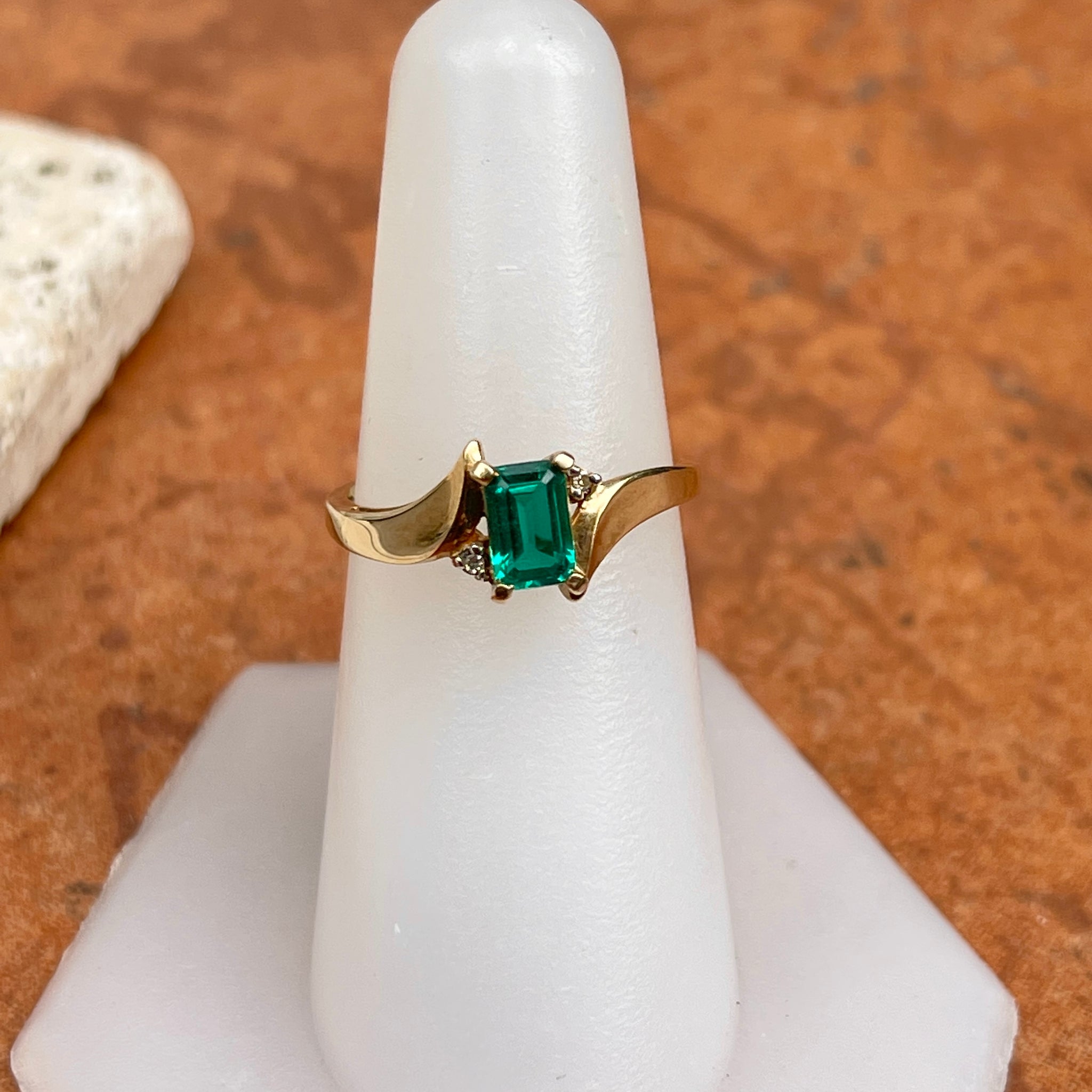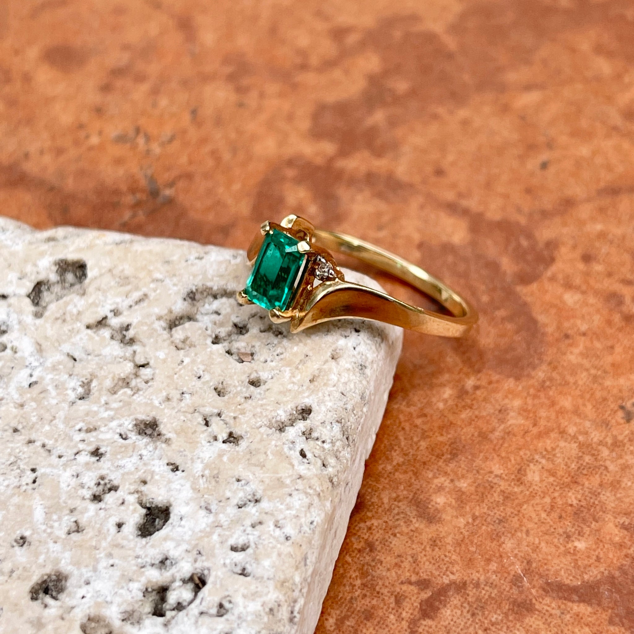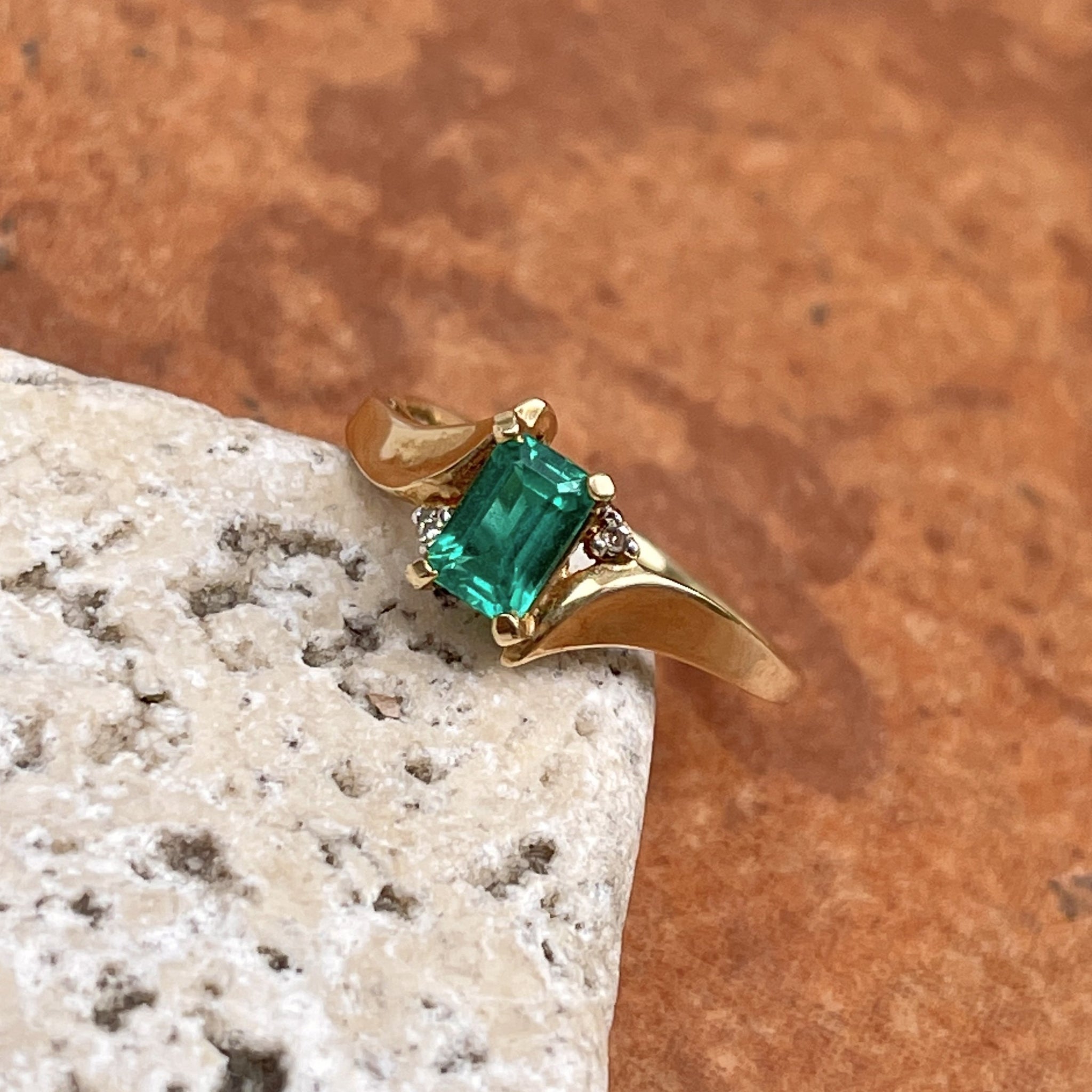 Estate 10KT Yellow Gold Rectangle Lab Emerald + Diamond Ring
