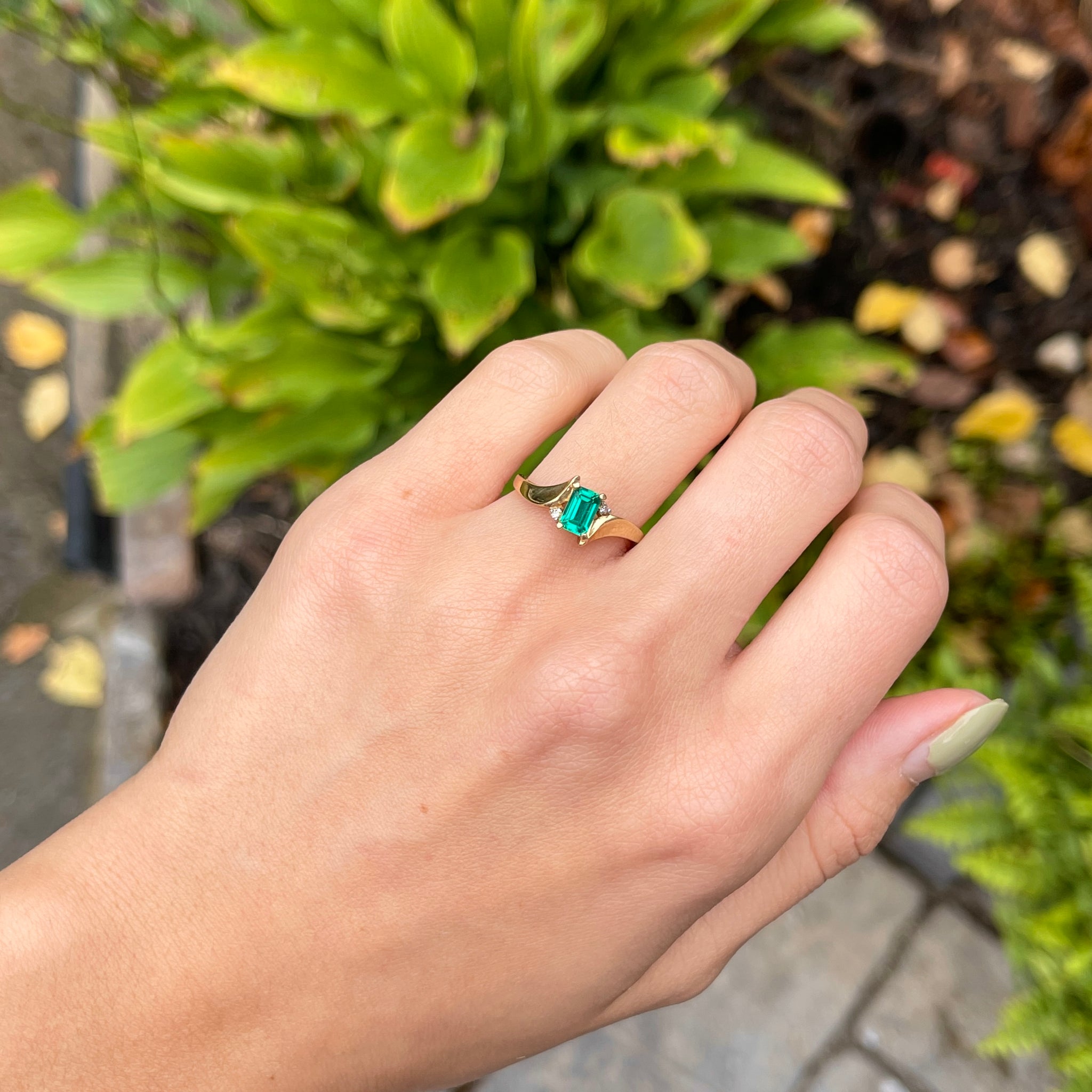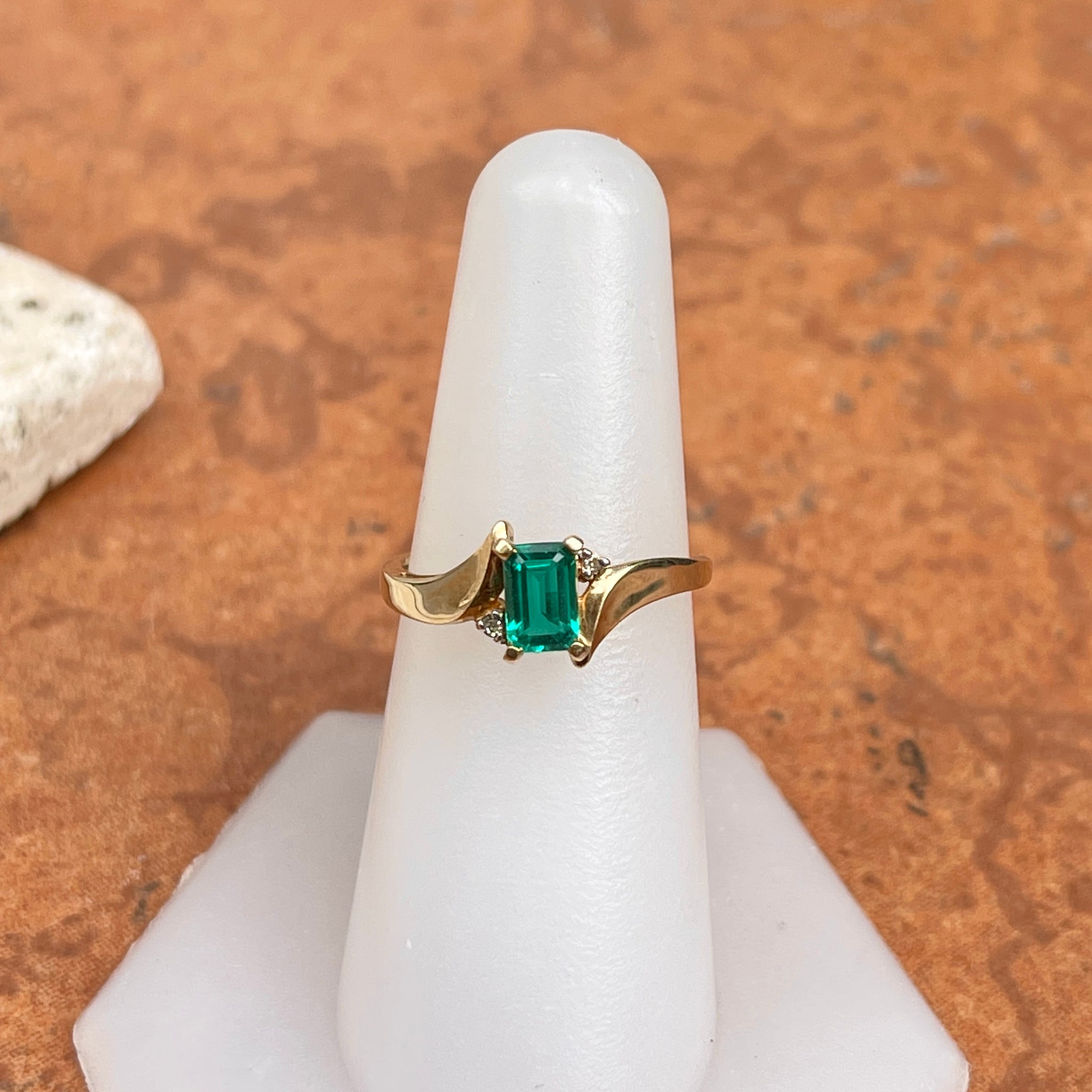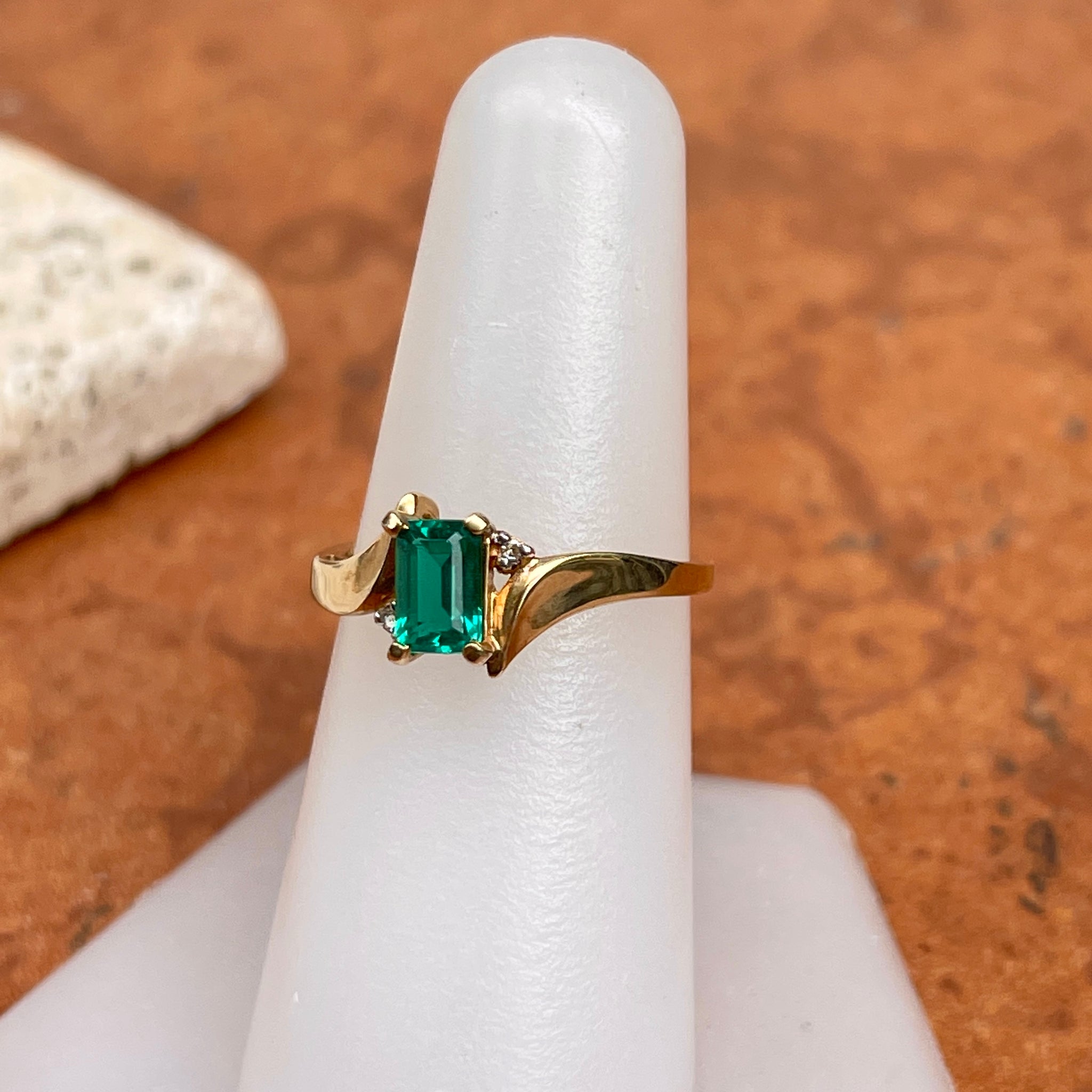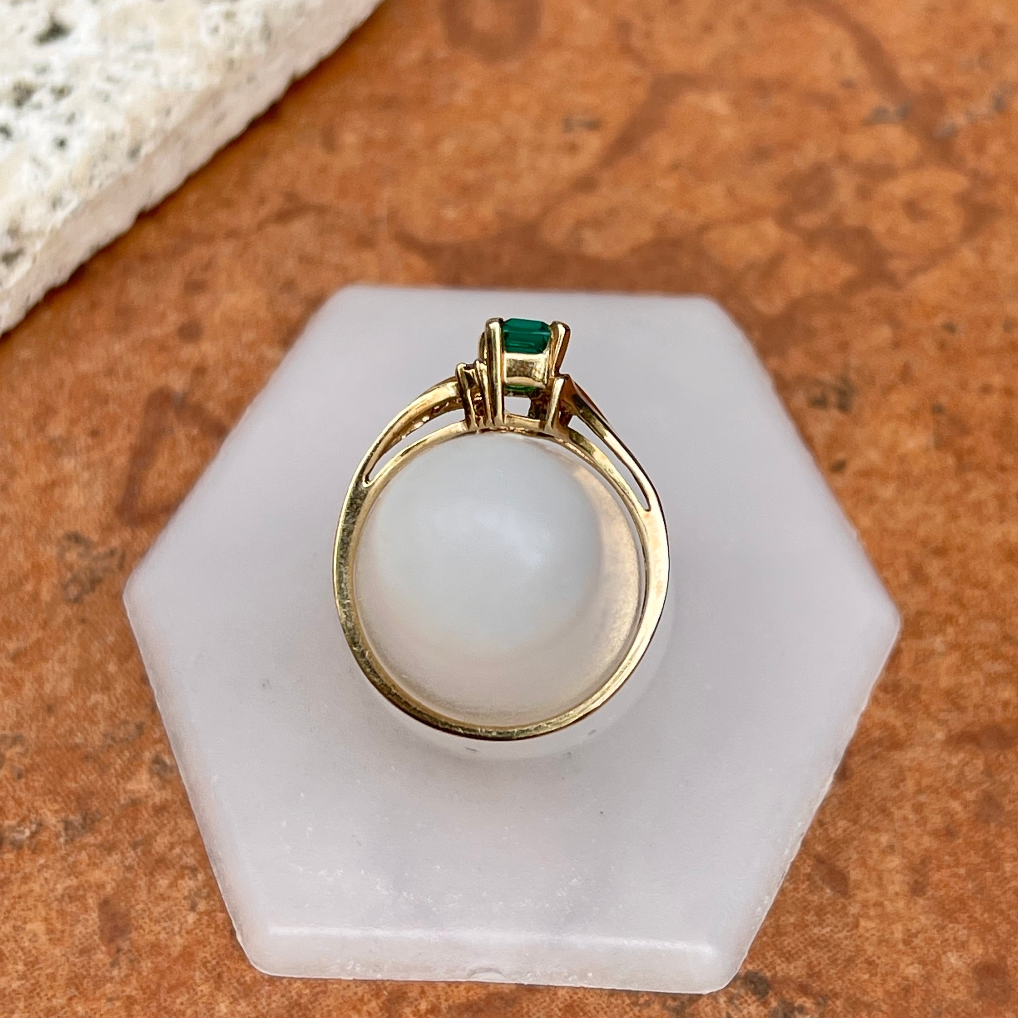 Estate 10KT Yellow Gold Rectangle Lab Emerald + Diamond Ring