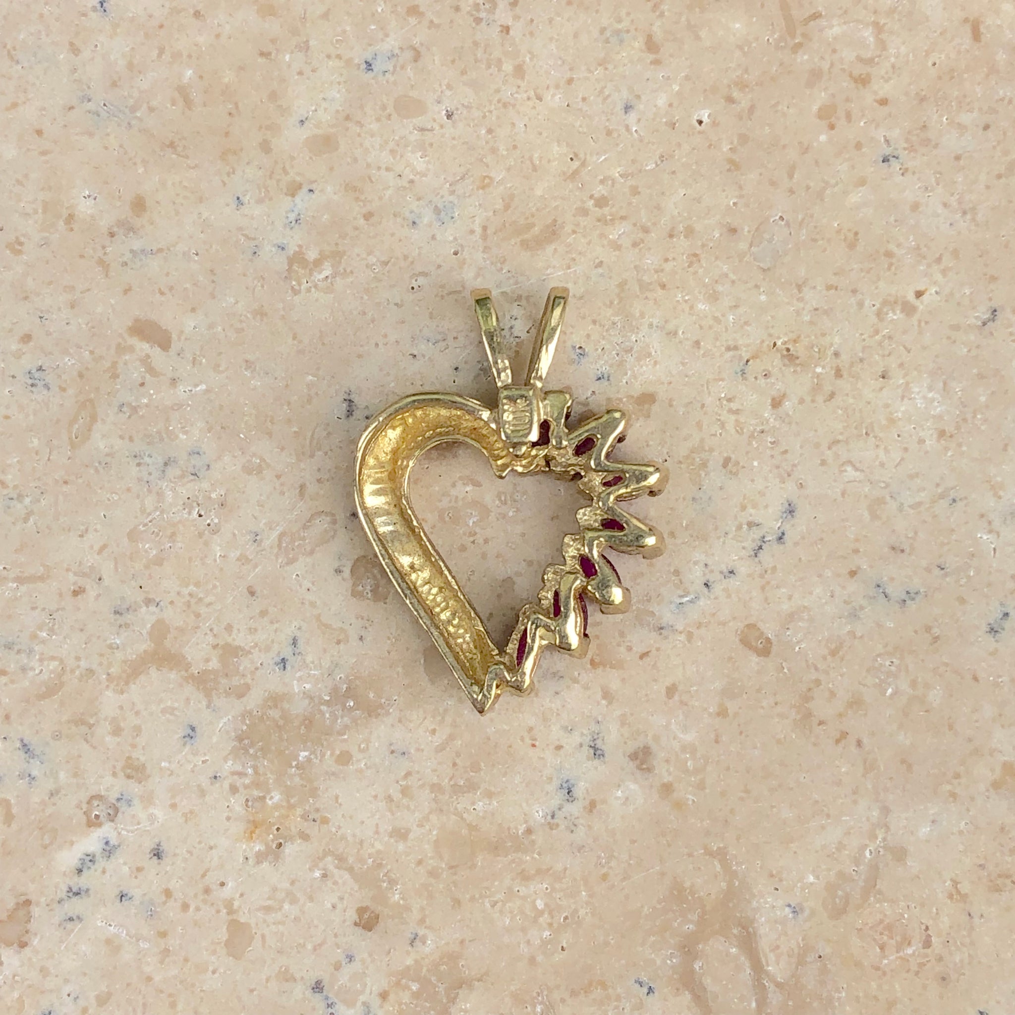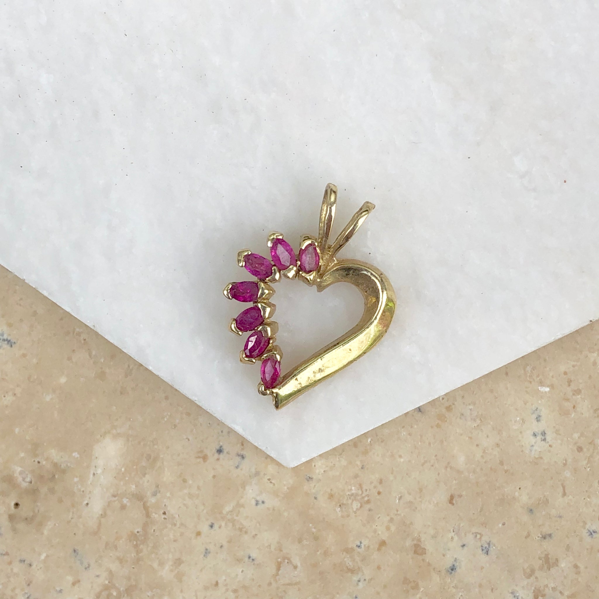 Estate 10KT yellow gold open heart pendant with beautiful rubies. Makes a fantastic gift for a loved one! Pair it with one of our yellow gold chains.