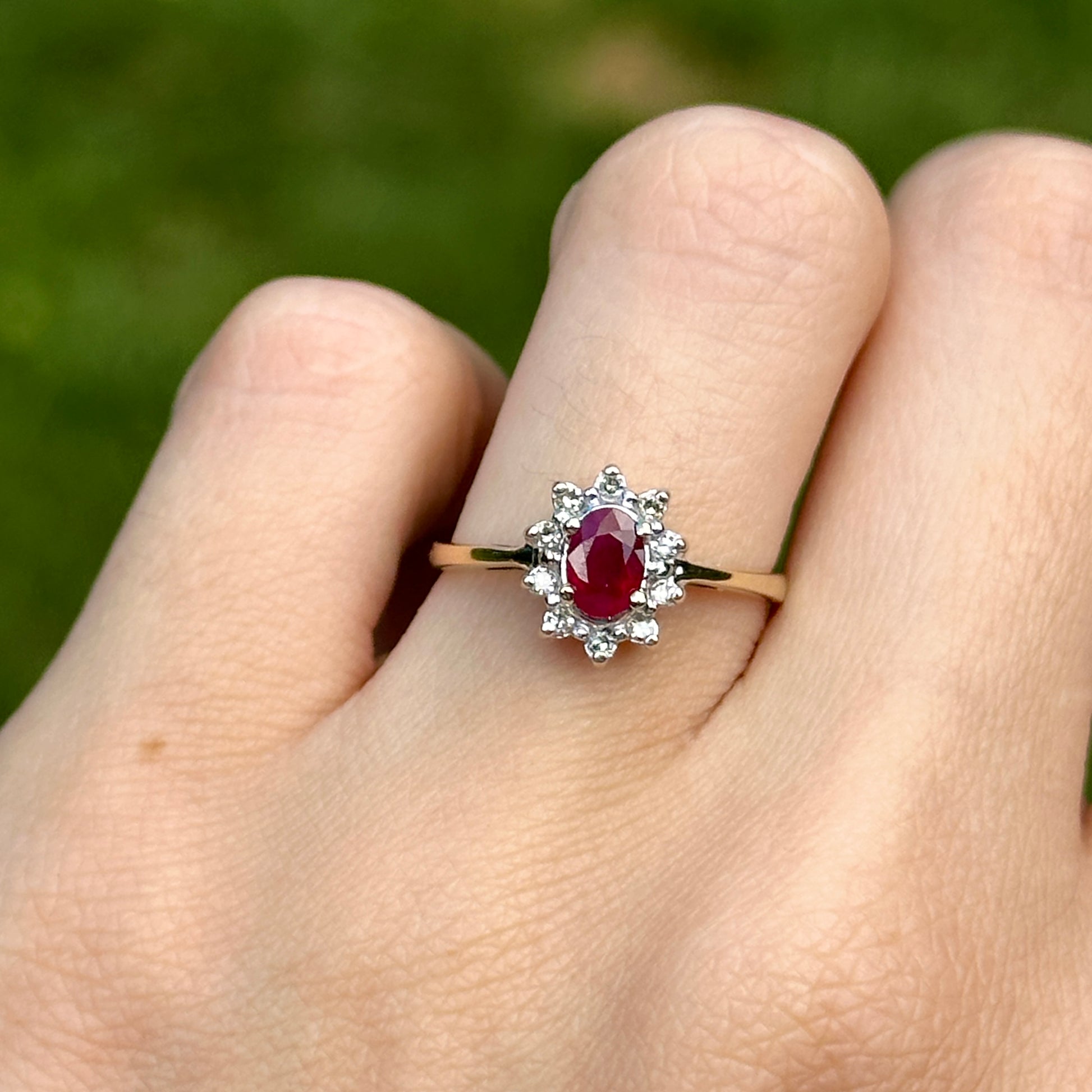 Estate 10KT Yellow + White Gold Oval Ruby + Diamond Halo Ring