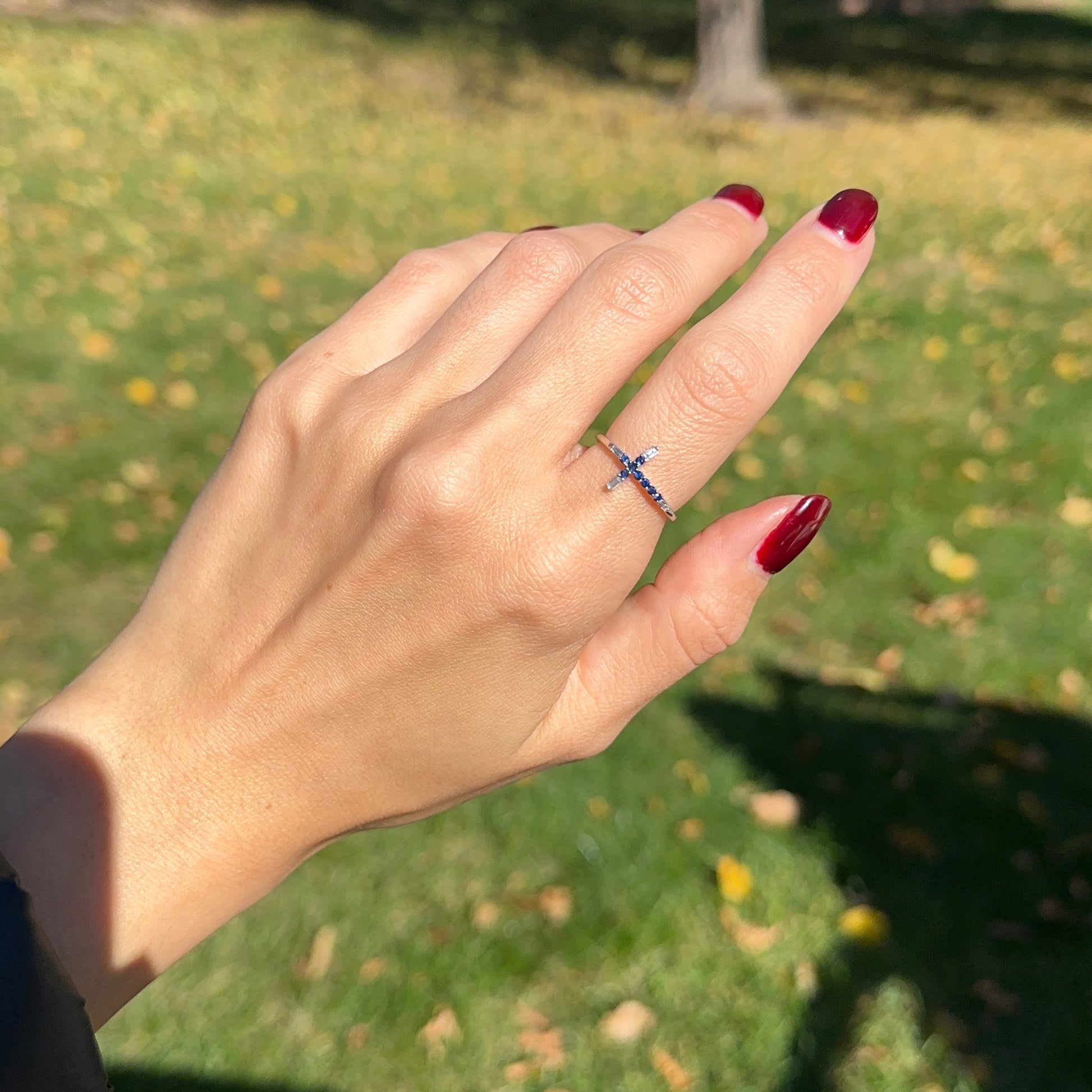 Estate 14K White Gold Sapphire and Diamond Sideways Cross Ring