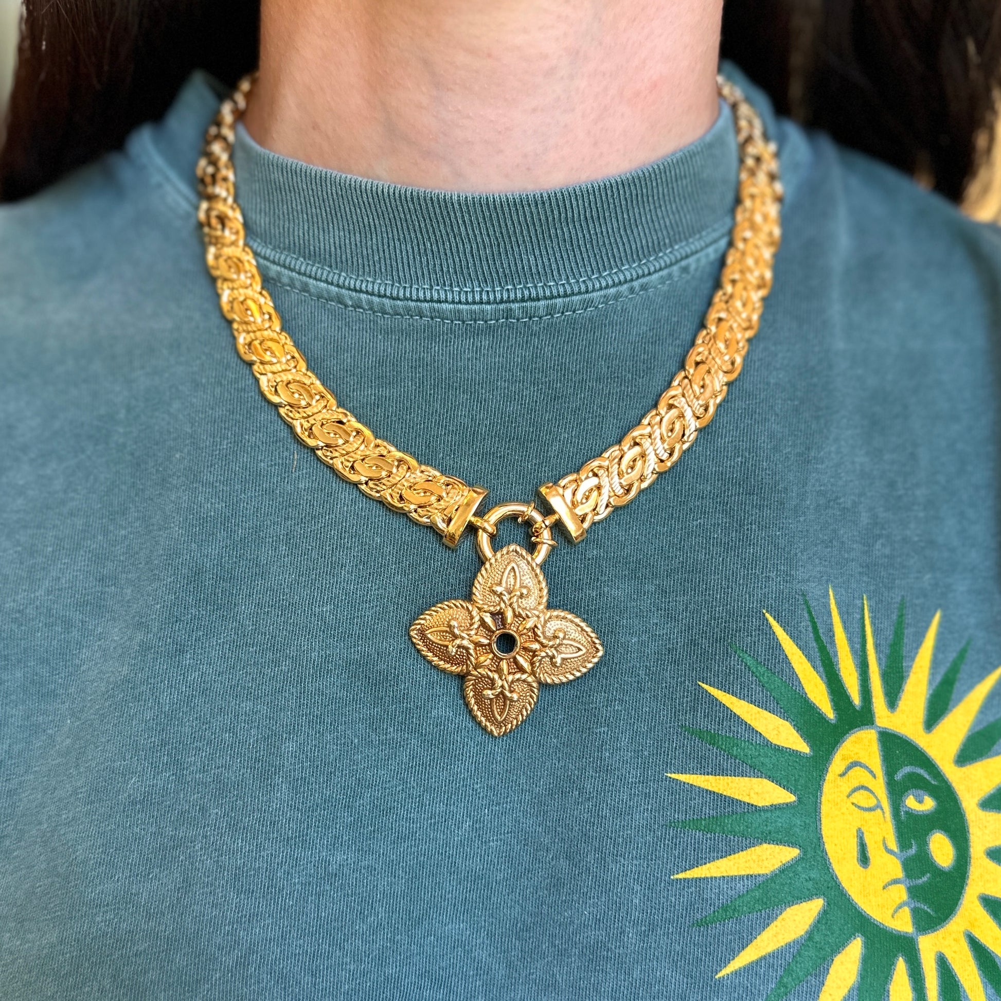 Estate 14KT Yellow Gold Cabochon Peridot Ornate Cross + Hidden Bail