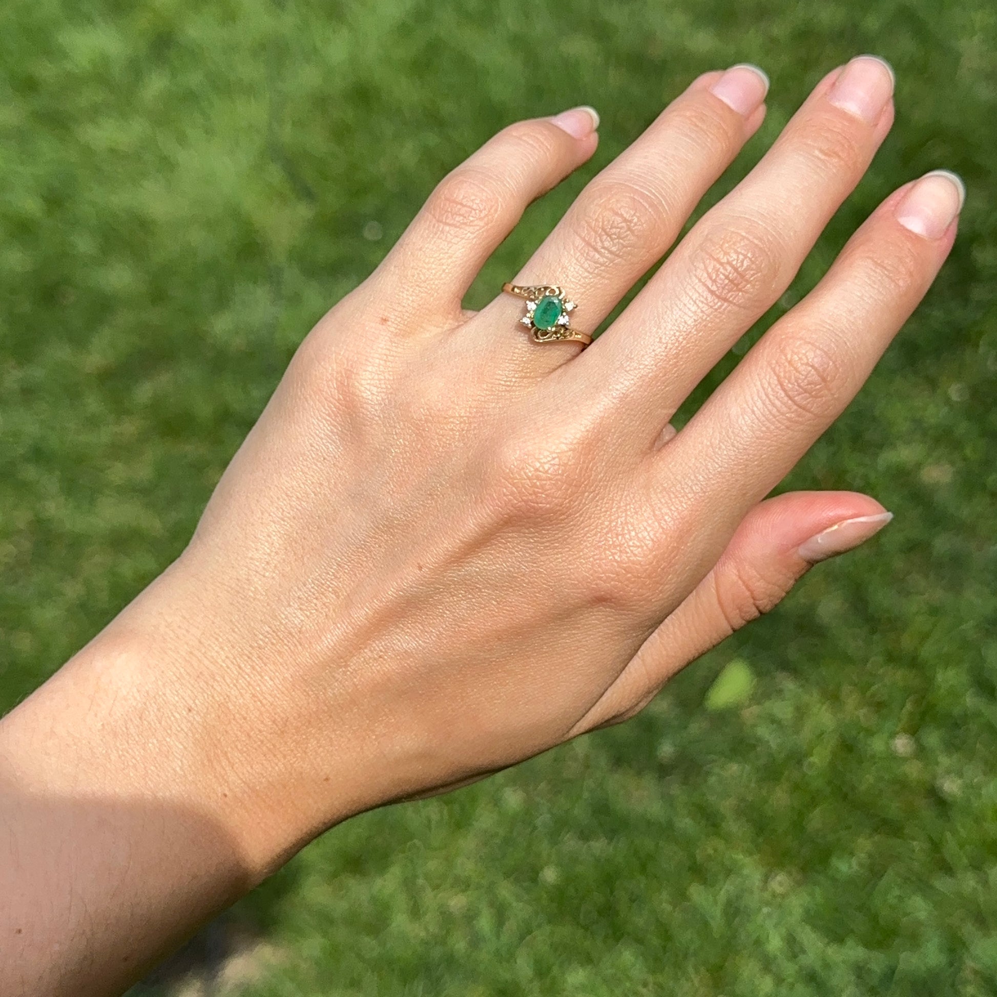 Estate 14KT Yellow Gold Oval Emerald + Round Diamond Ring