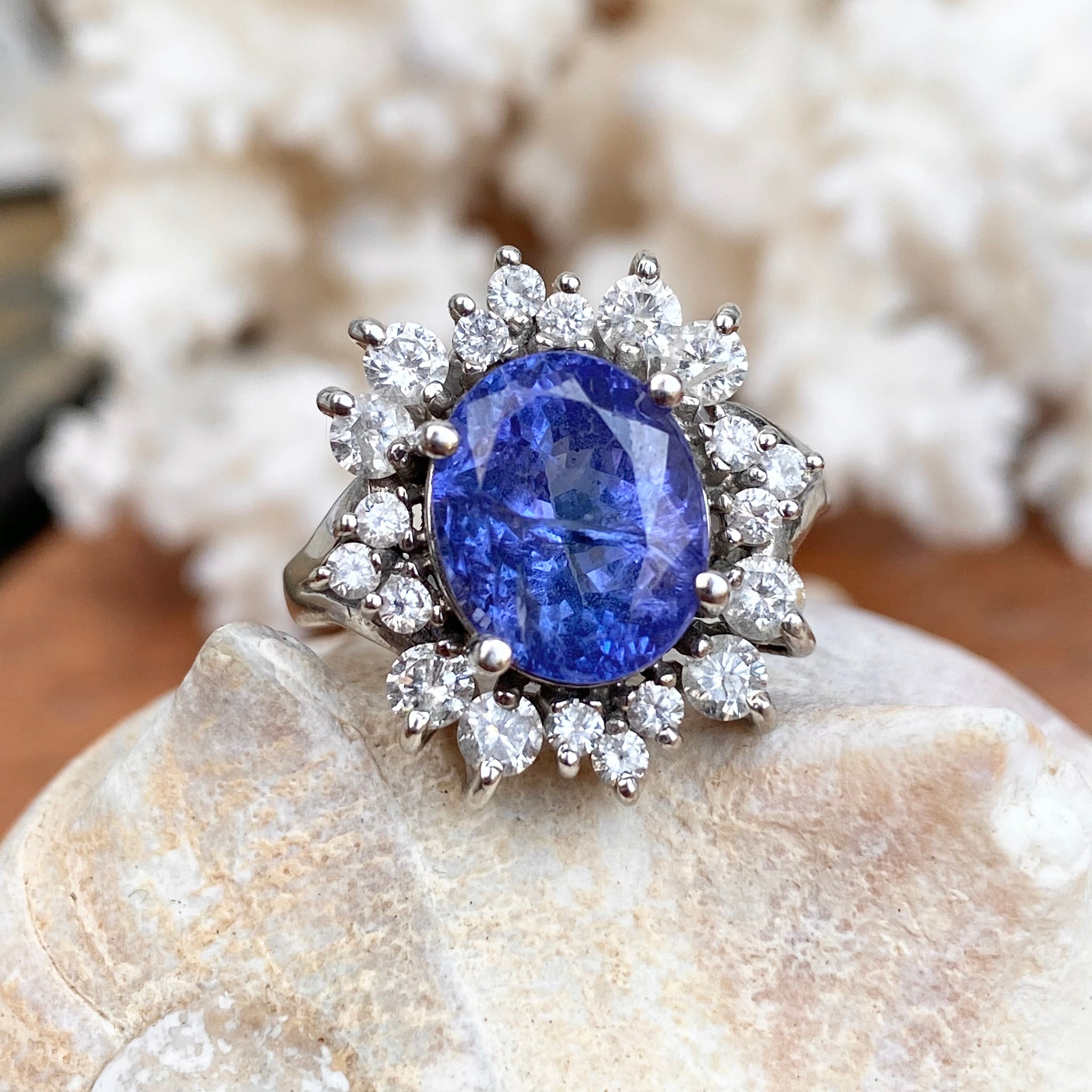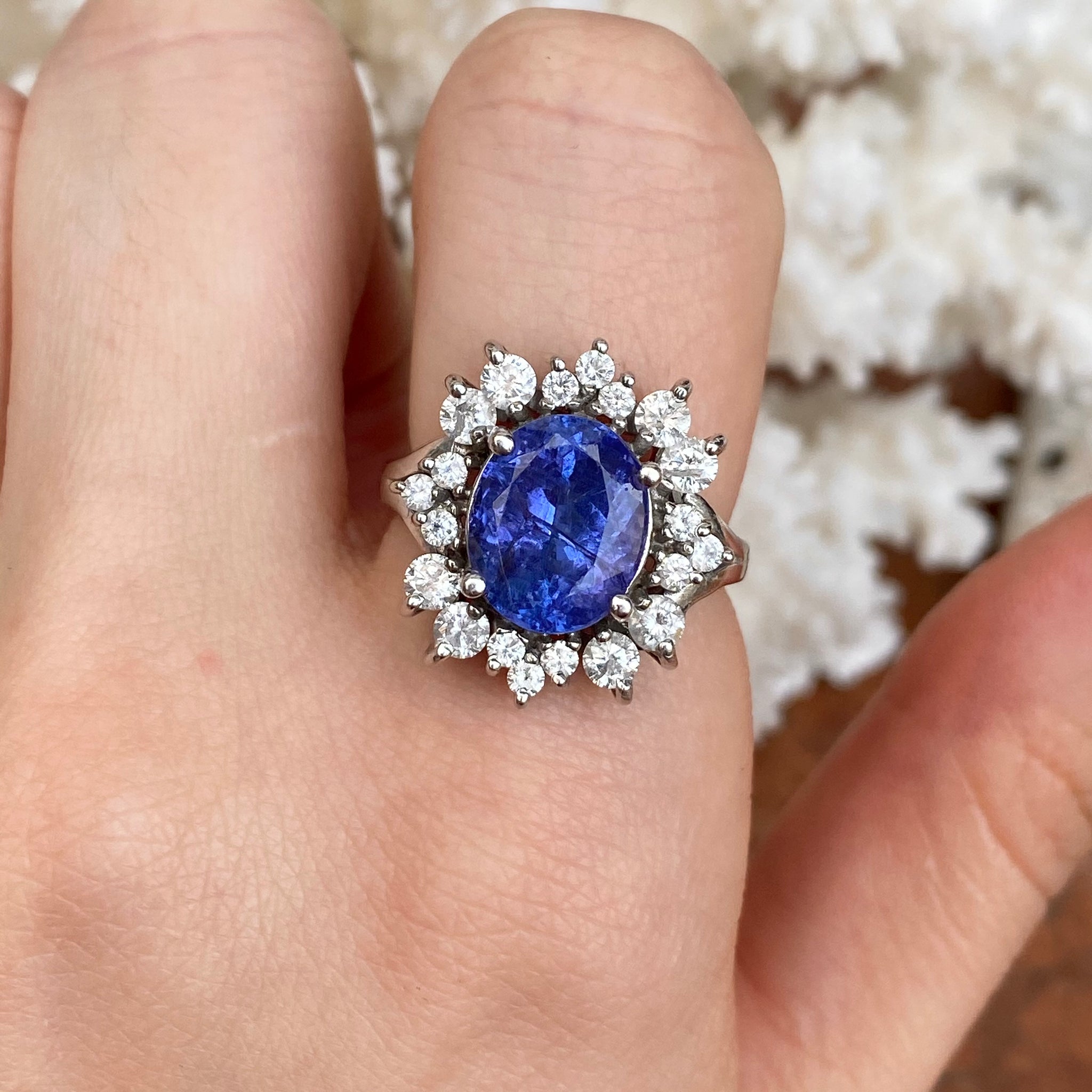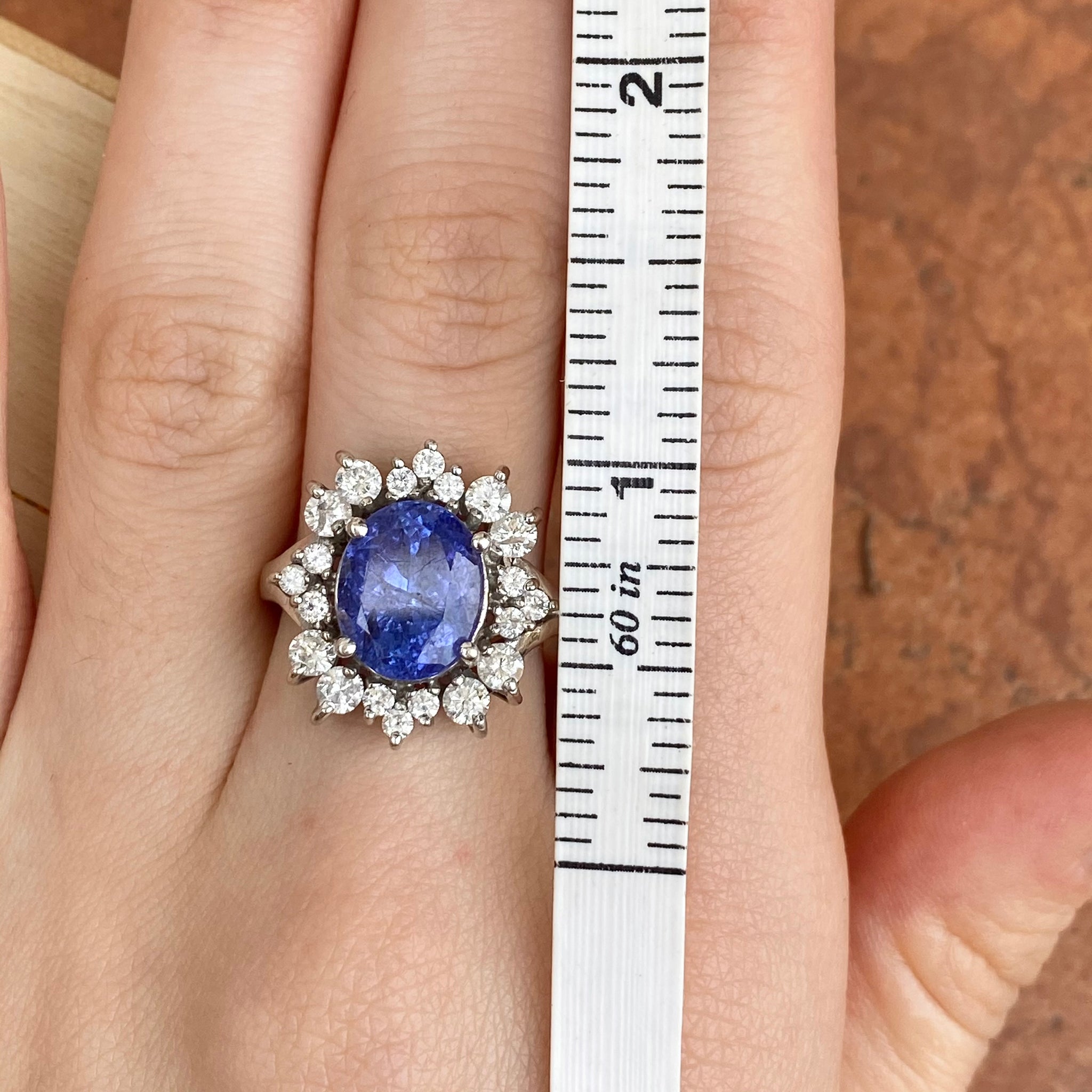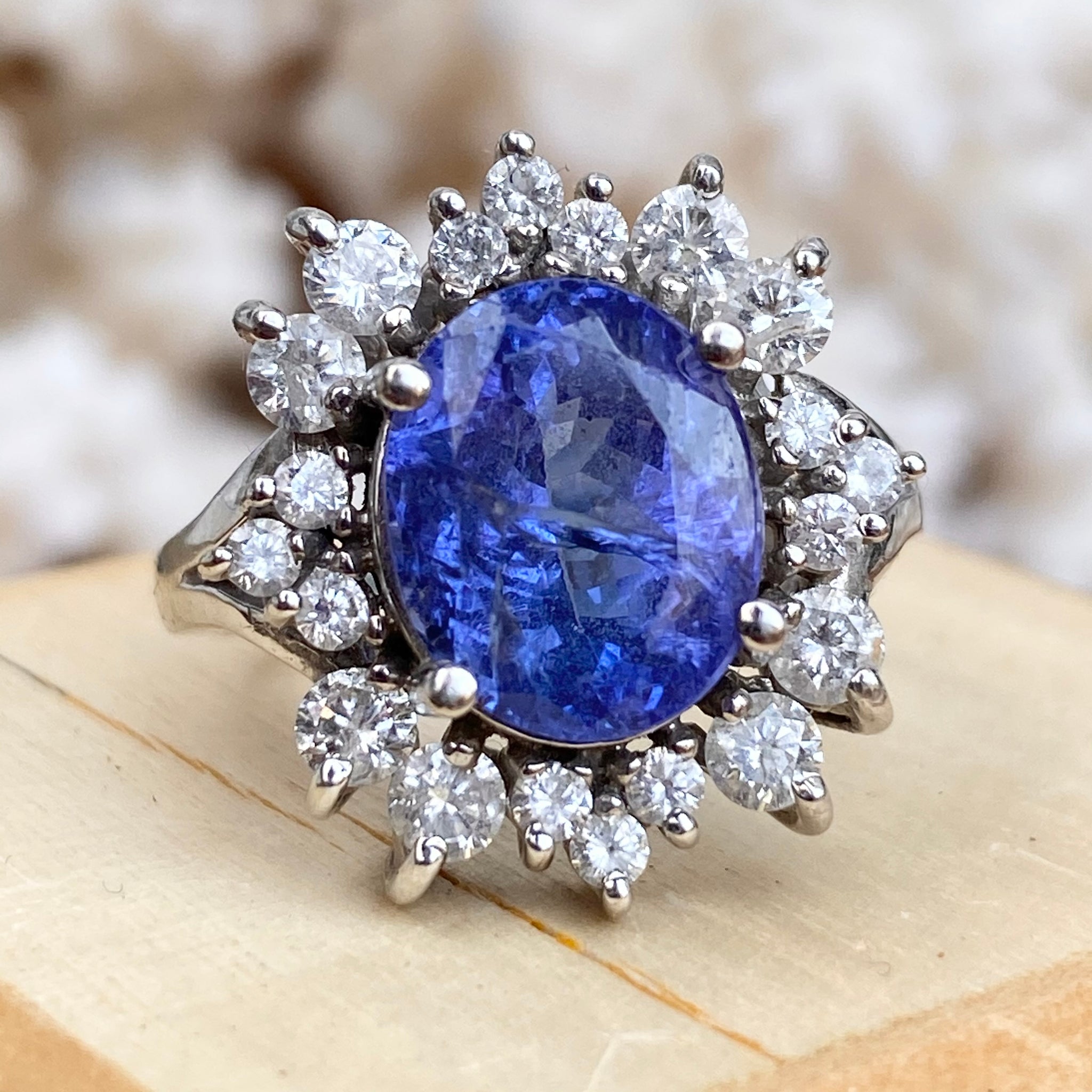 Estate 14KT White Gold Oval 4.5 CT Violet Tanzanite + Halo Diamond Ring