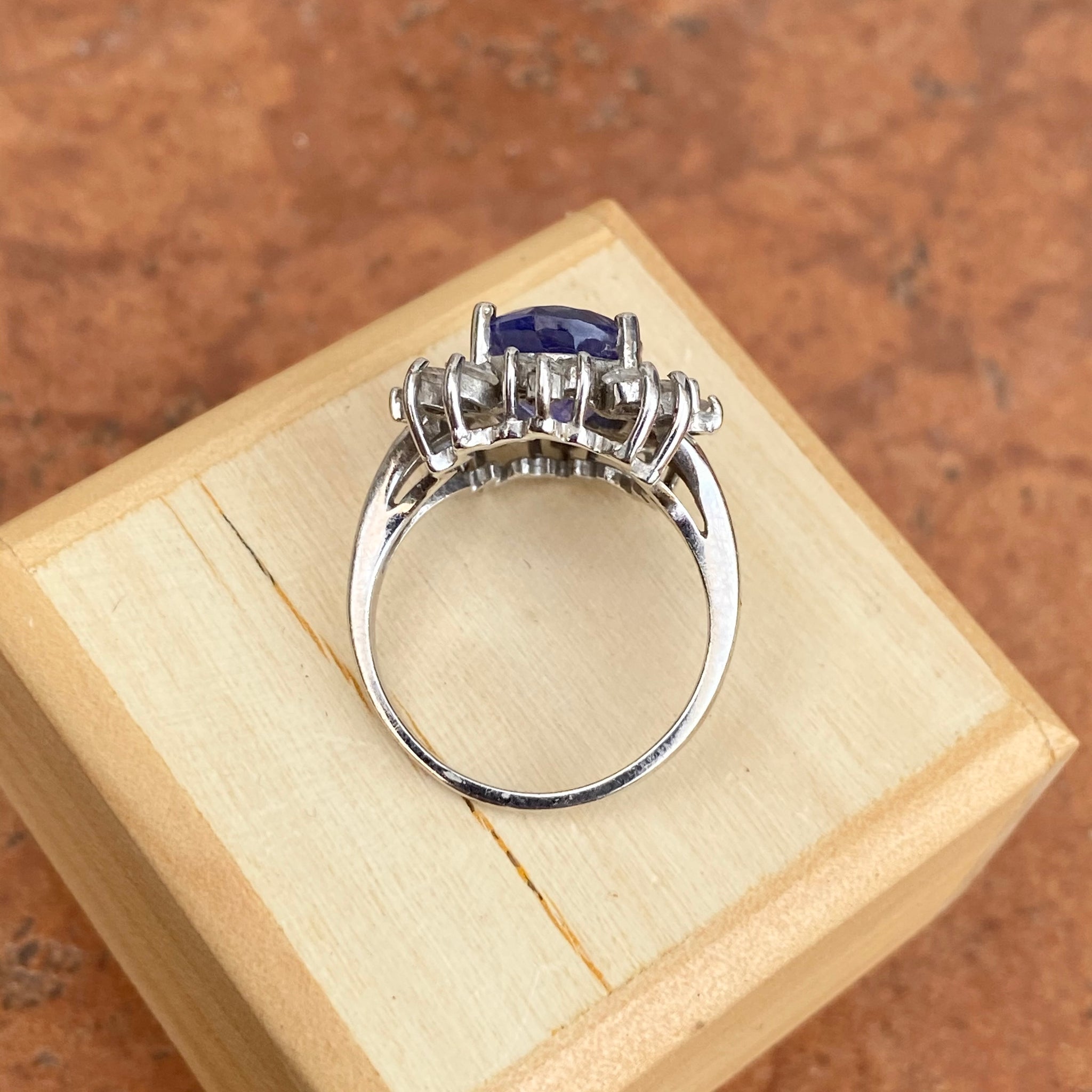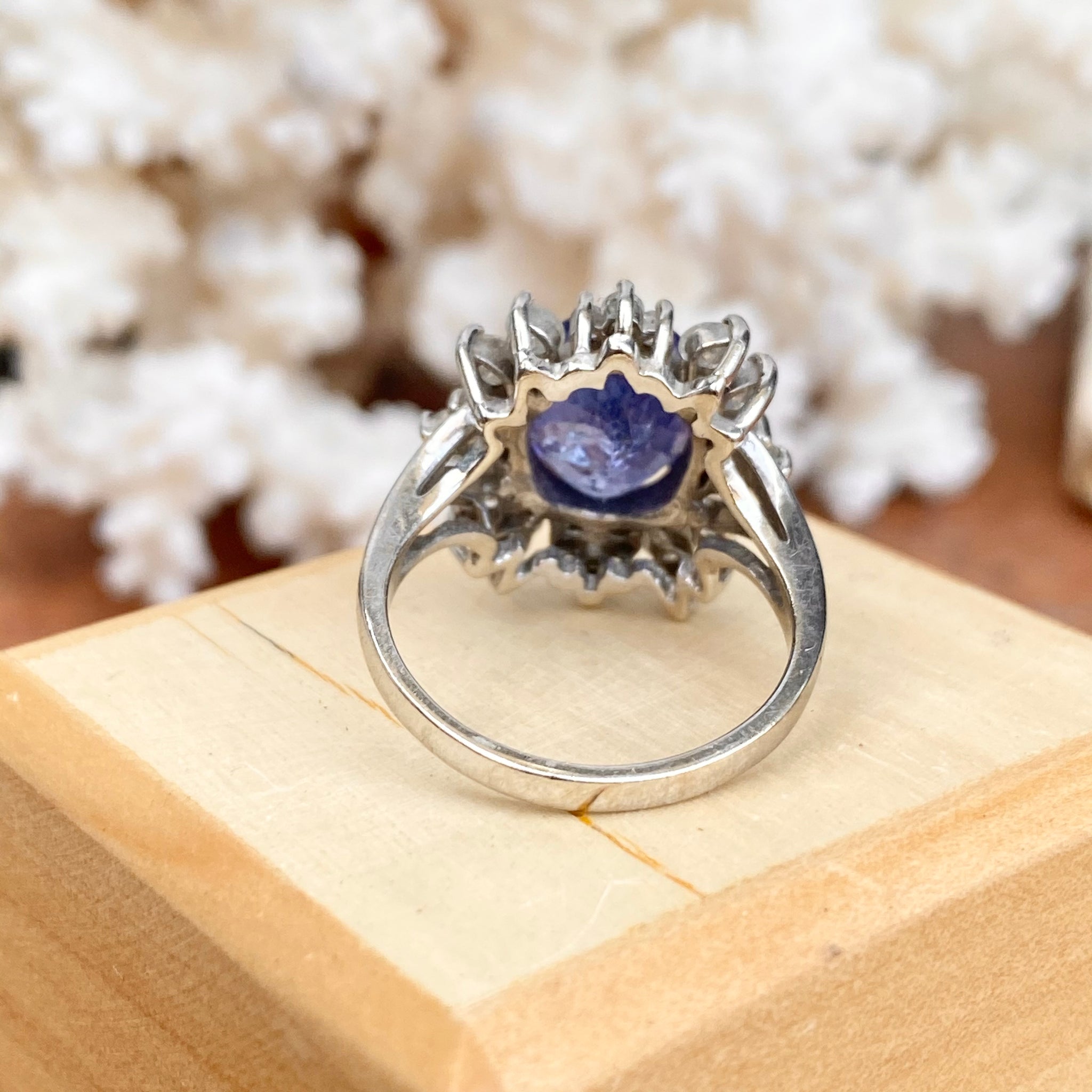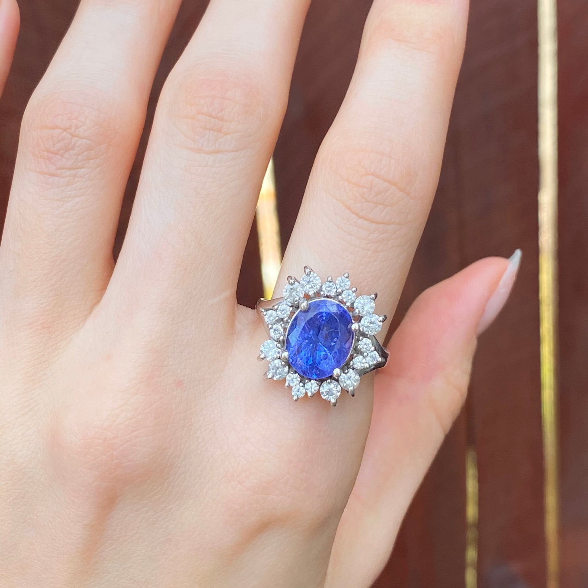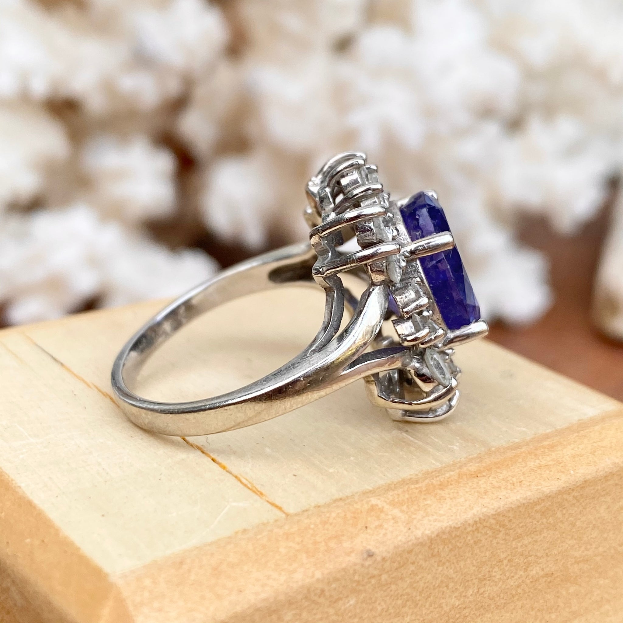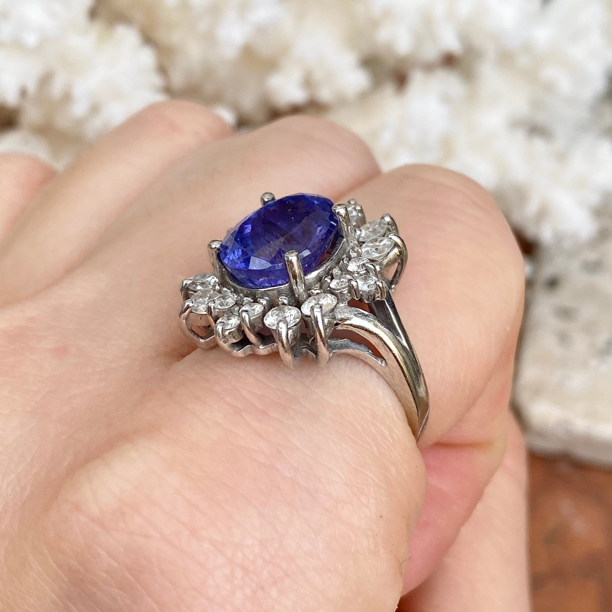 Estate 14KT White Gold Oval 4.5 CT Violet Tanzanite + Halo Diamond Ring