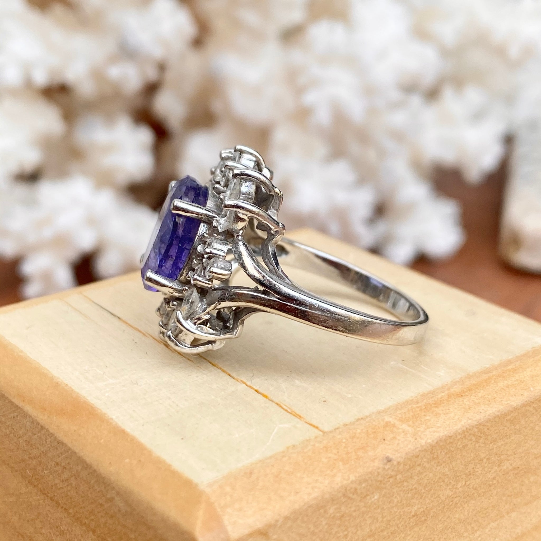 Exquisite estate/ vintage 14KT white gold oval, violet tanzanite + round, white diamond ring.This is an included tanzanite stone, with in certain angles visible to the naked eye.They appear like fractures that run through the stone, but they are inclusions and have been present since the ring was made. This is a beautiful stone, even with these.
