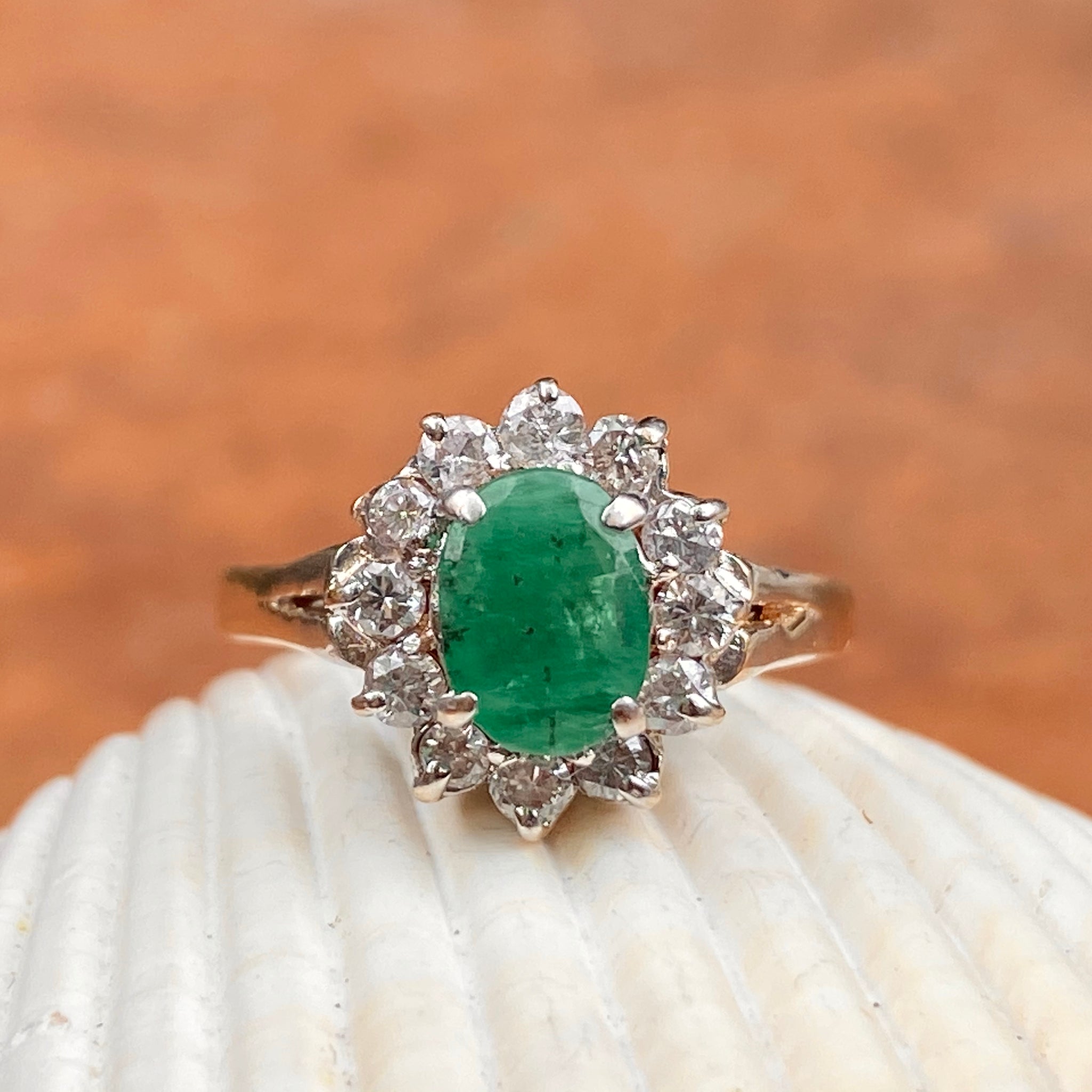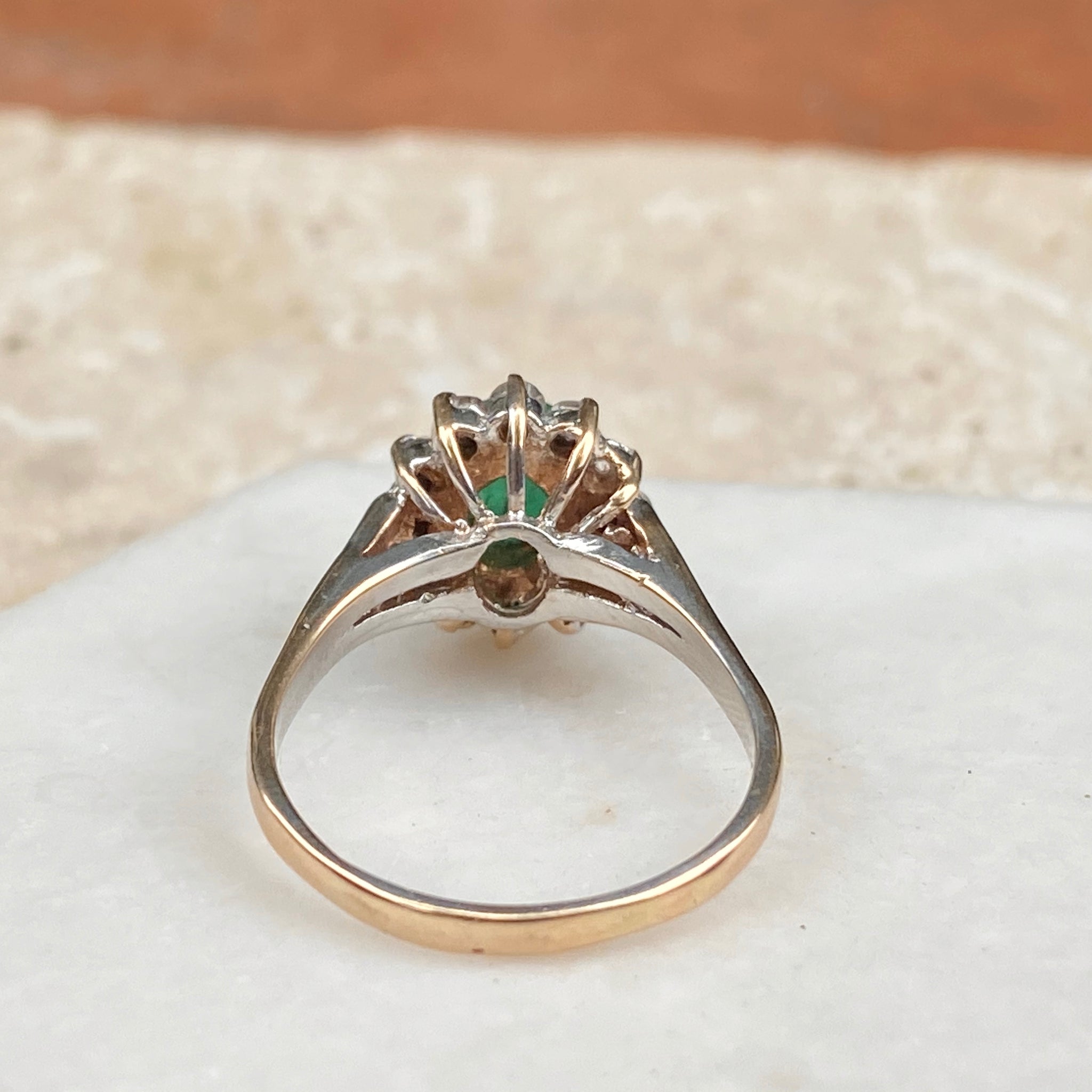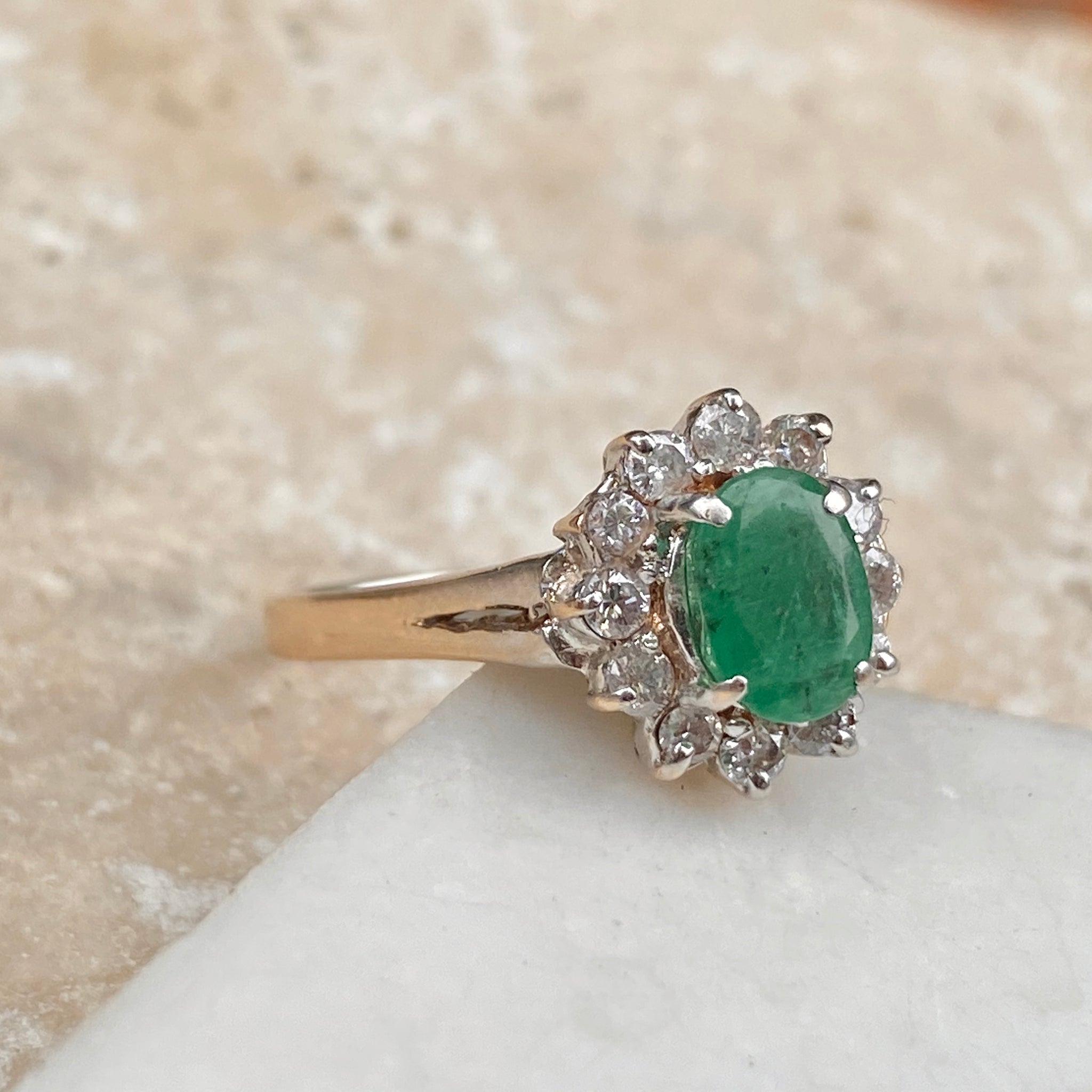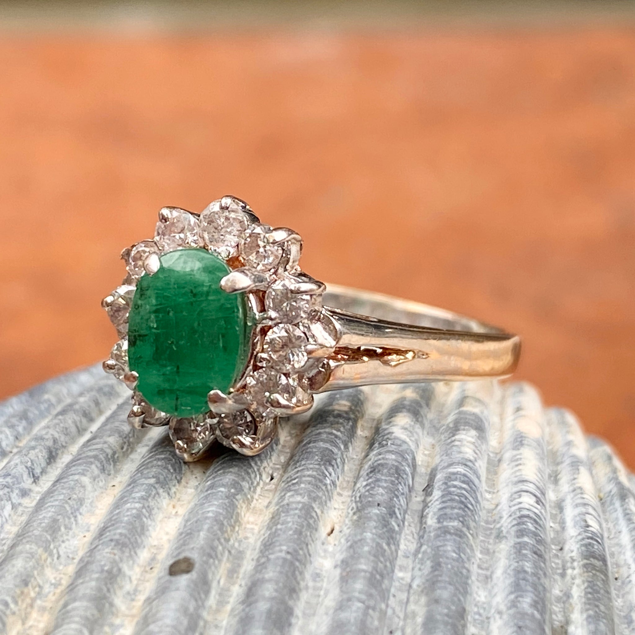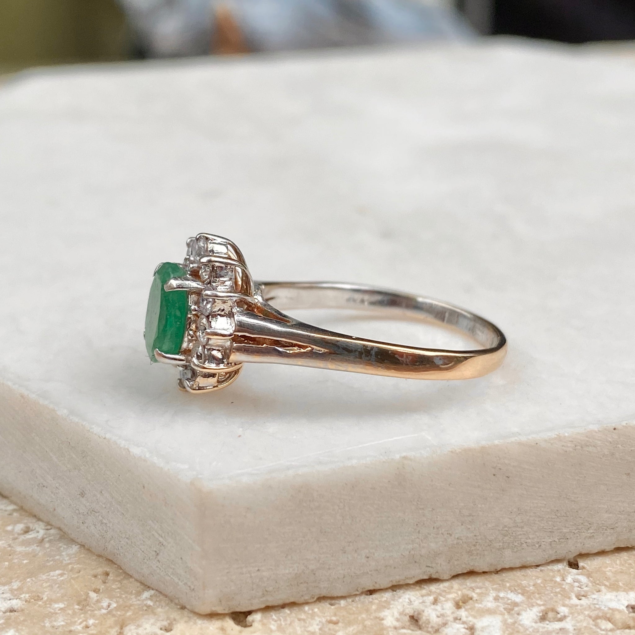 Estate/ vintage 14KT white gold ring with genuine, oval-cut emerald + diamond accents. An elegant piece with the oval emerald center + sparkling, surrounding diamonds!