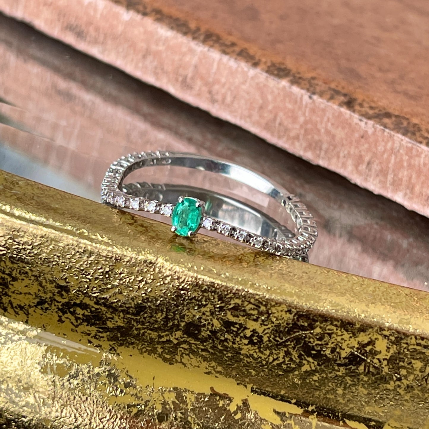 Estate 14KT white gold oval, Colombian emerald + diamond chain link ring. It's like a mini diamond tennis bracelet, but a ring! VERY unique