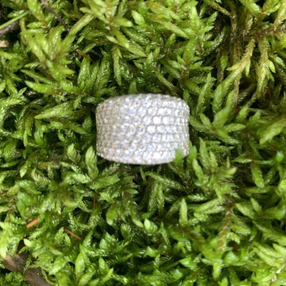 Look like a million bucks with this estate/ vintage 14KT white gold concave cigar band with 3 carats of bright white diamonds. Excellent estate condition-just like new! Pave diamonds go half-way around the ring.