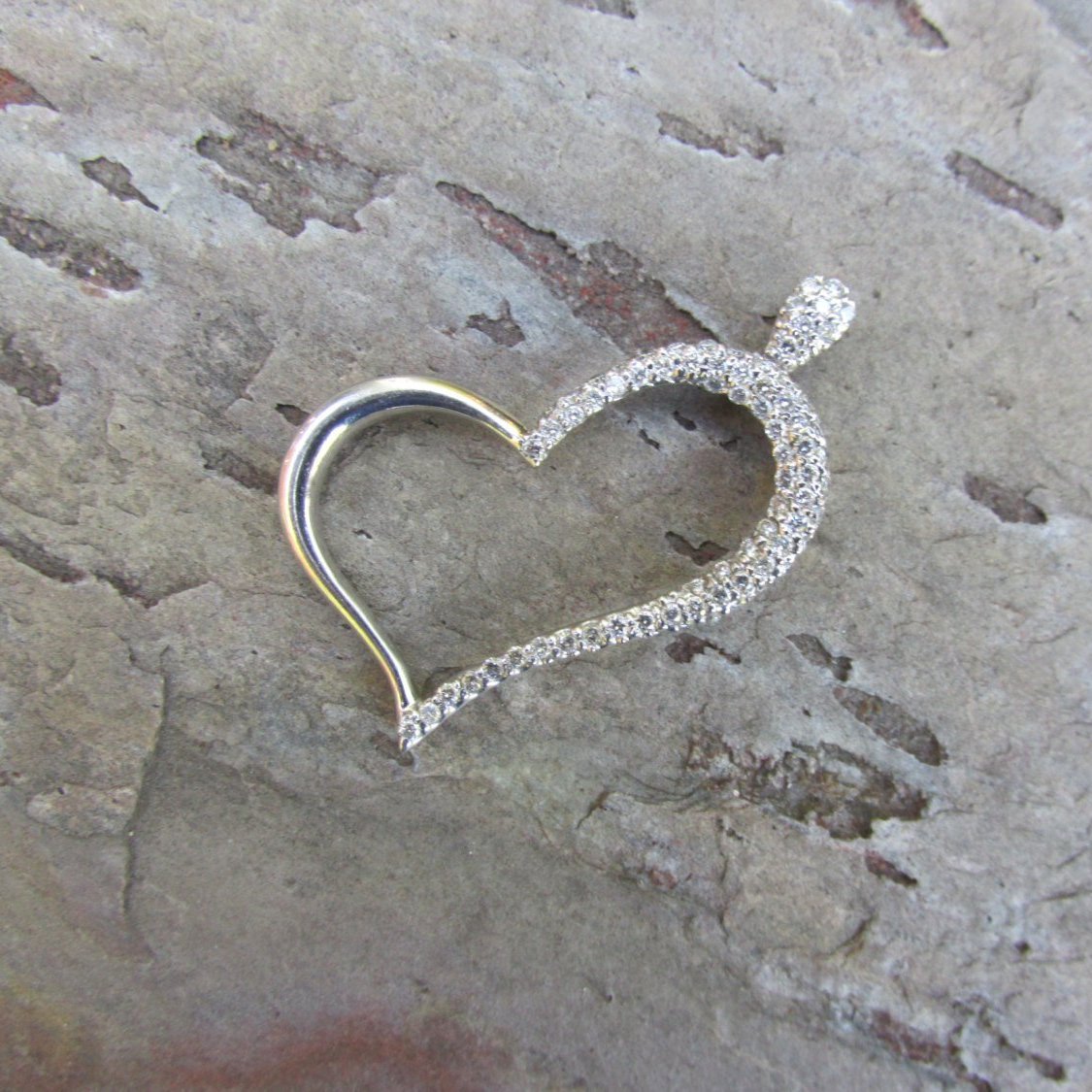 Estate/ vintage 14KT white gold + pave white diamond slide pendant, Beautiful, big open heart sits at an angle. Bail fits up to a 2.75mm necklace. This sparkling heart pendant is a unique statement piece + makes a perfect gift!