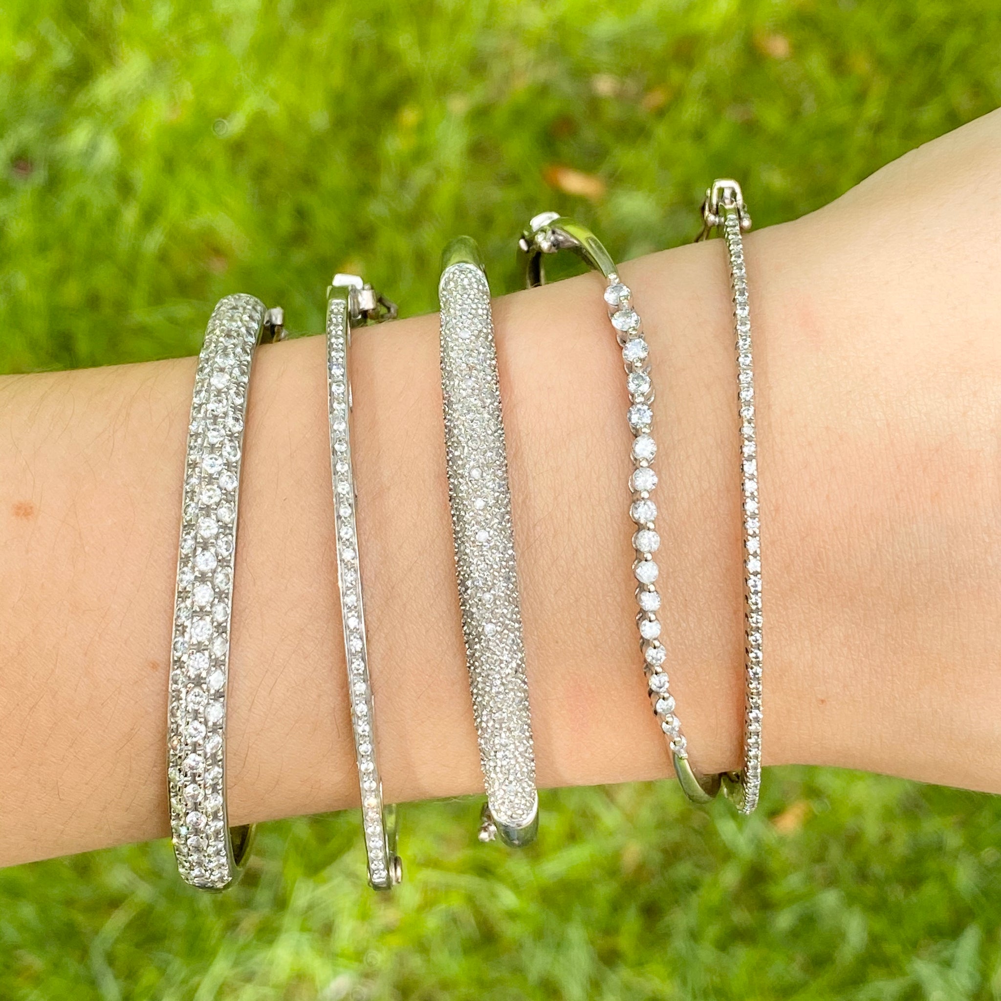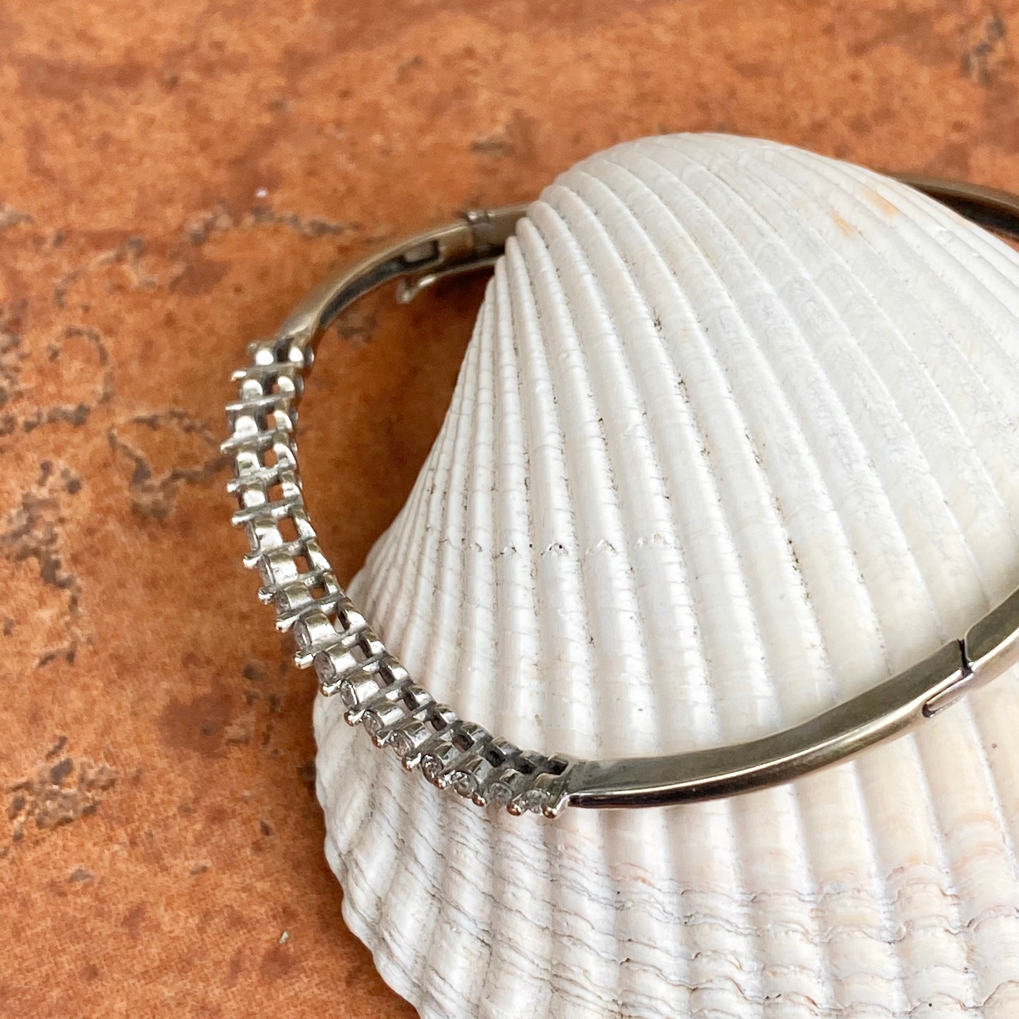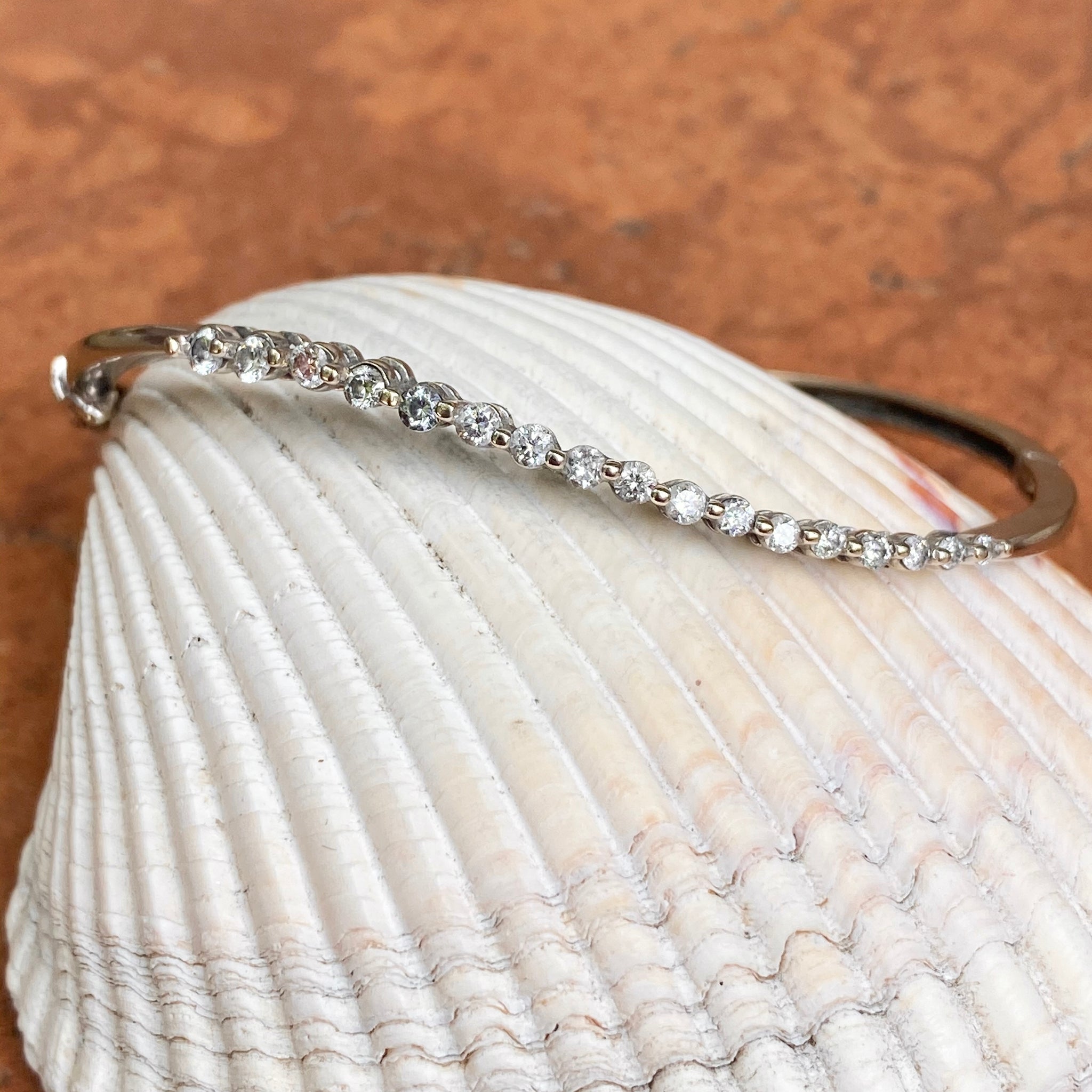 Estate/ vintage 14KT white gold diamond curved journey style design, shared prong bangle bracelet. This uniquely crafted piece sits comfortably on the wrist and absolutely shines! May be shown with other bracelets, which are sold separately.