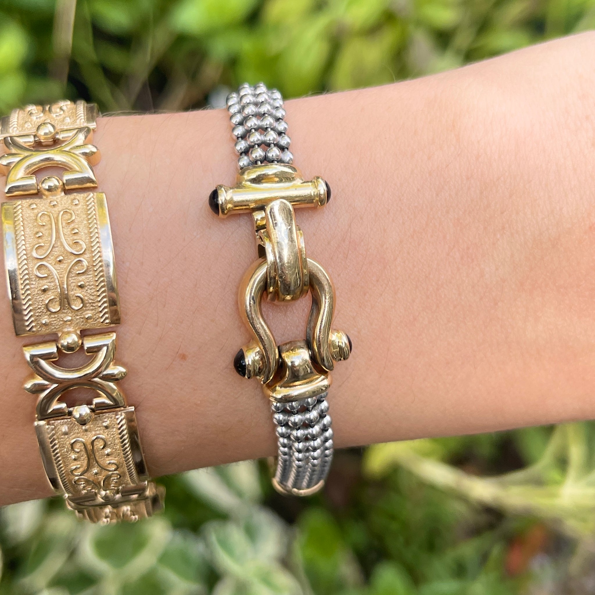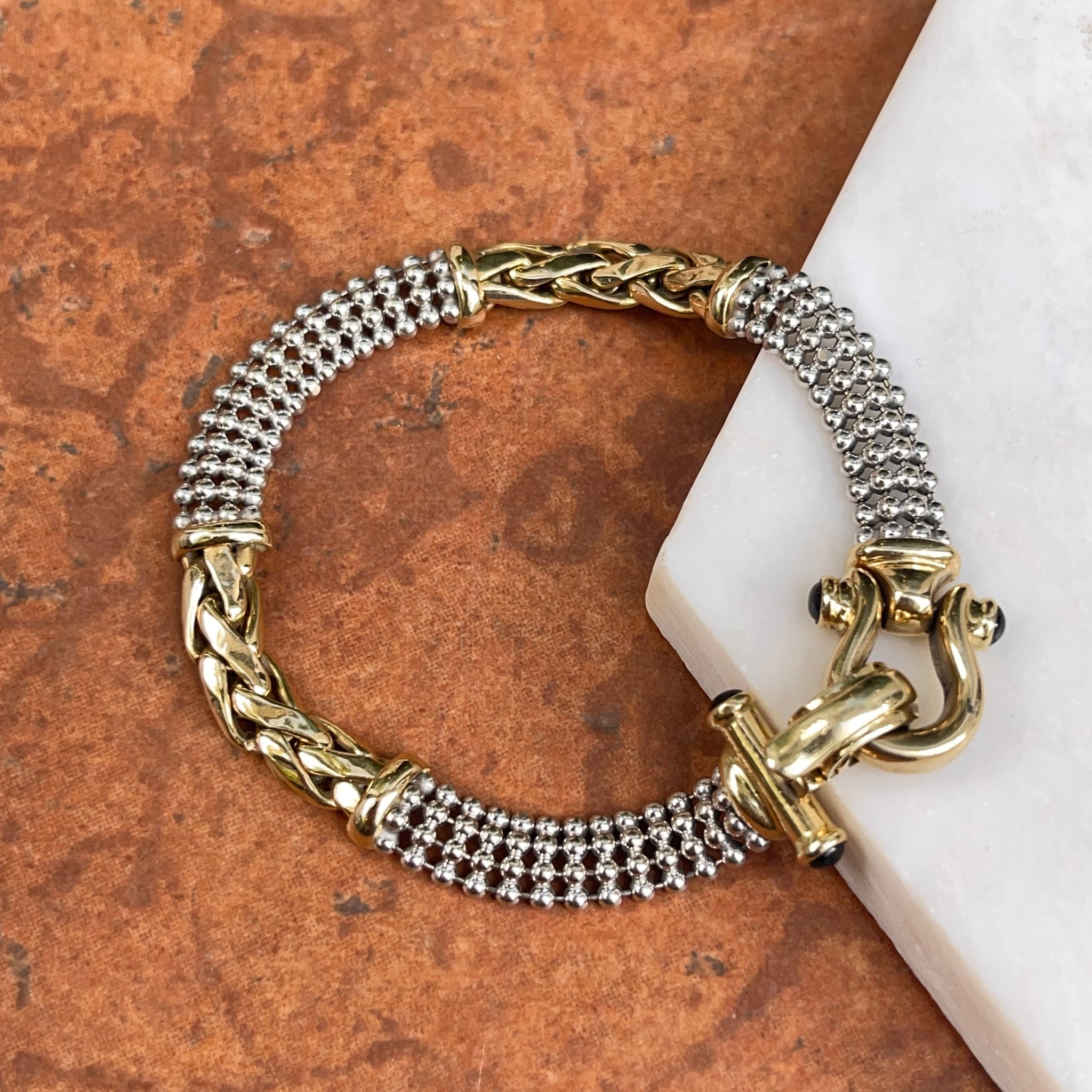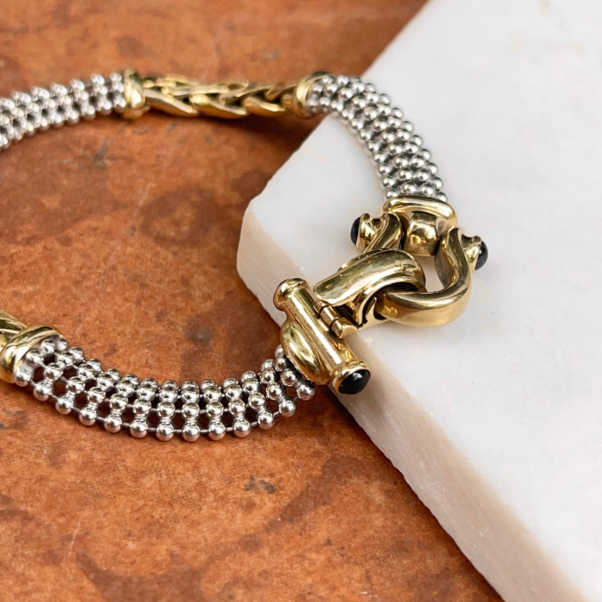 Estate/ vintage 14KT yellow gold rounded wheat open links + 14kt white gold beaded strands with fancy clasp bracelet and cabochon, black onyx end caps .Great design + interesting chunky links! Wear with both white gold and yellow gold! Some minor links are wear/dings/dents; Piece still in excellent wearable condition!
