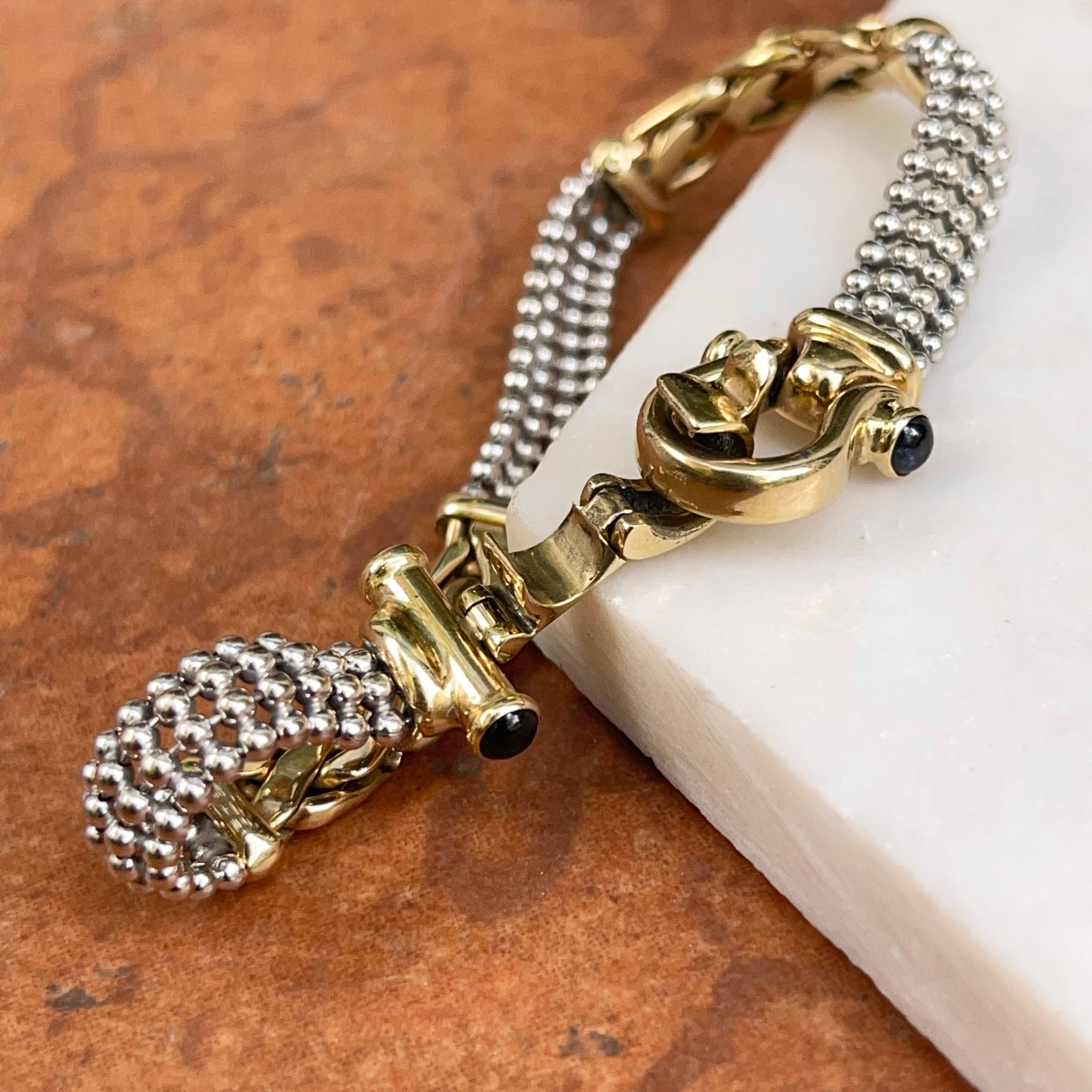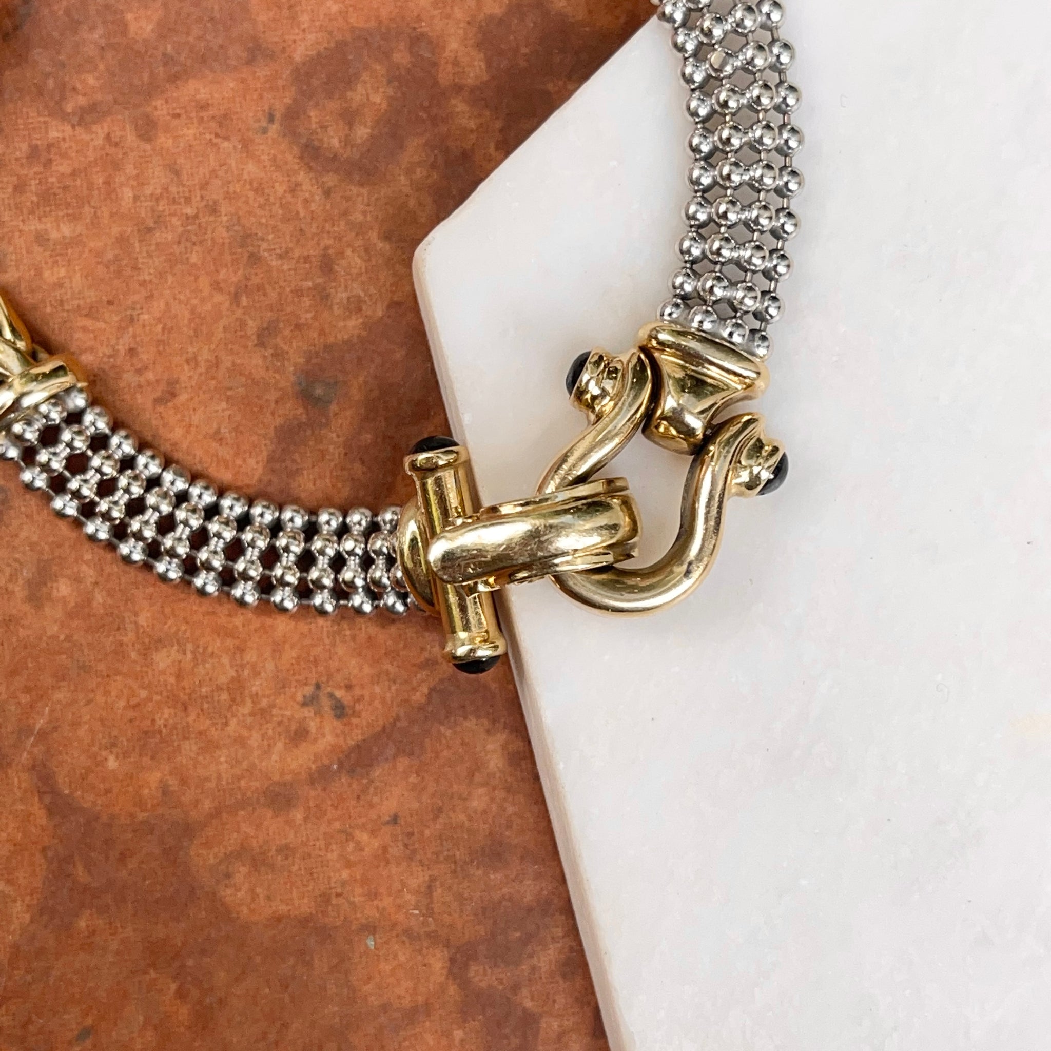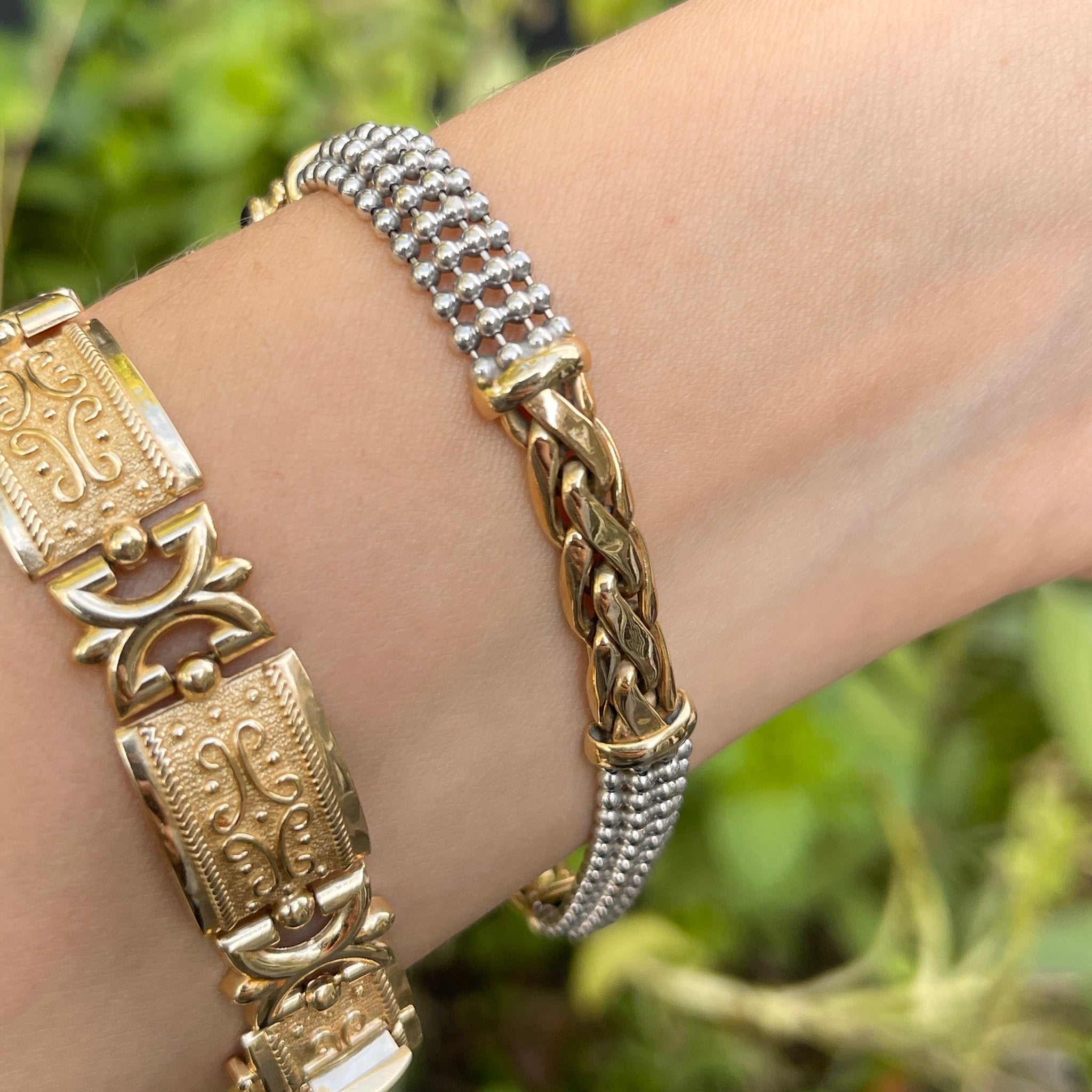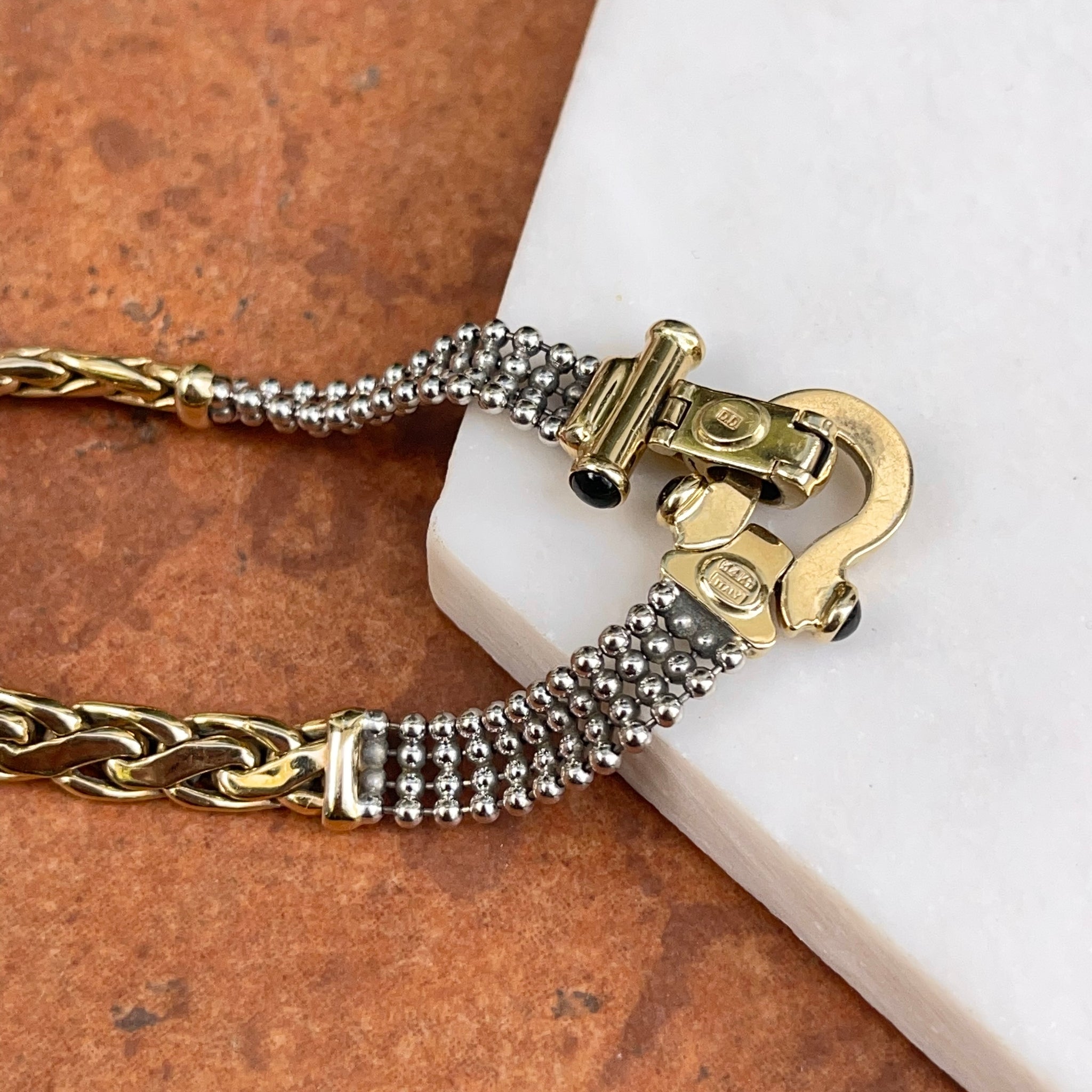 Estate/ vintage 14KT yellow gold rounded wheat open links + 14kt white gold beaded strands with fancy clasp bracelet and cabochon, black onyx end caps .Great design + interesting chunky links! Wear with both white gold and yellow gold! Some minor links are wear/dings/dents; Piece still in excellent wearable condition!