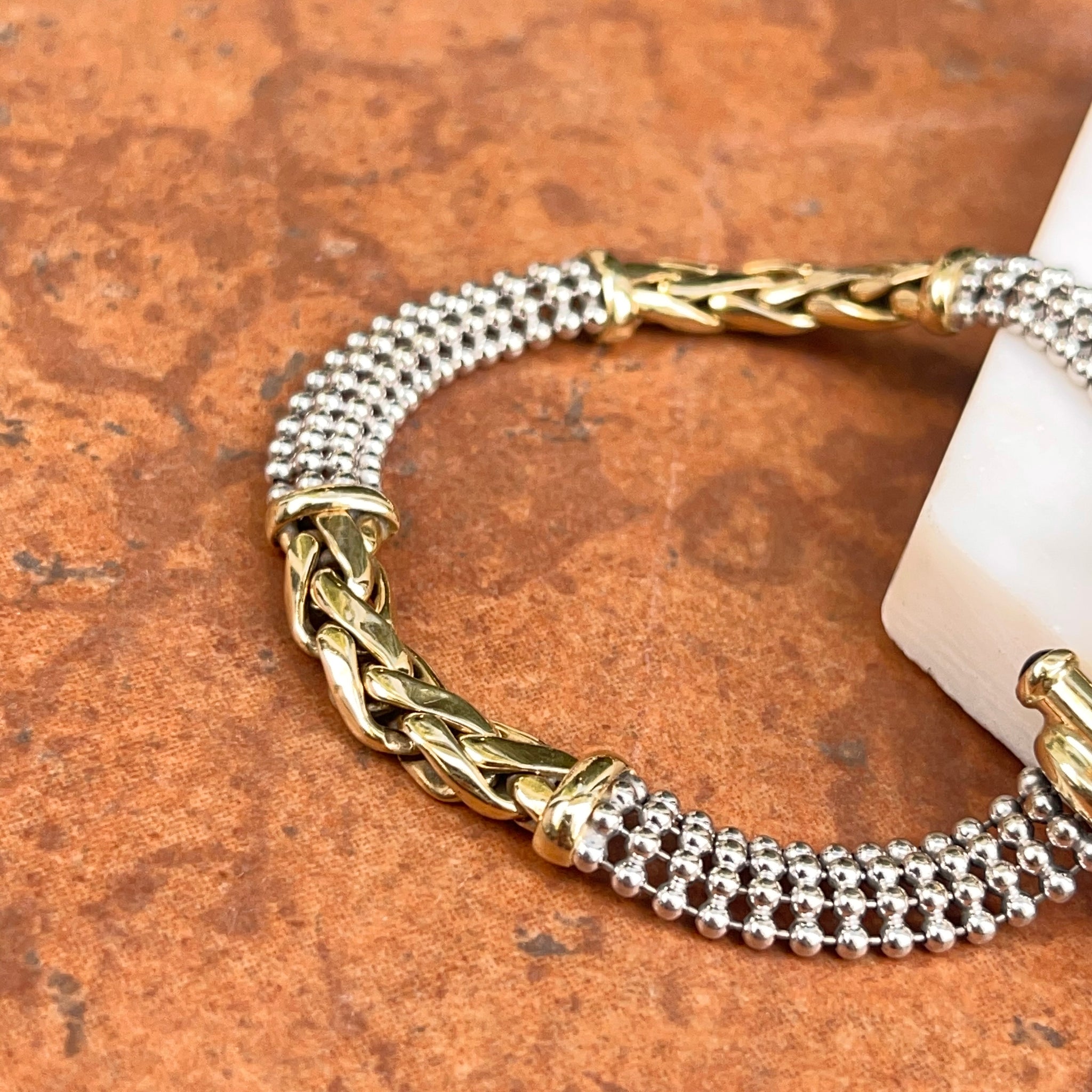 Estate 14KT White Gold + Yellow Gold Wheat + Beaded Chain Bridle Onyx Bracelet