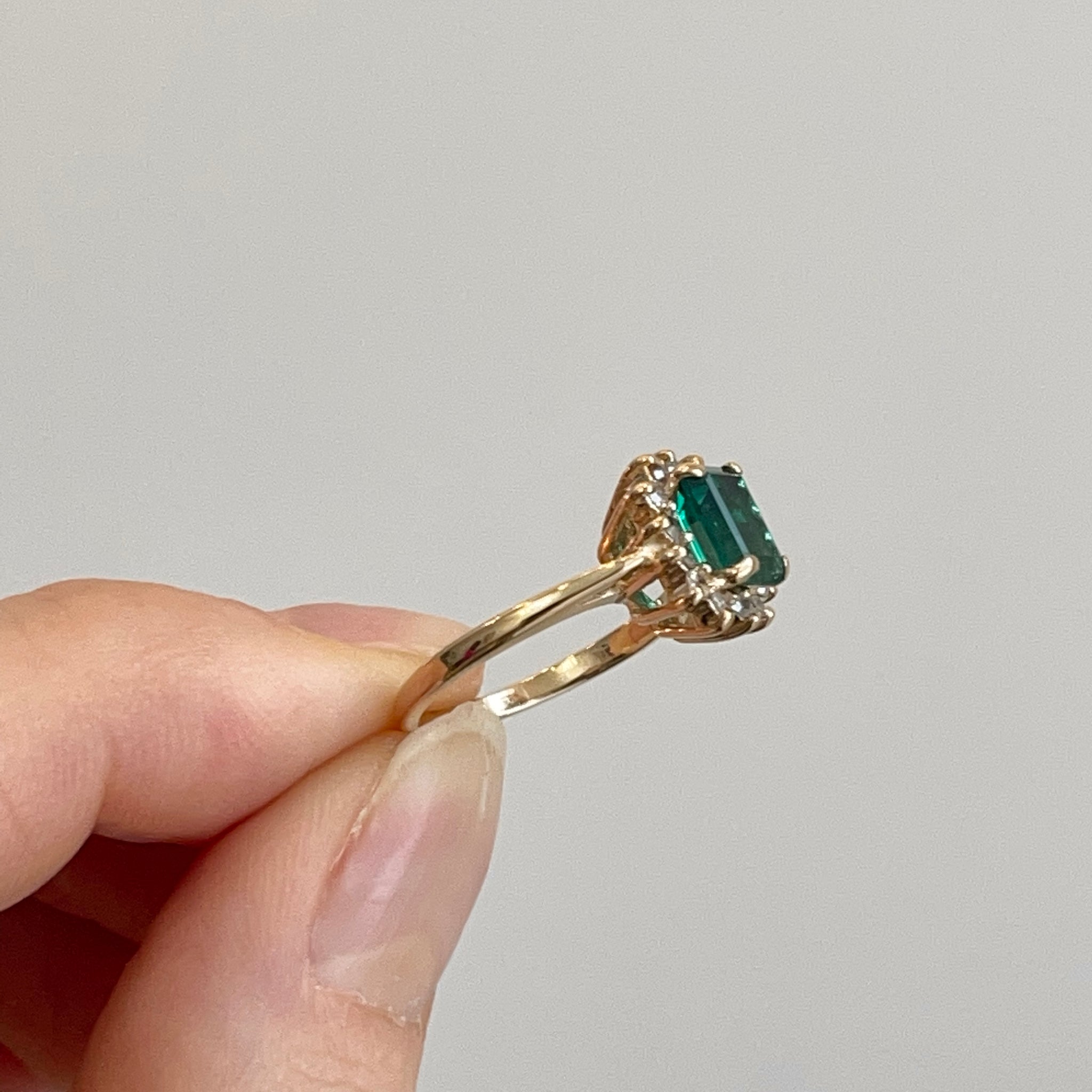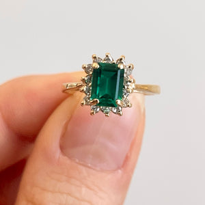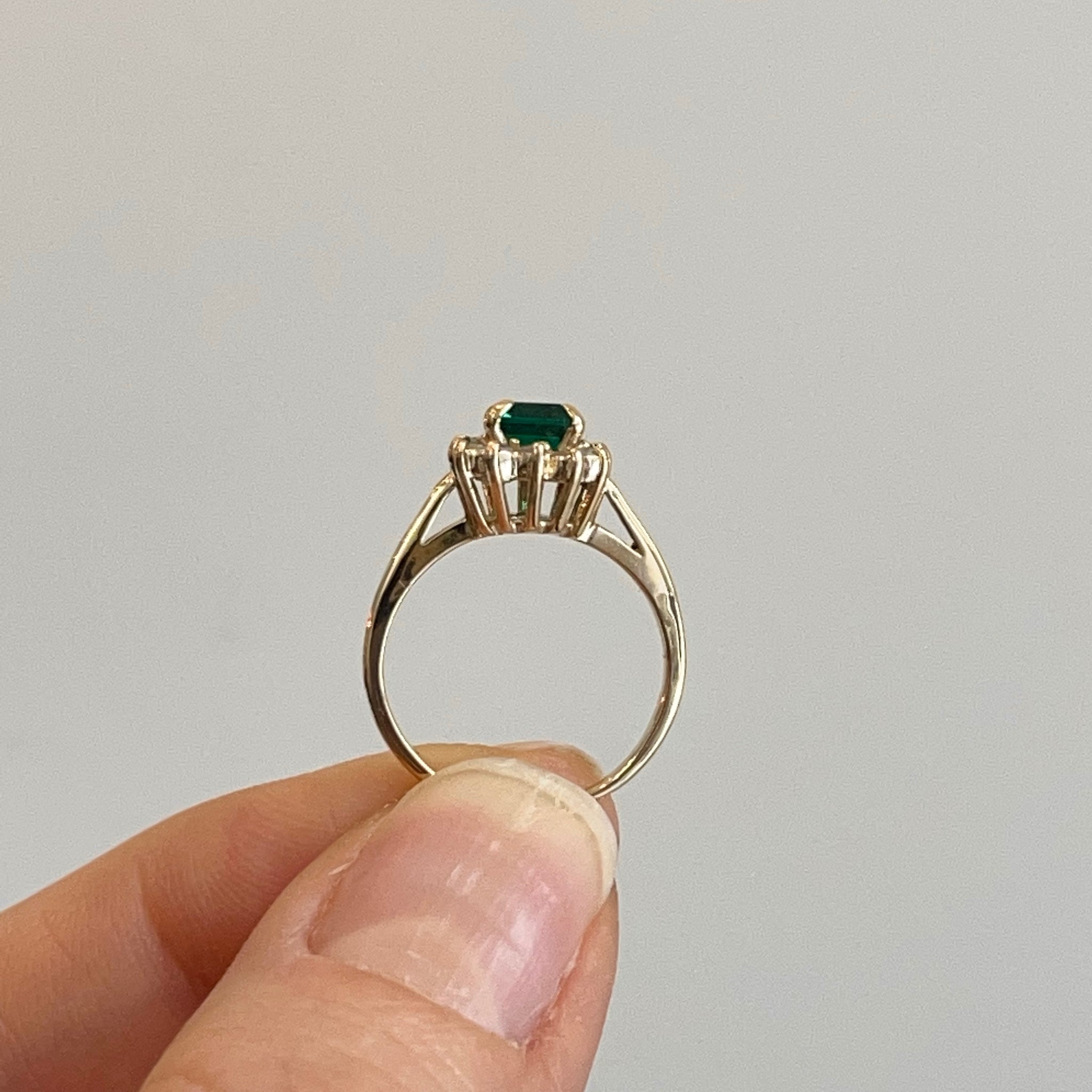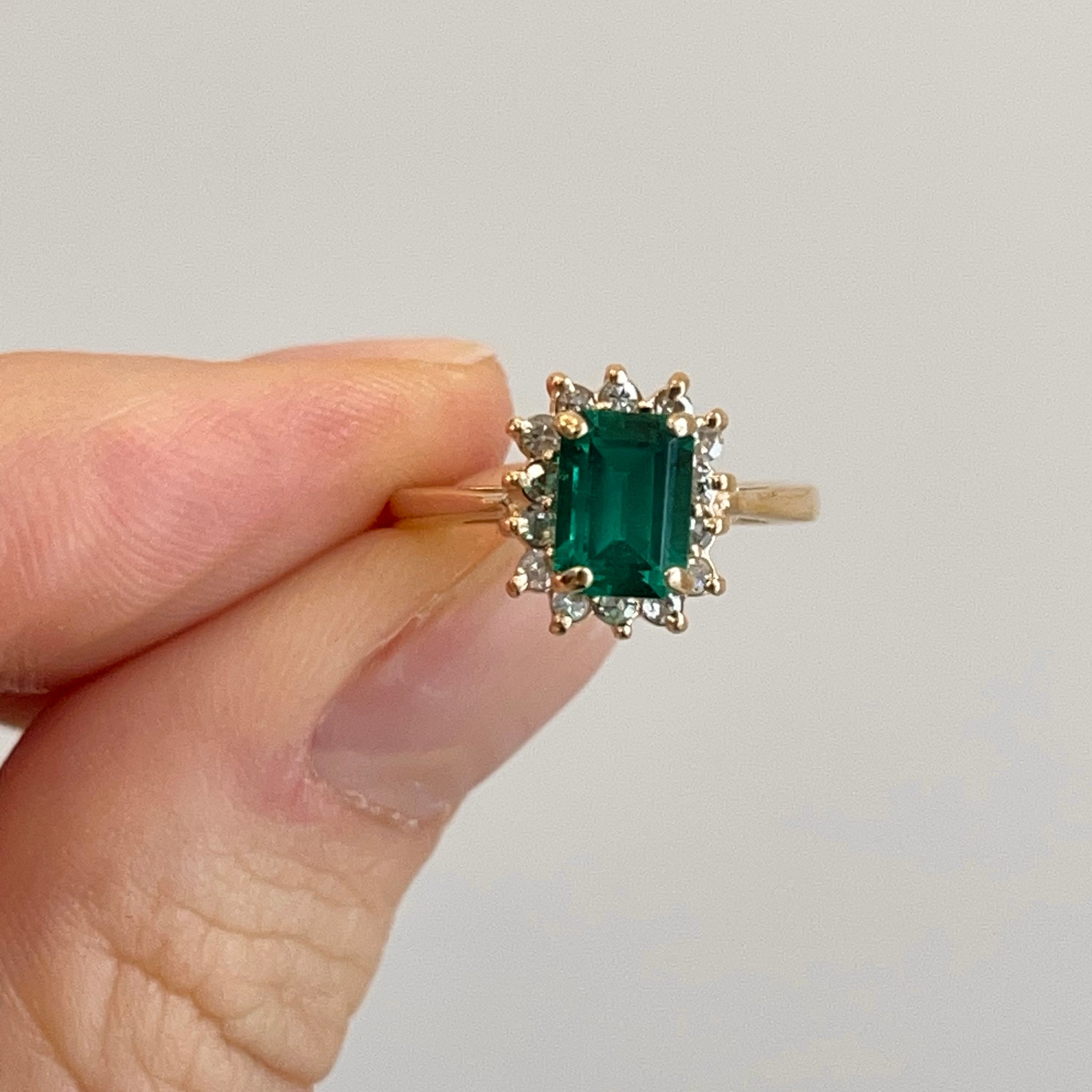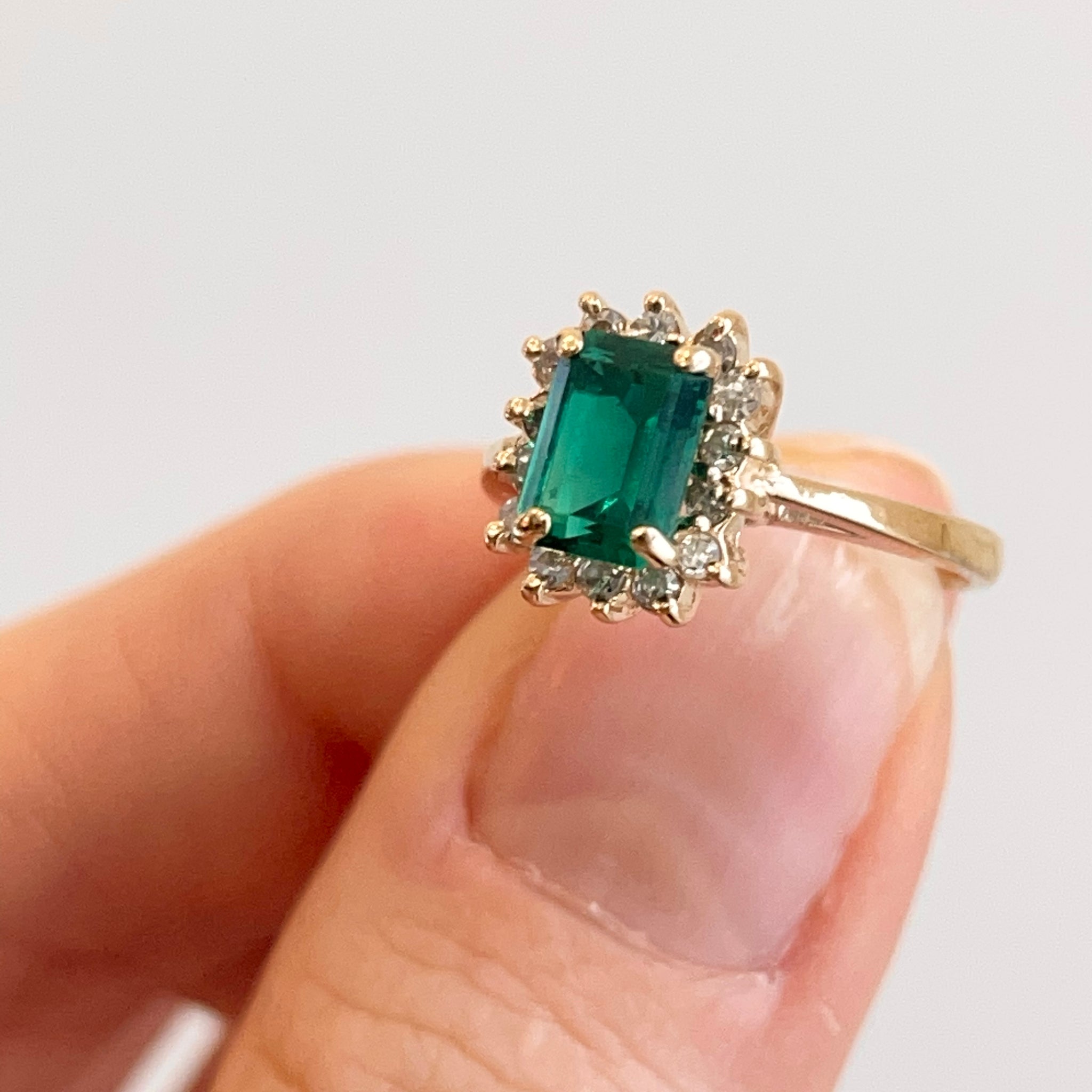 Estate/ vintage 14KT yellow gold emerald-cut, lab-created emerald + diamond halo ring. Stunning + dainty looking ring with a deep, dark green emerald to steal the show!
