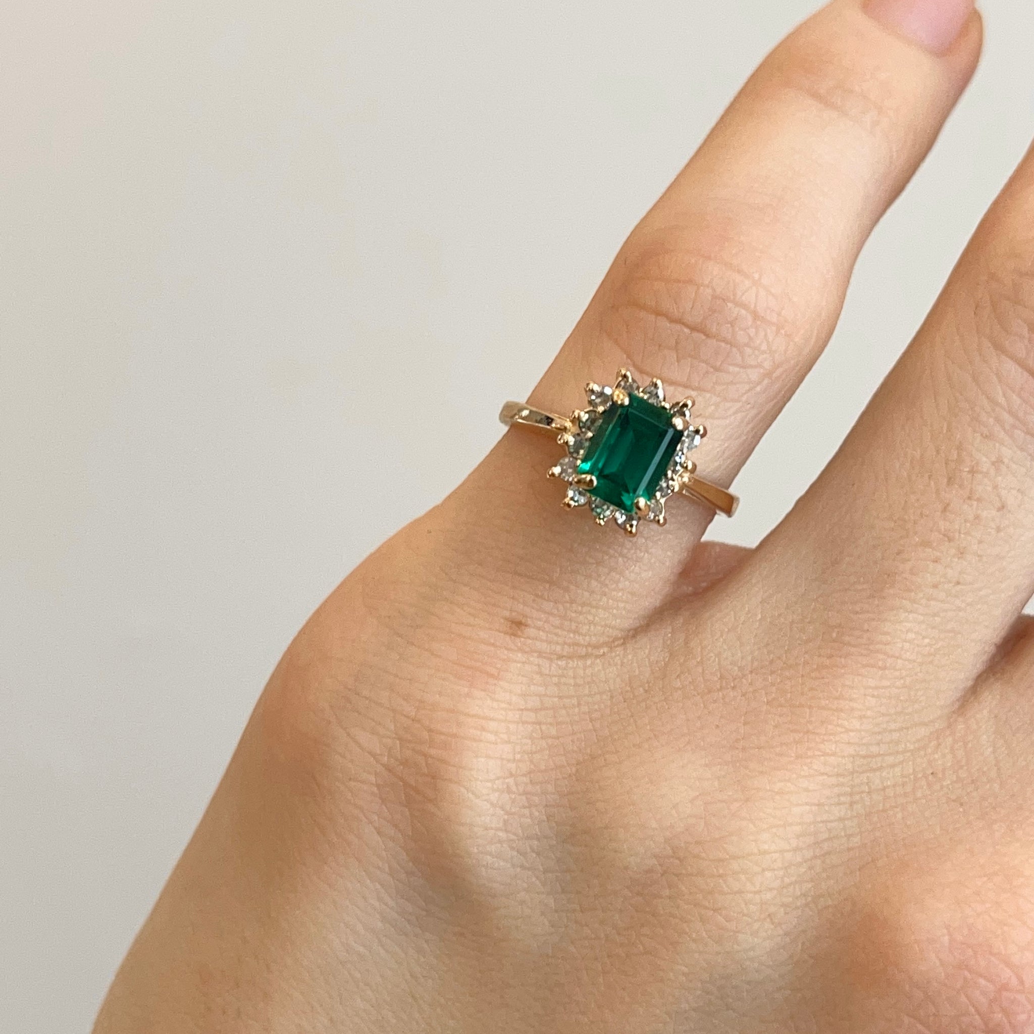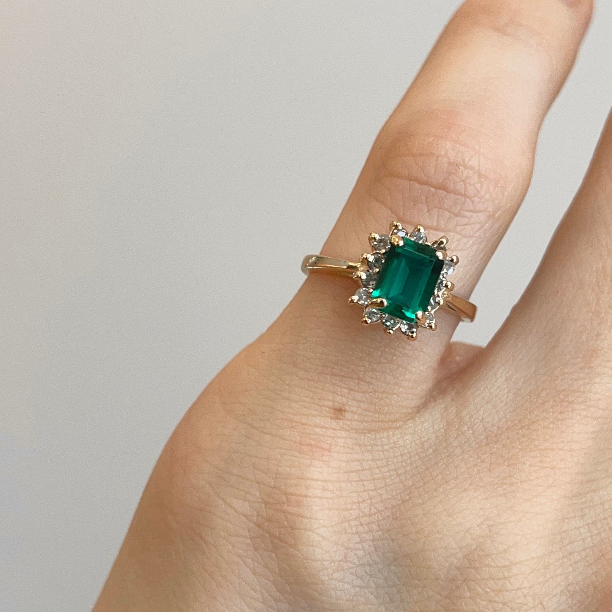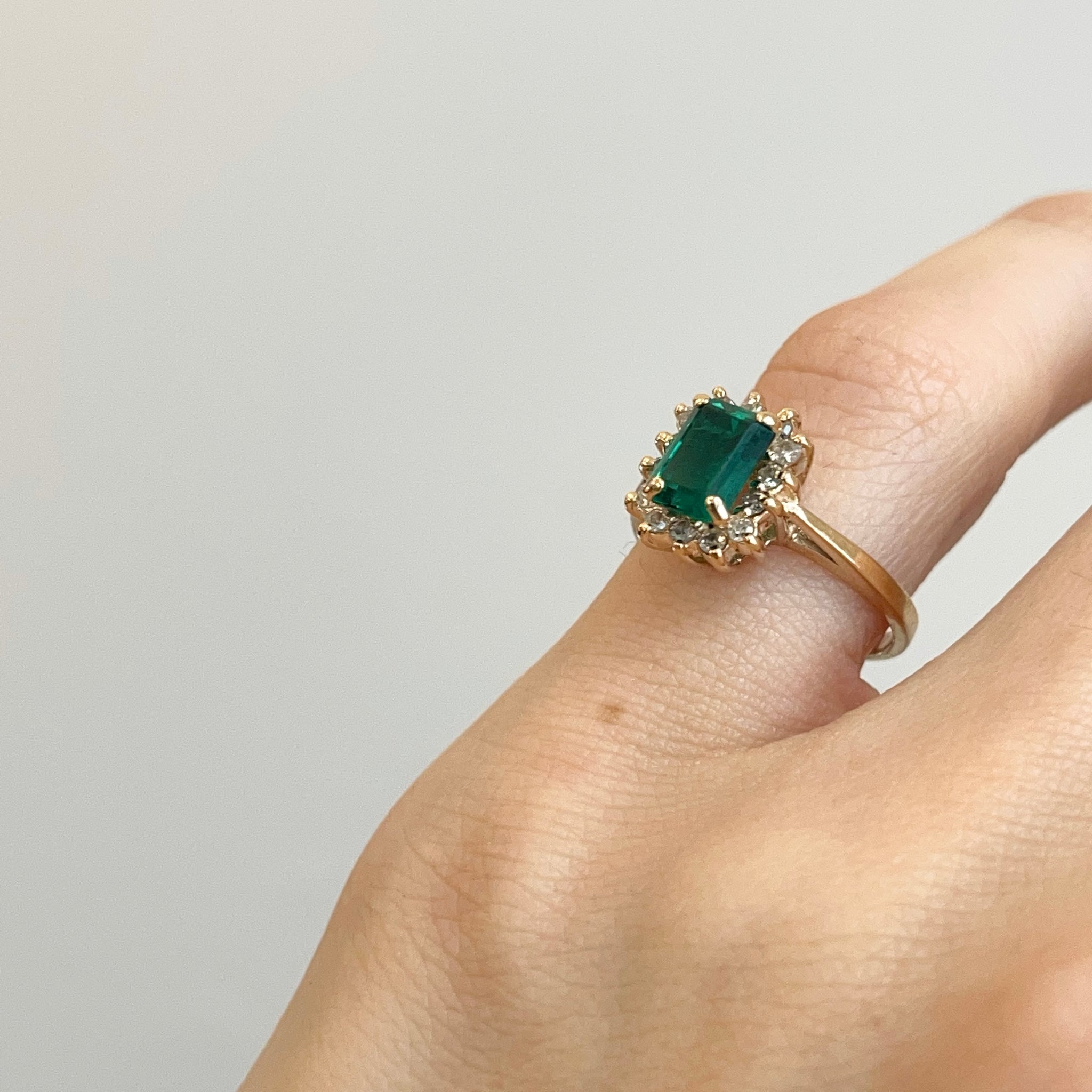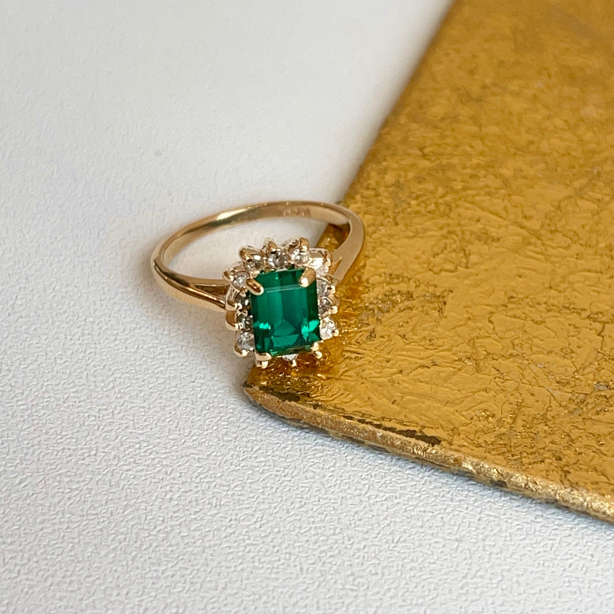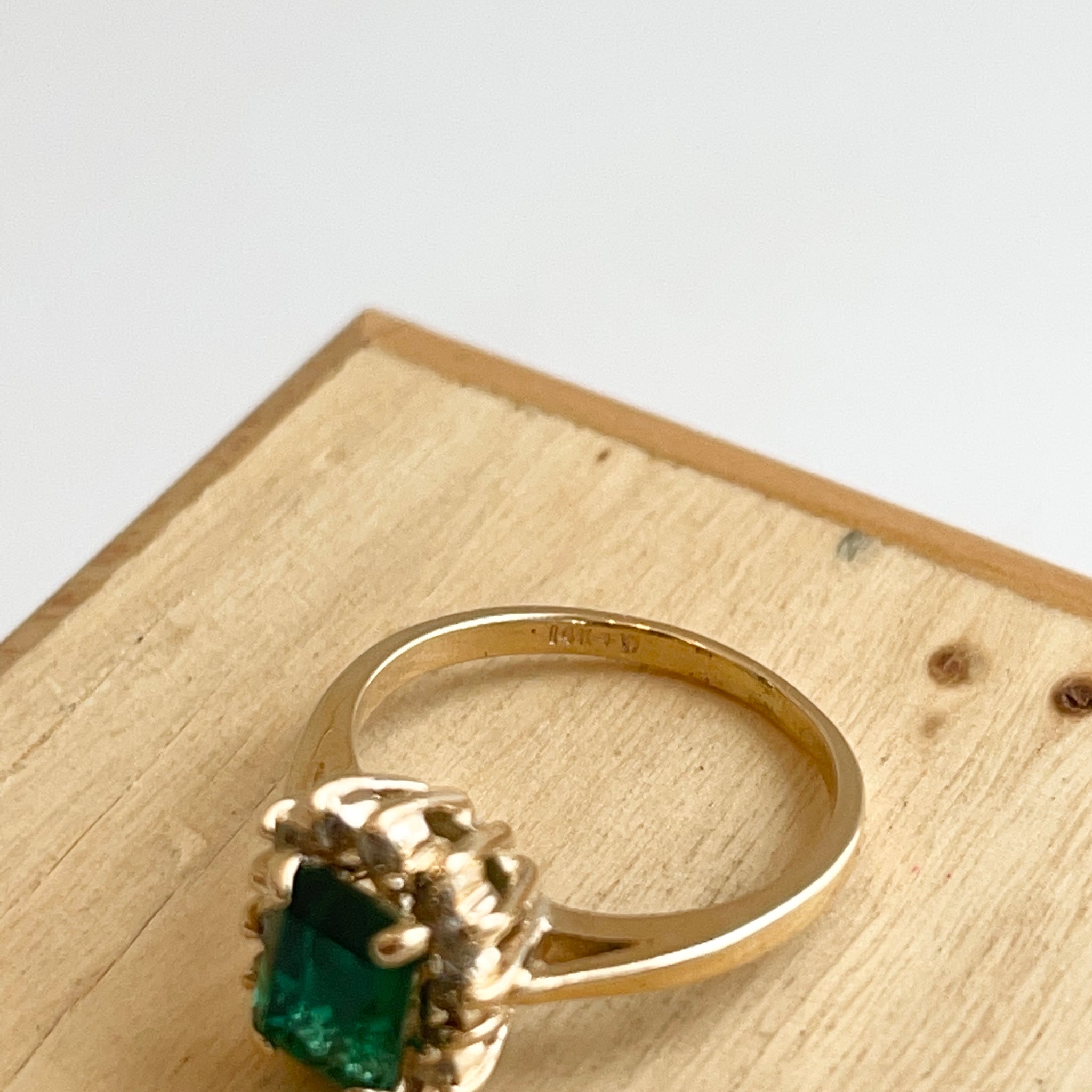 Estate/ vintage 14KT yellow gold emerald-cut, lab-created emerald + diamond halo ring. Stunning + dainty looking ring with a deep, dark green emerald to steal the show!