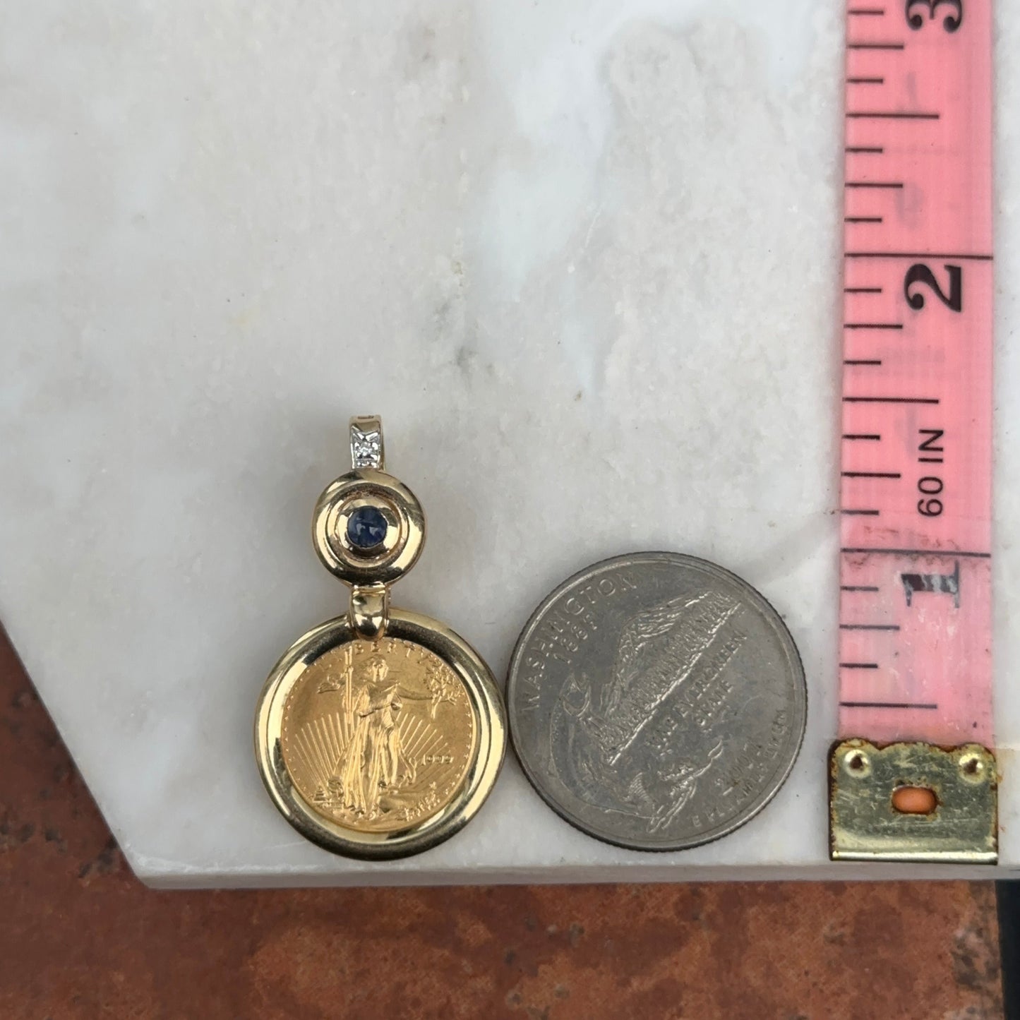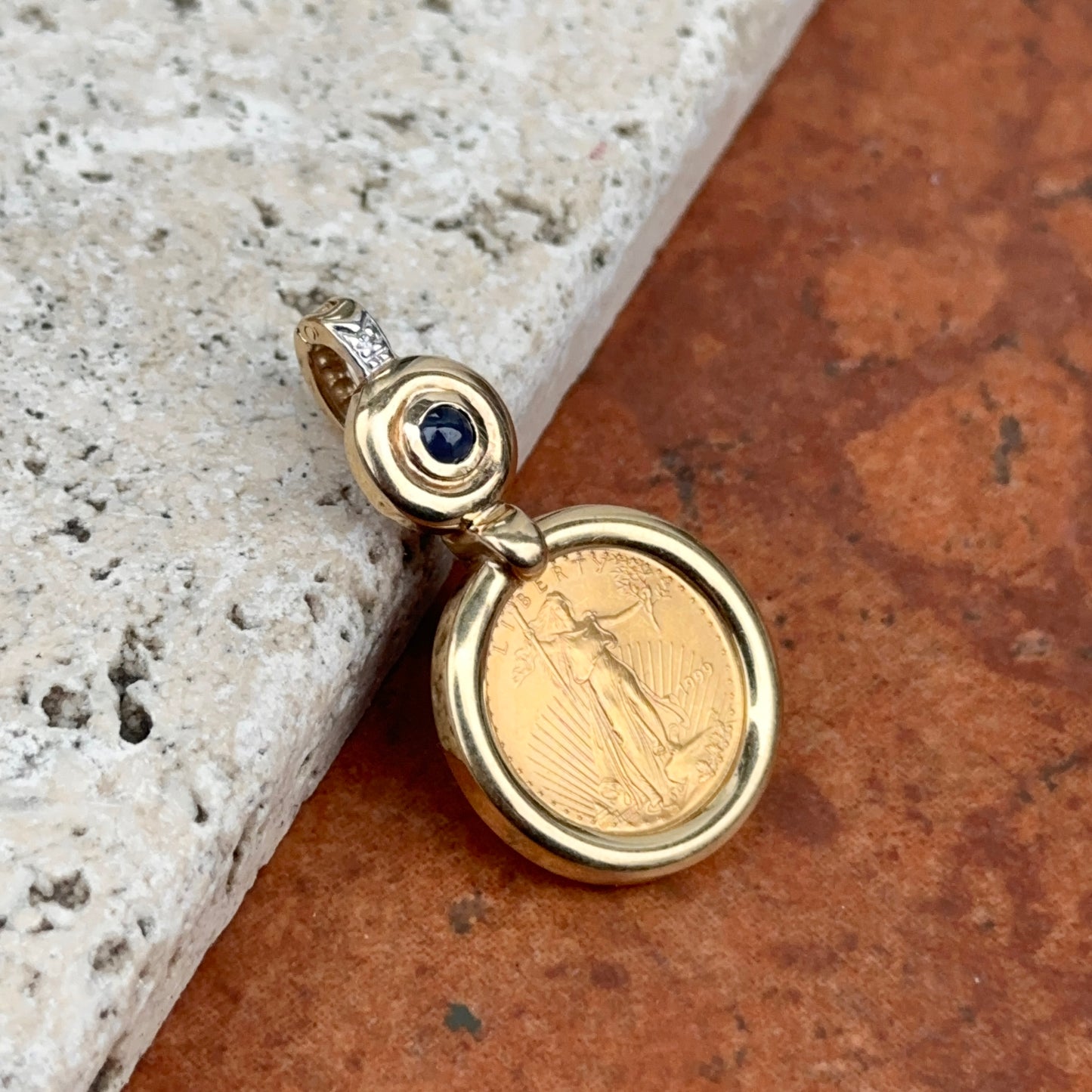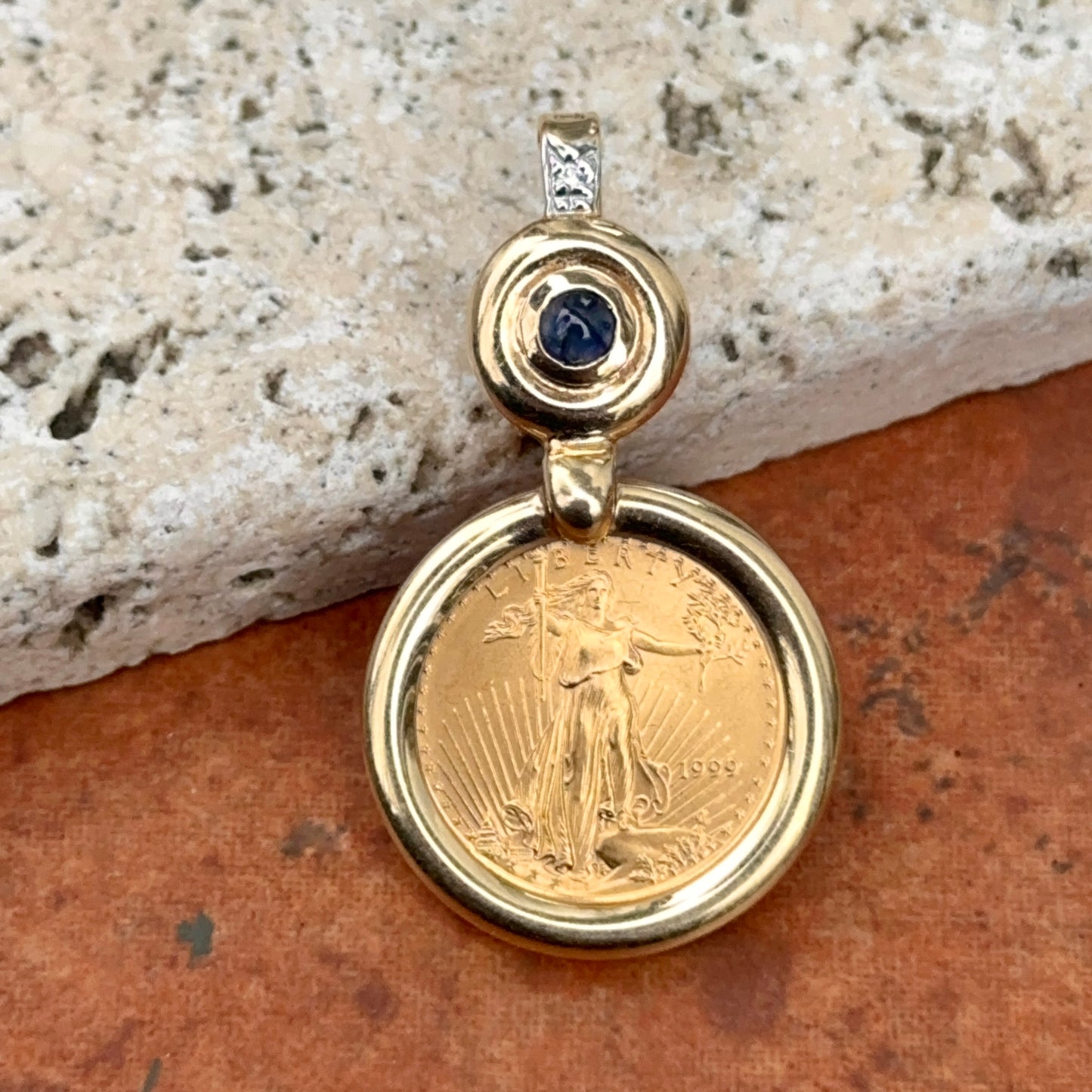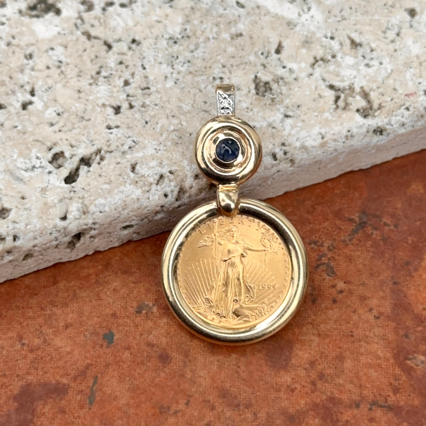 Estate 14KT Yellow Gold American Liberty Coin + Sapphire Pendant