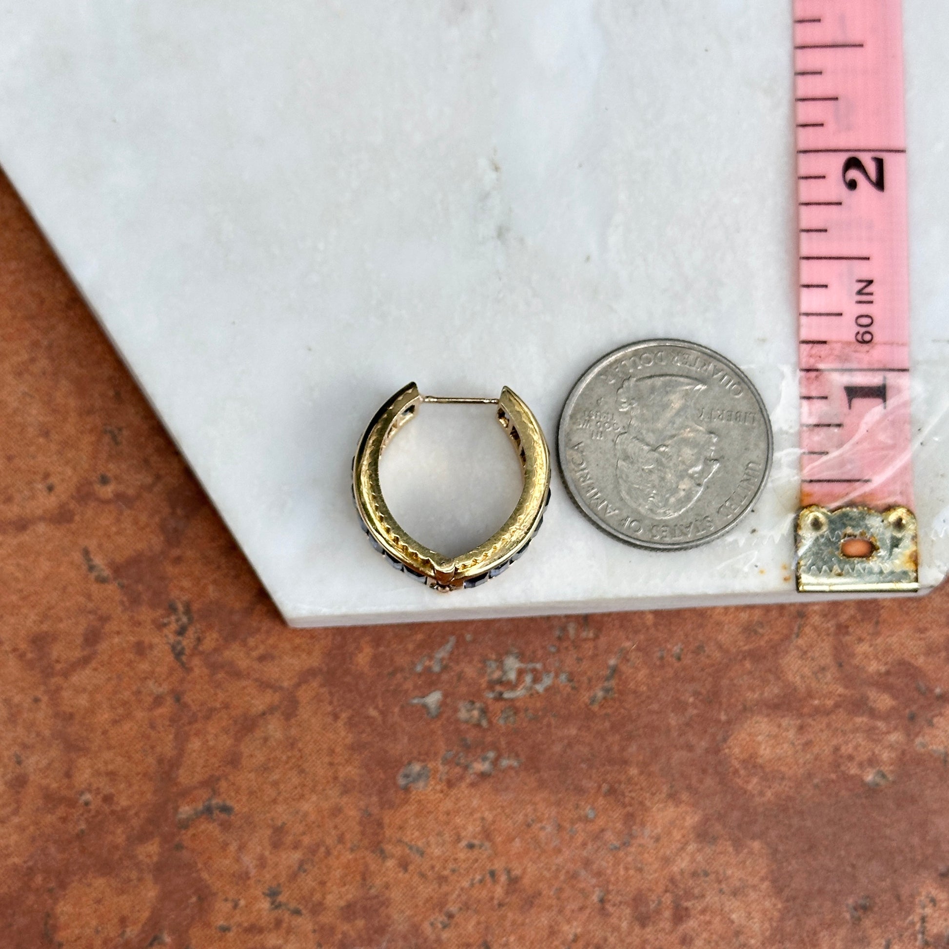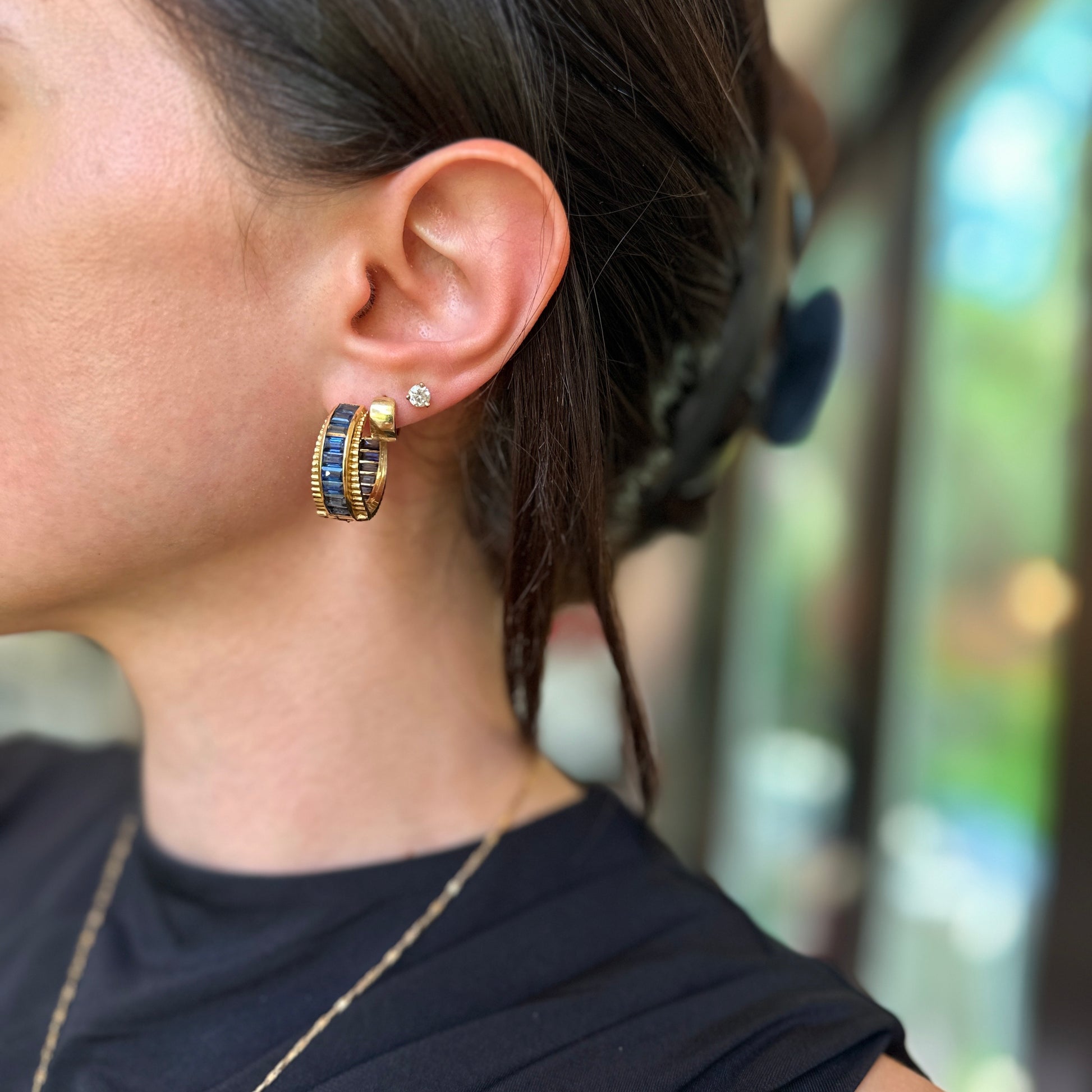 Estate 14KT Yellow Gold Baguette Sapphire Channel Set Back and Front Graduated Hoop Earrings