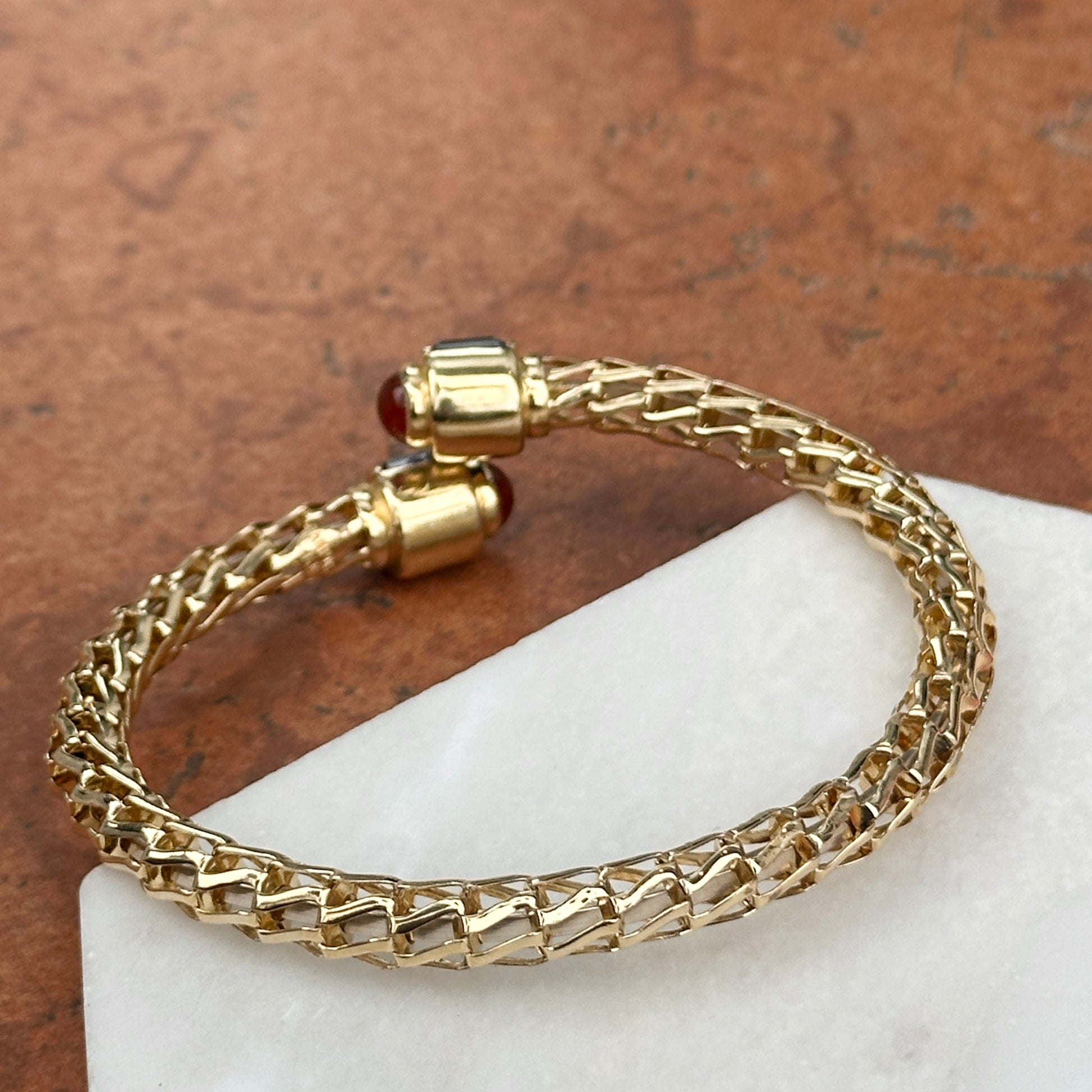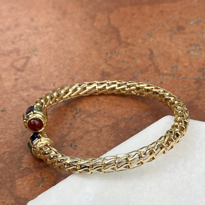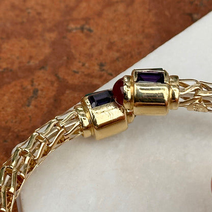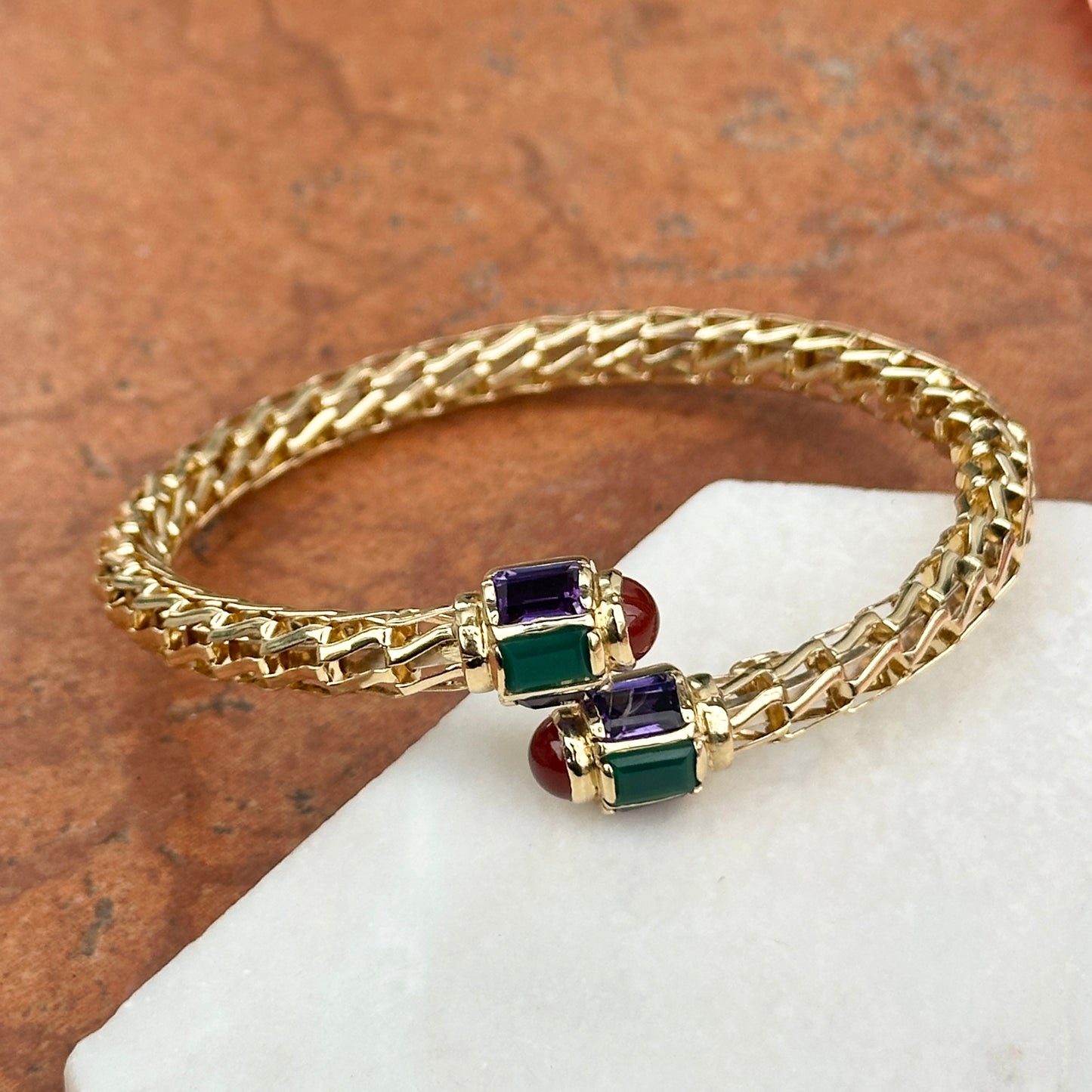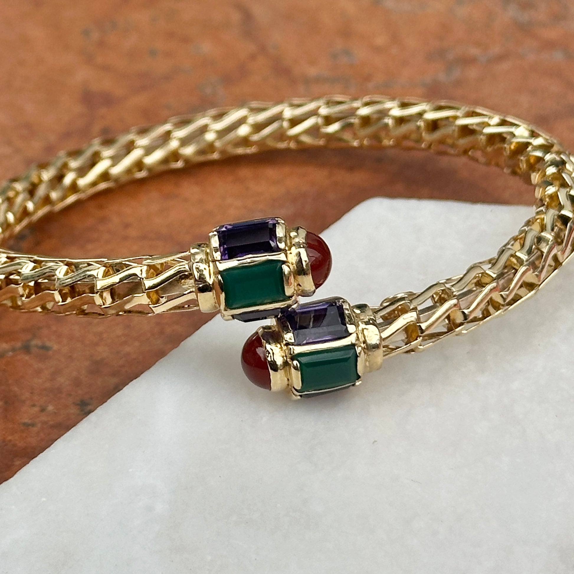 Estate/ Vintage Rare 14KT Yellow Open Work Weave Bangle Cuff Bracelet with Genuine Emerald Cut Green Onyx, Carnelian & Amethyst End Caps