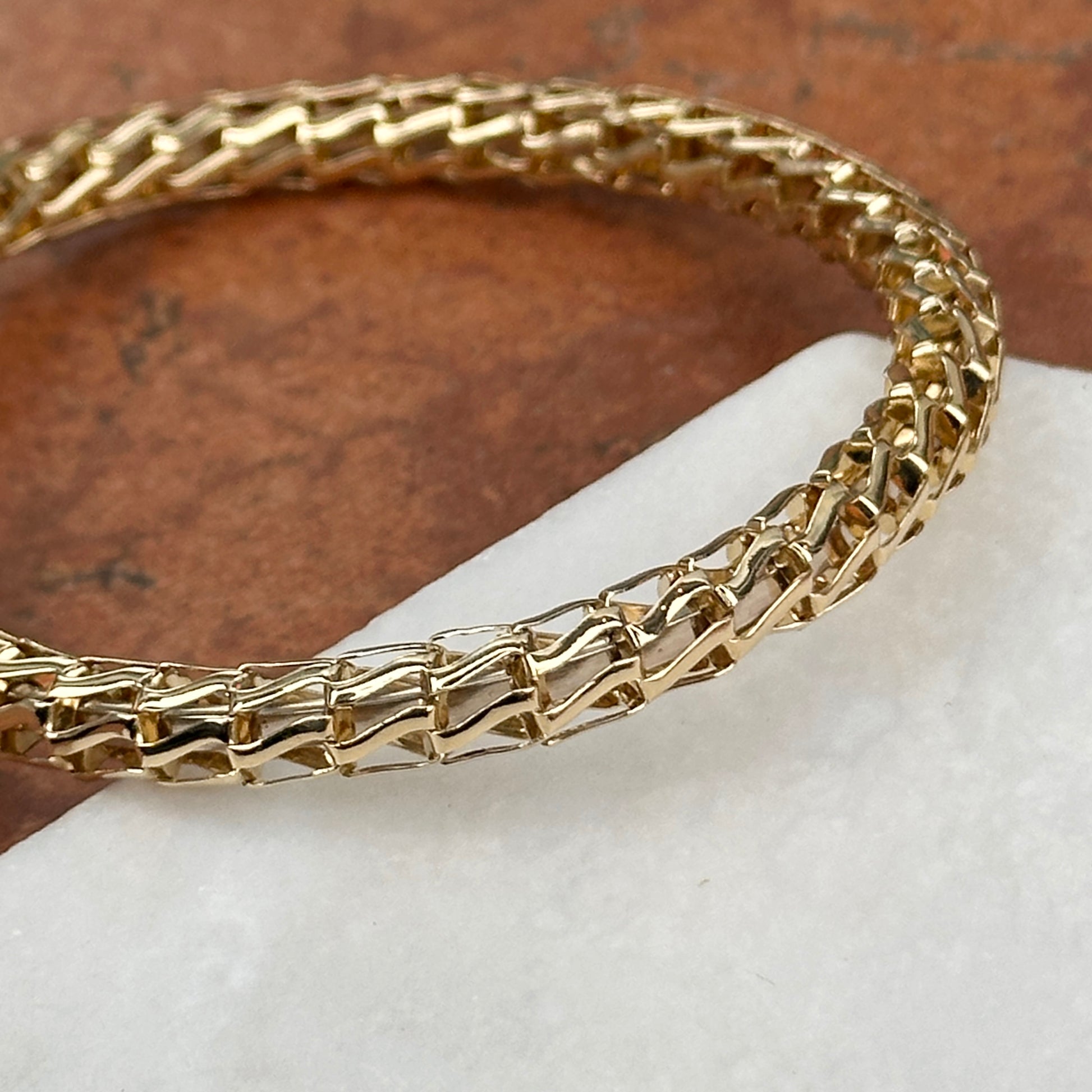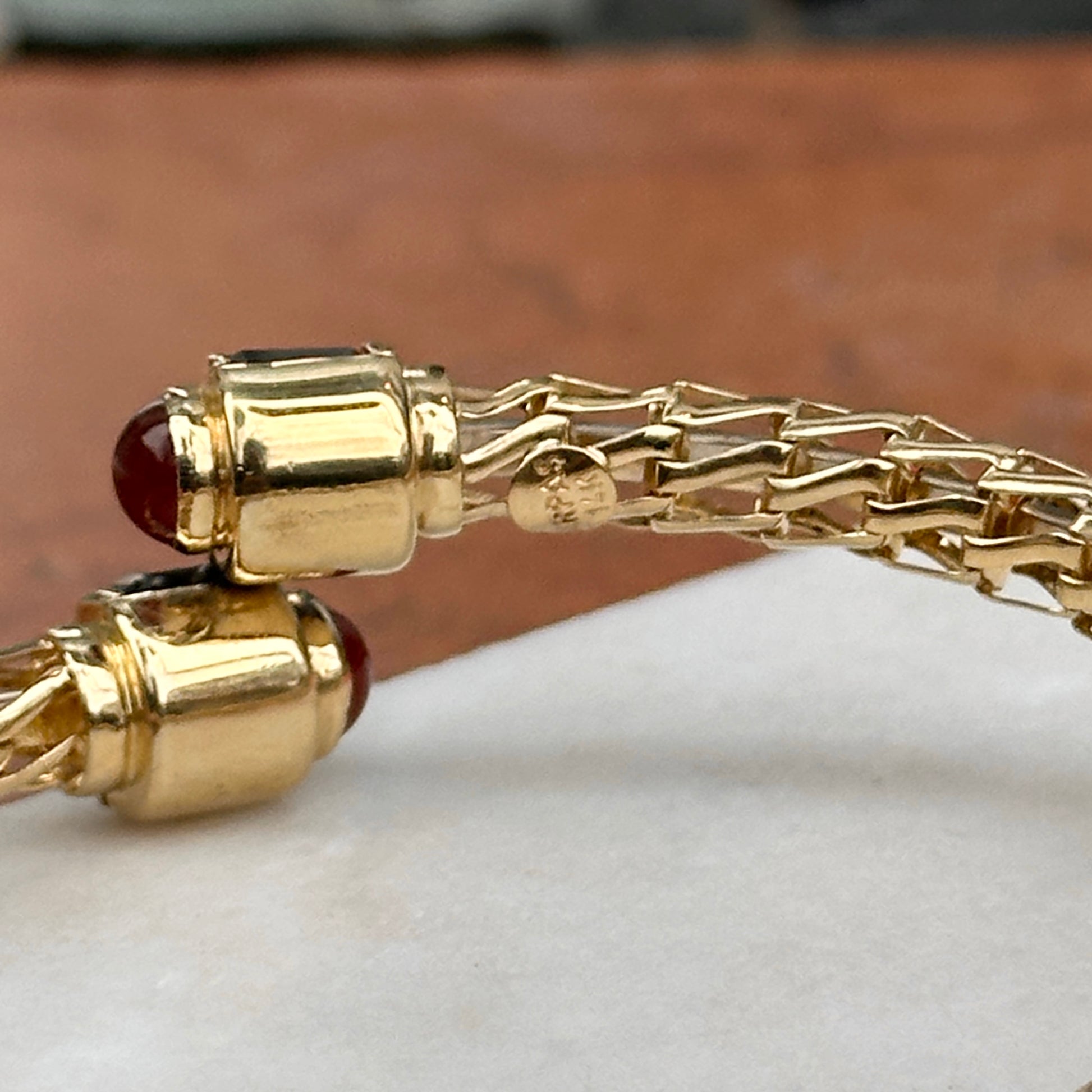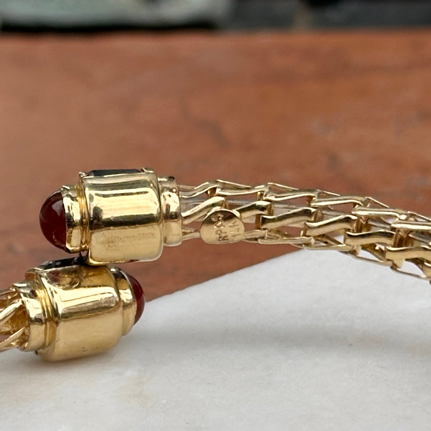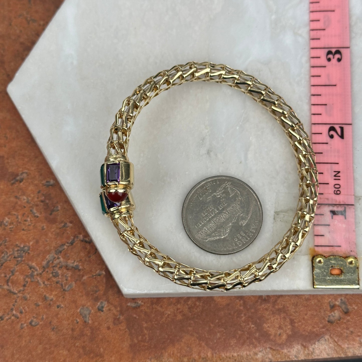 Estate/ Vintage Rare 14KT Yellow Open Work Weave Bangle Cuff Bracelet with Genuine Emerald Cut Green Onyx, Carnelian & Amethyst End Caps