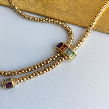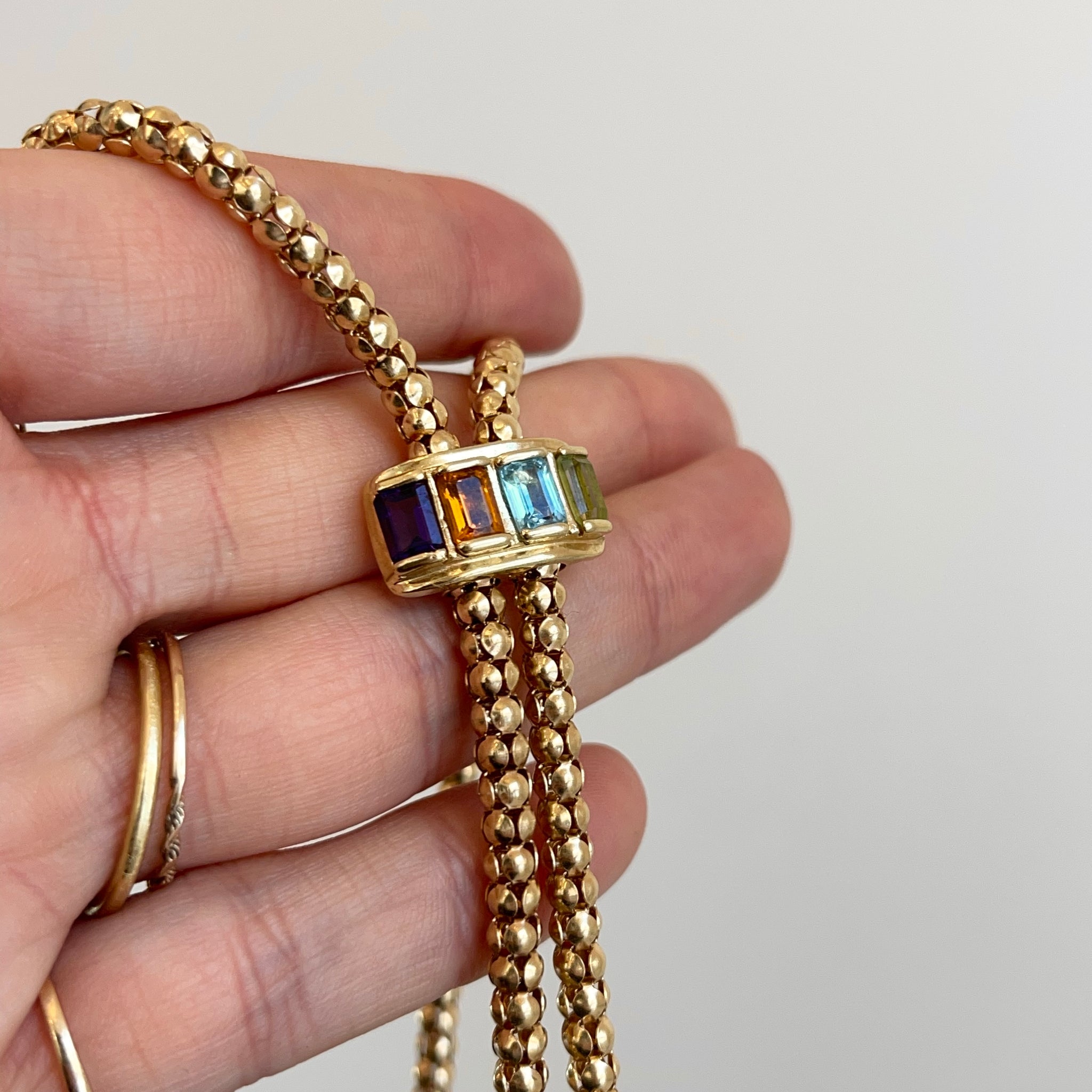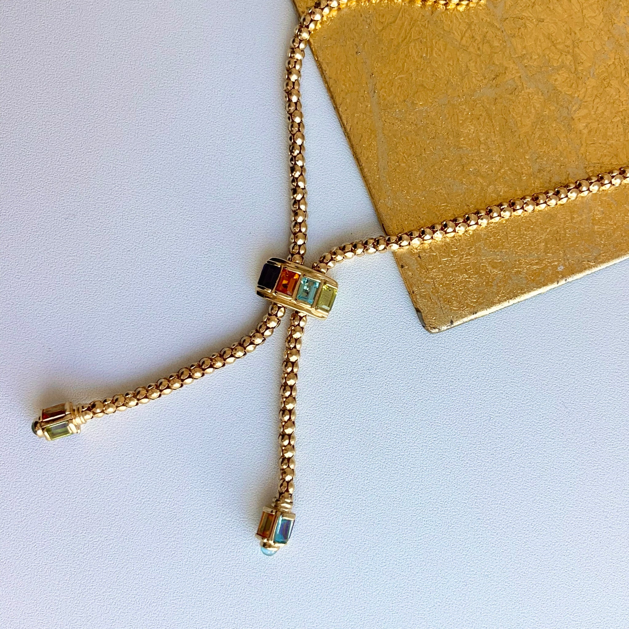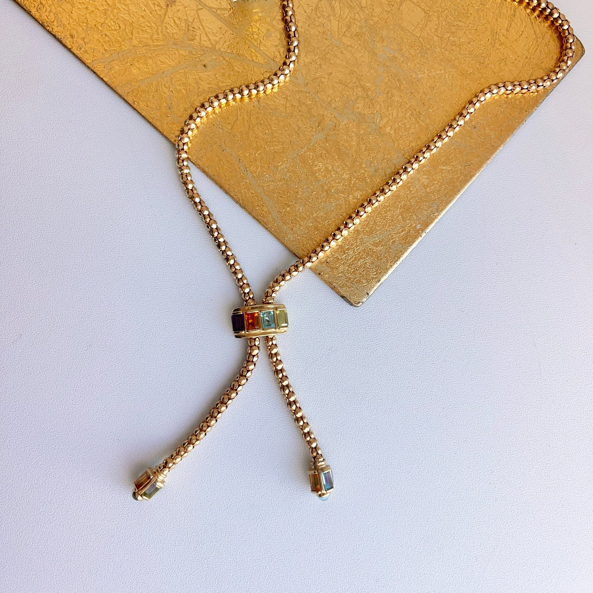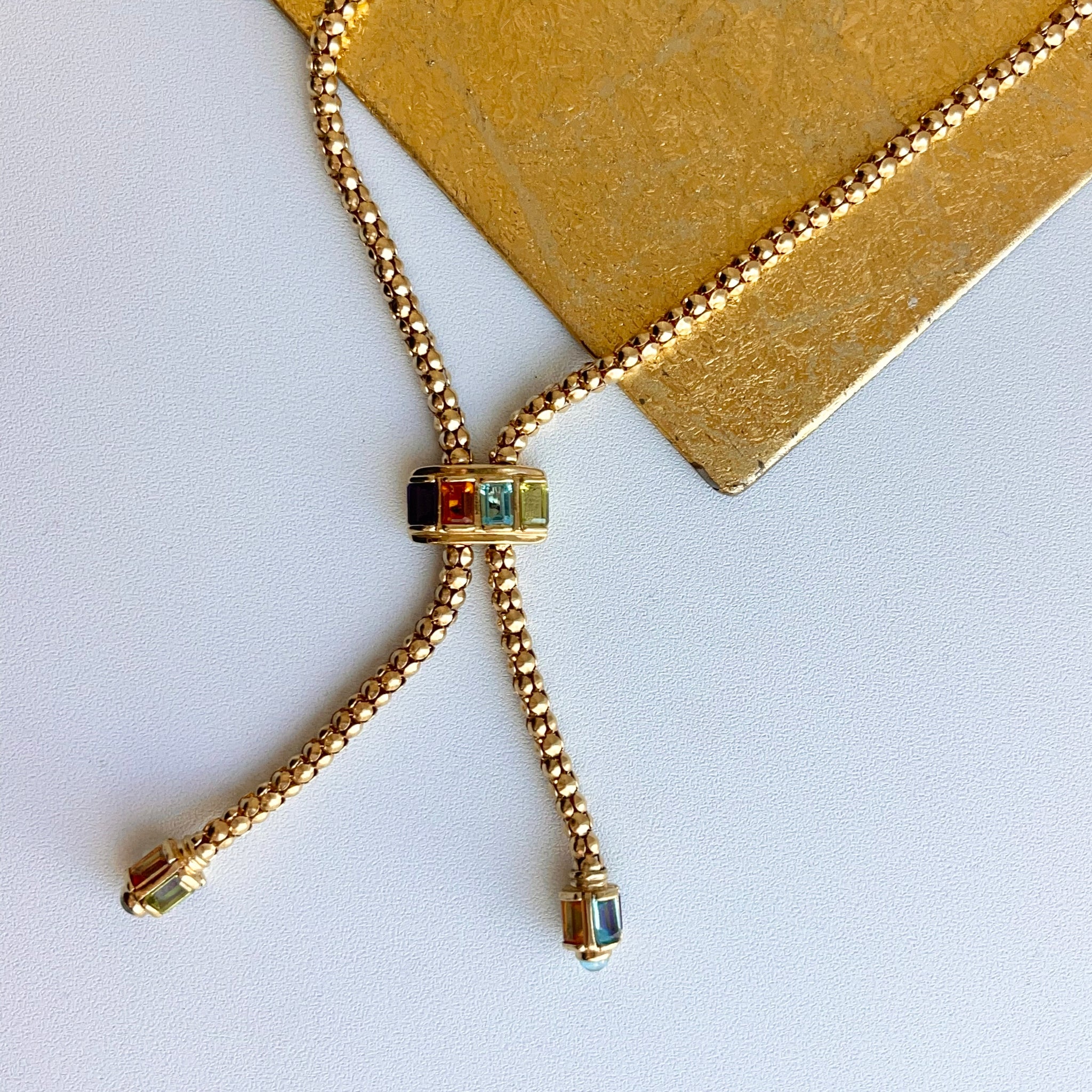 Estate 14KT yellow gold Byzantine style with genuine emerald-cut, gemstone pendants, Lariat Necklace. Beautiful mix of genuine, blue topaz, amethyst, peridot, and citrine.