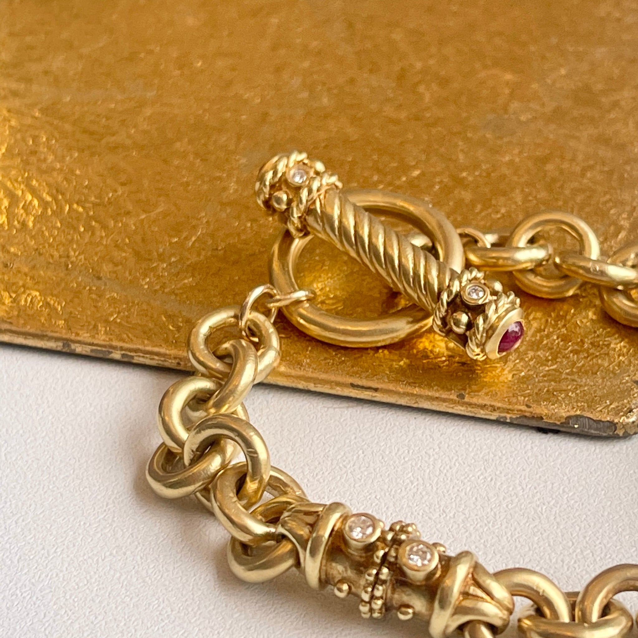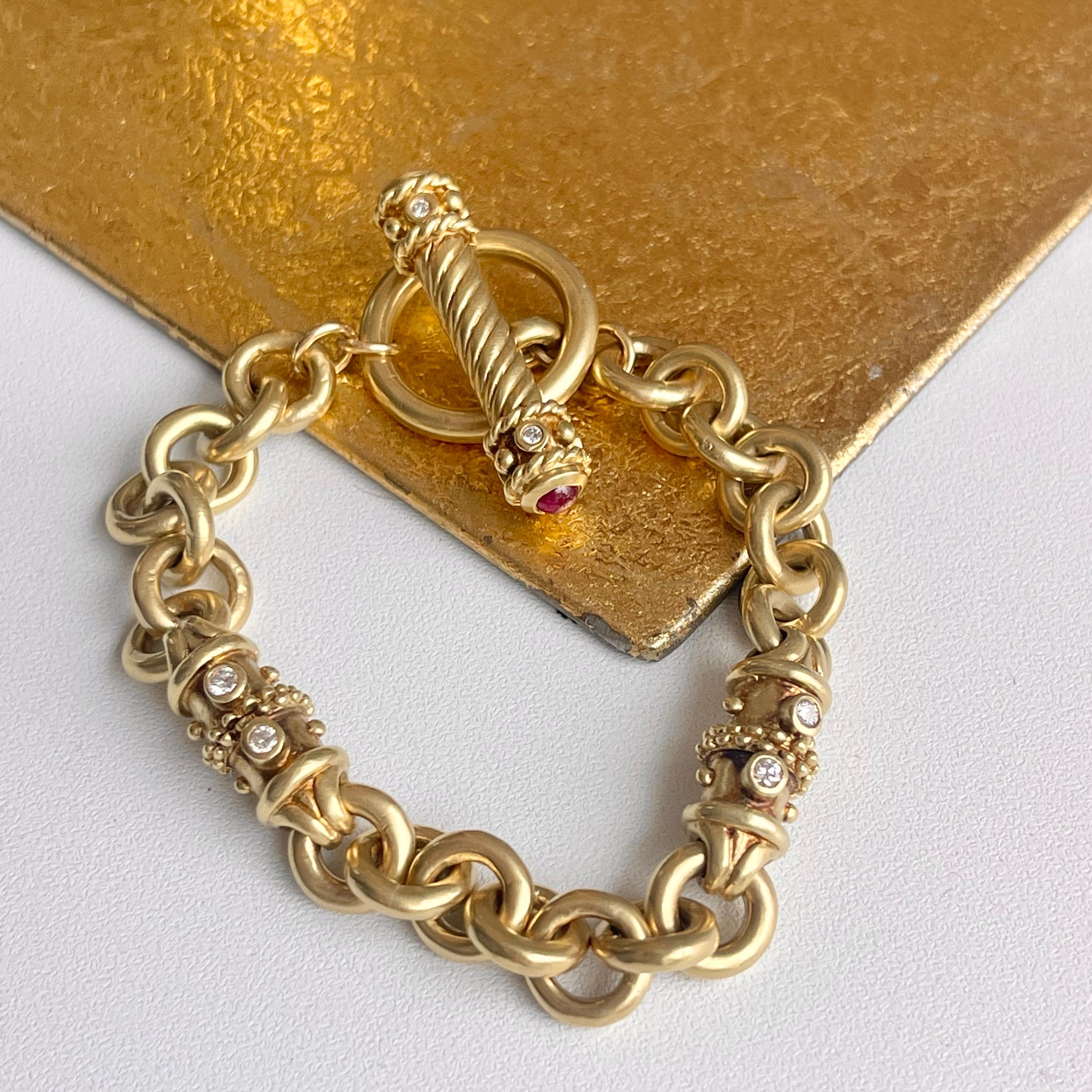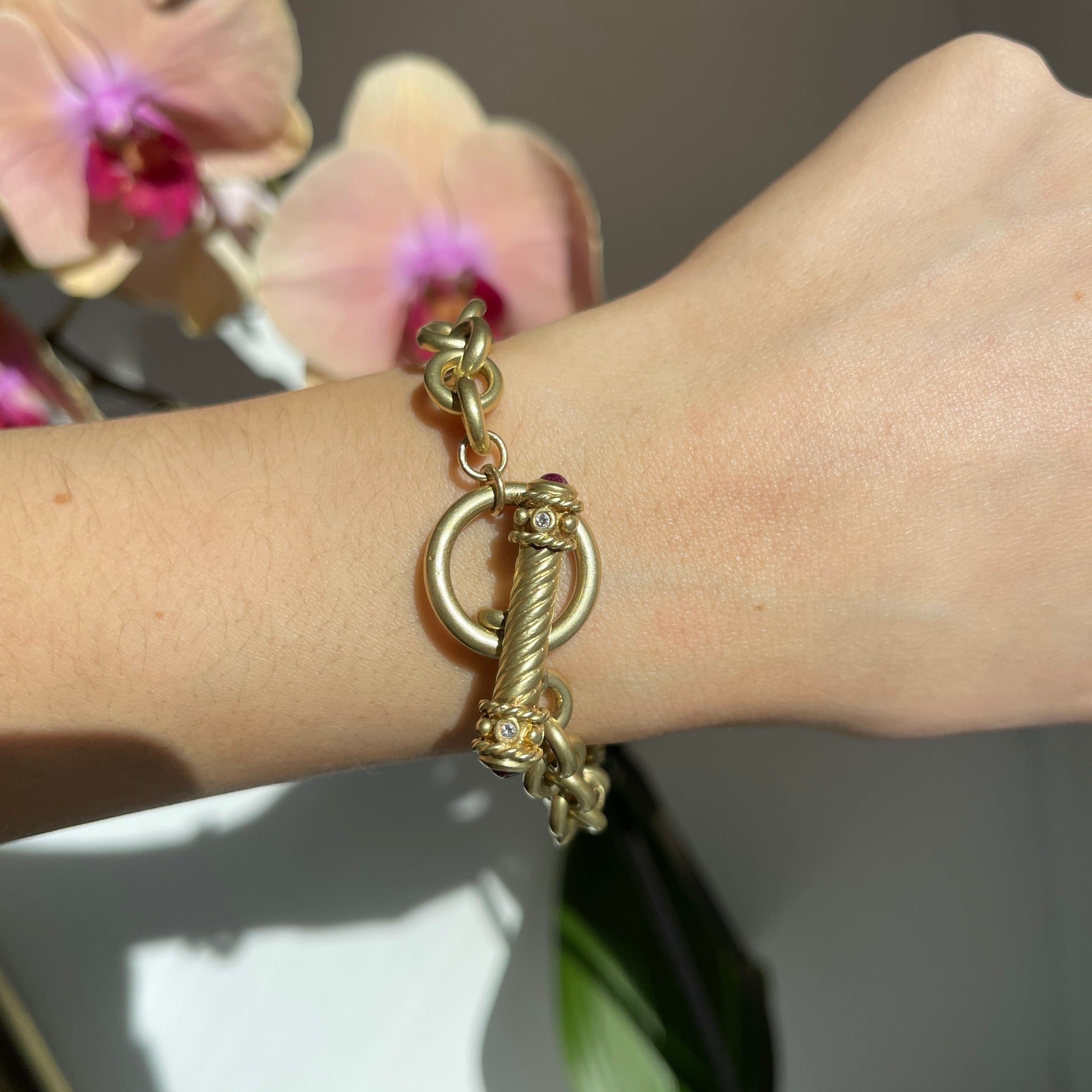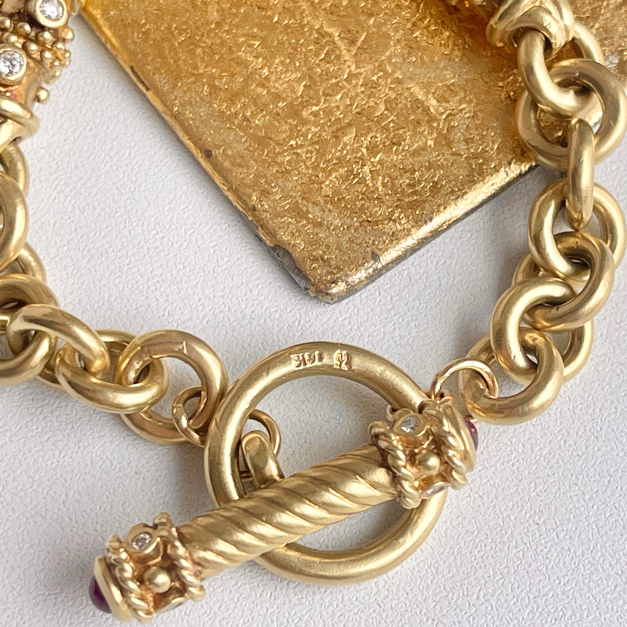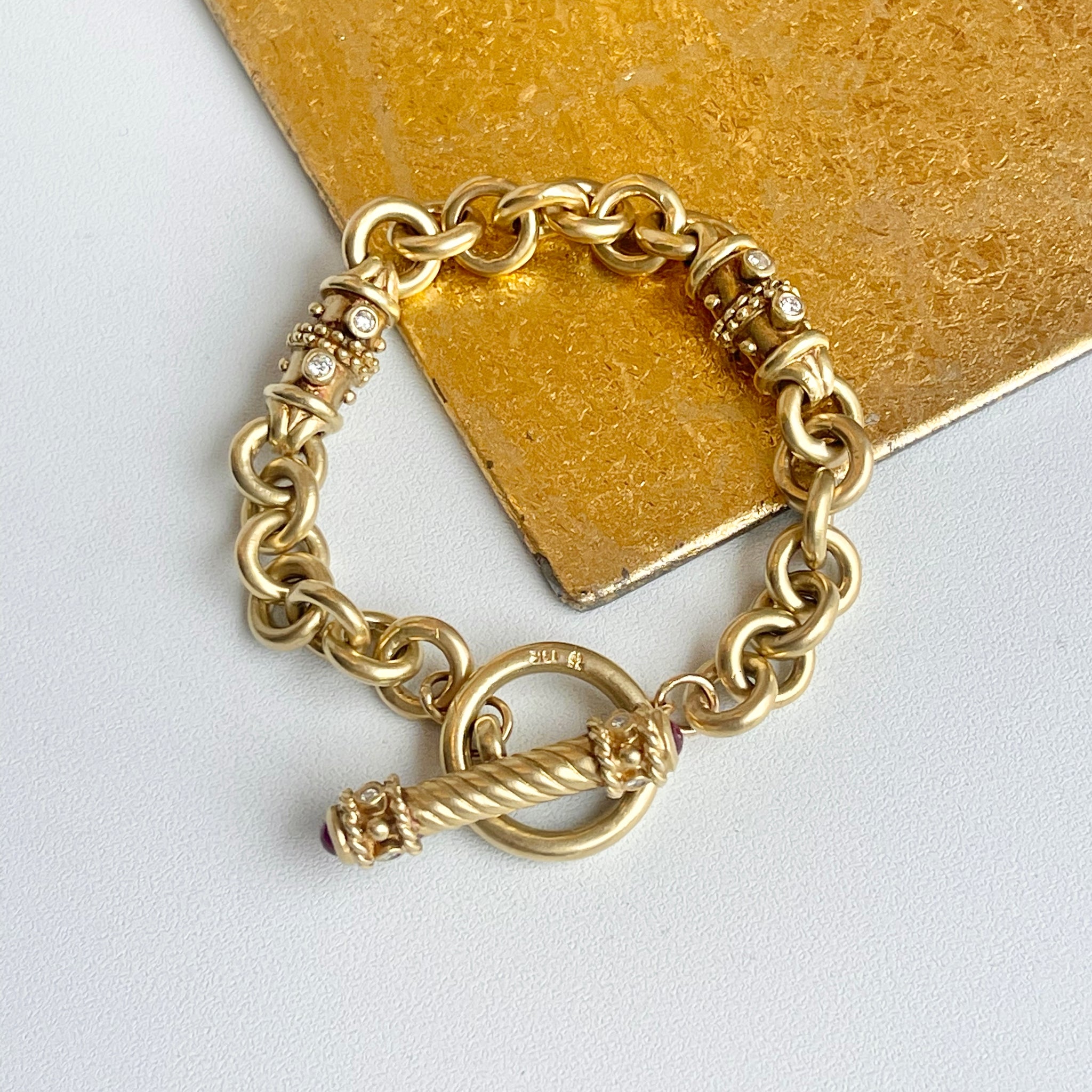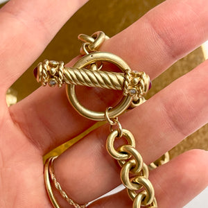 Estate 14KT Yellow Gold Byzantine Rolo Diamond + Ruby Toggle Bracelet
