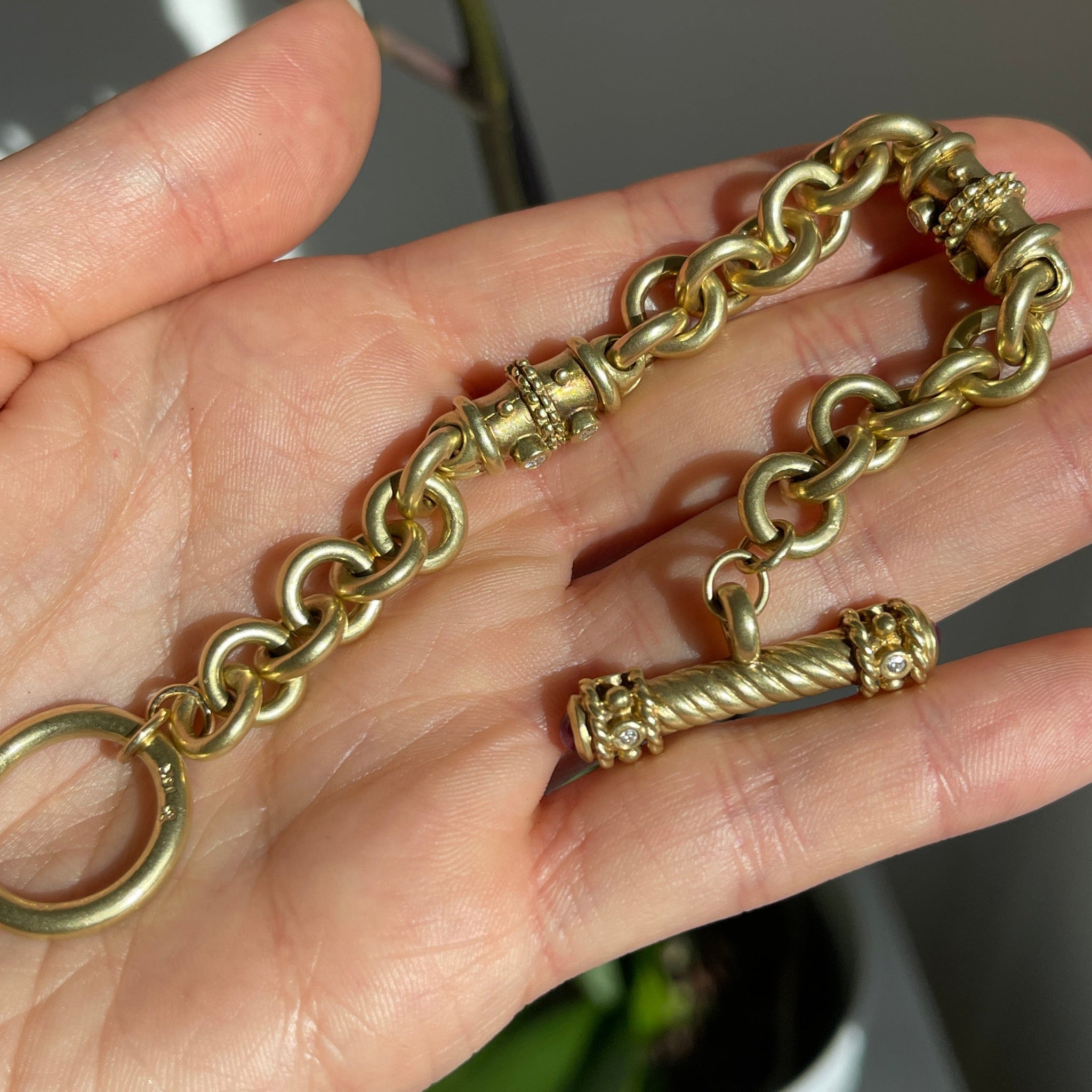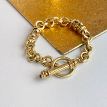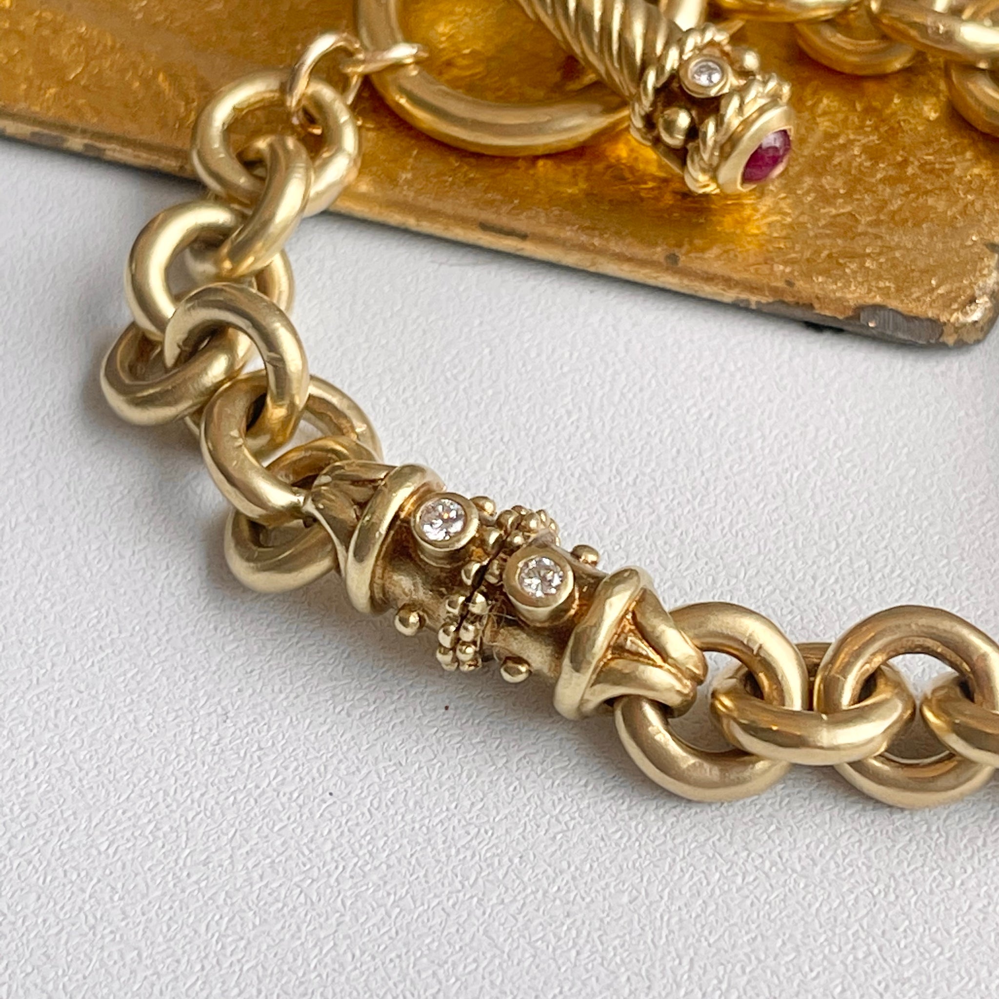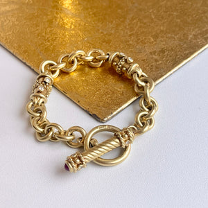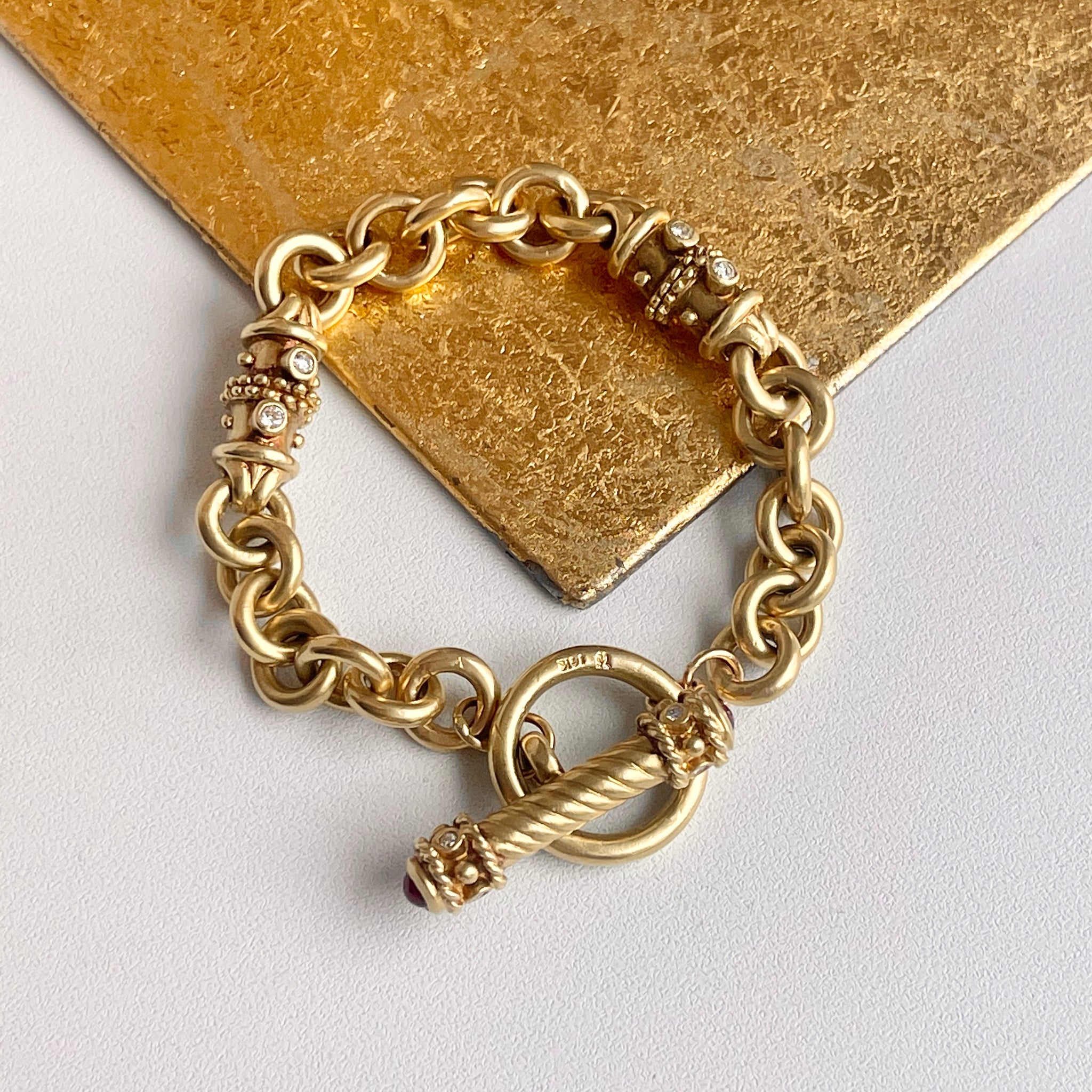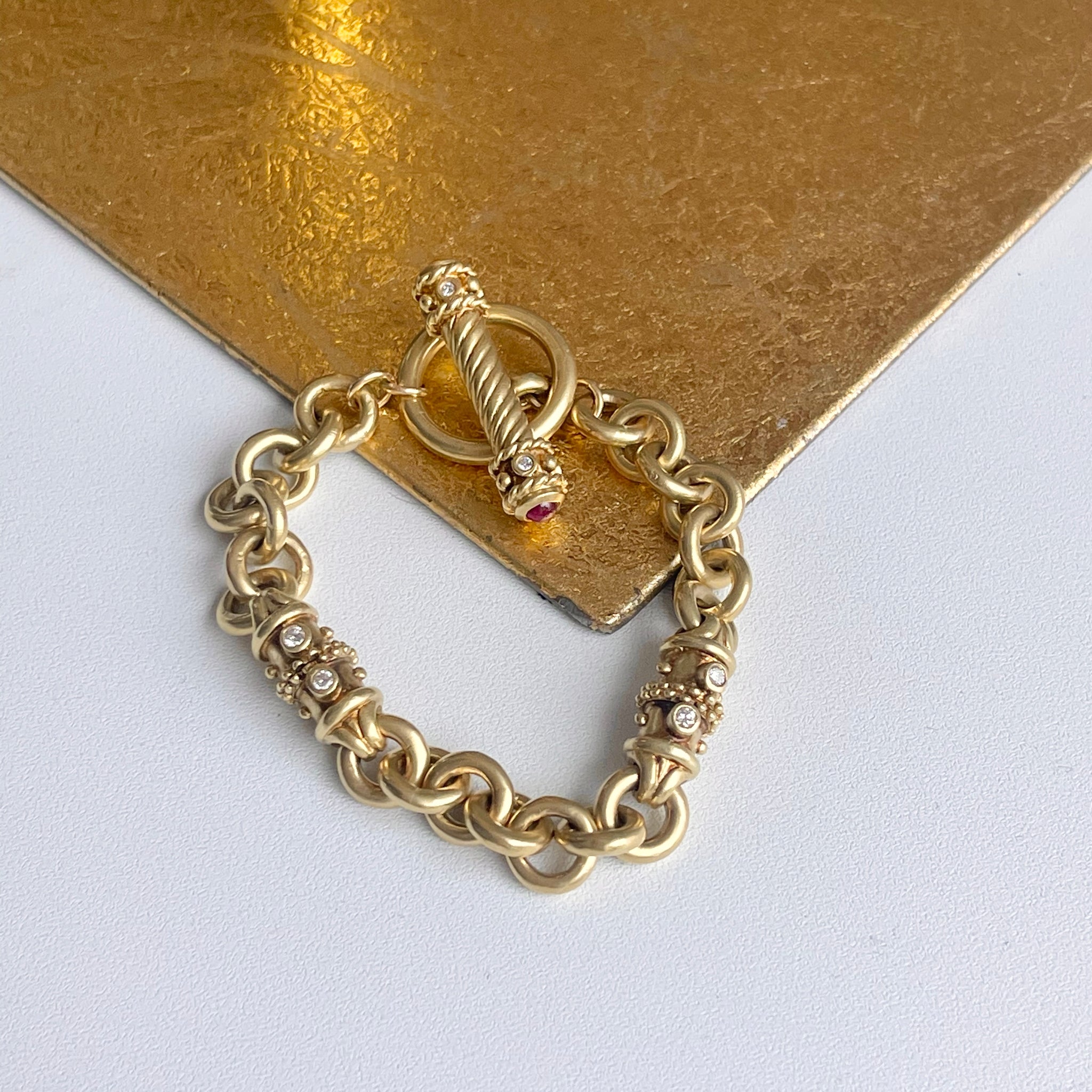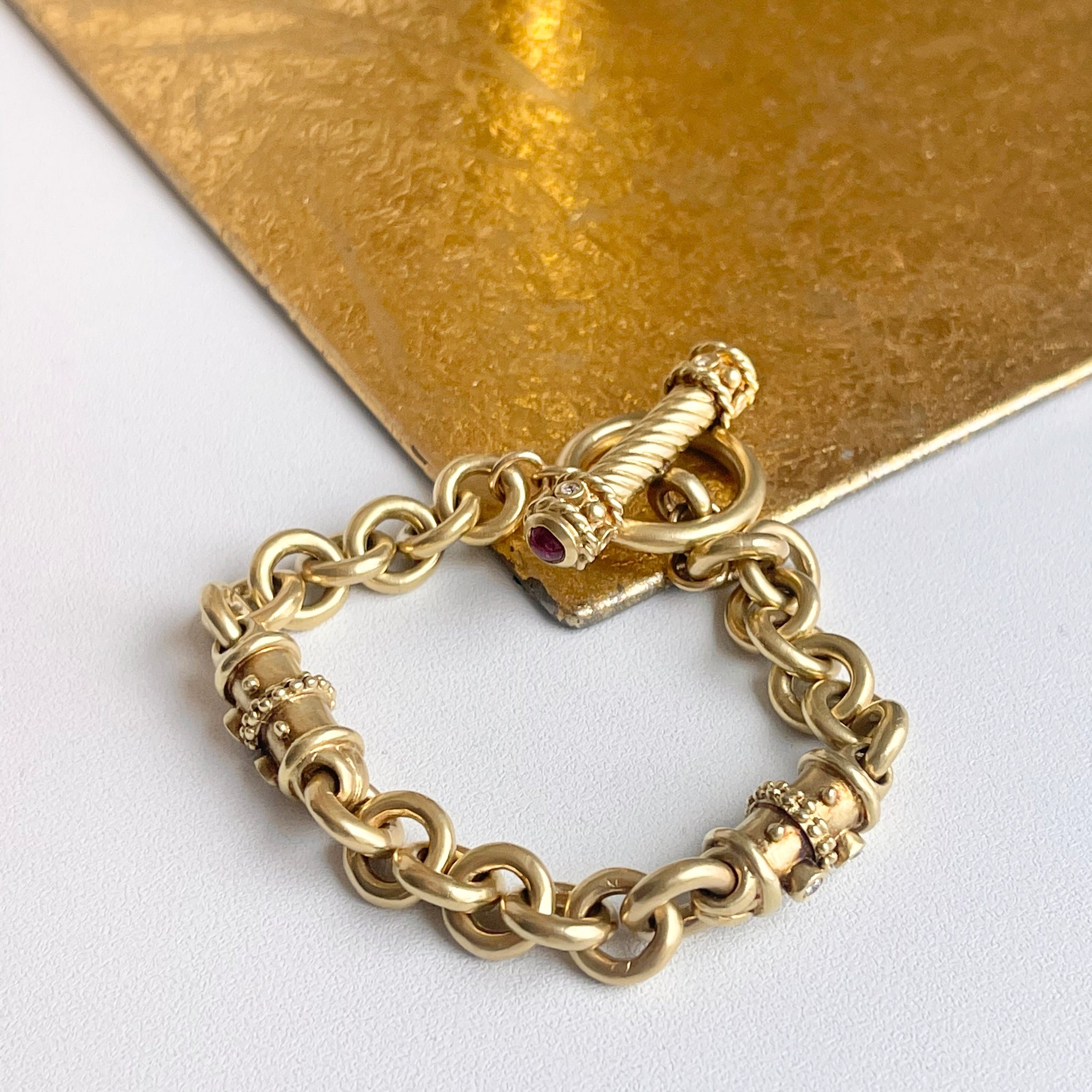 Estate 14KT Yellow Gold Byzantine Rolo Diamond + Ruby Toggle Bracelet