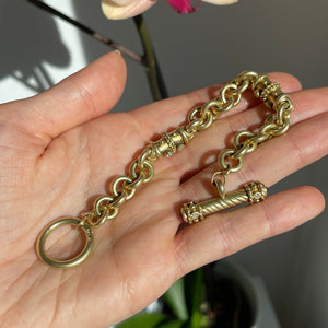 Estate/ Vintage 14KT Yellow Gold Rounded Rolo Link Etruscan/ Byzantine Links + Toggle Clasp Bracelet with Cabochon Fine Ruby + Diamond. Bracelet unscrews and can connect to others like that. We believe the smaller gold links near toggle were added for length, as they do not match. Also suspected that was the hallmark previously
