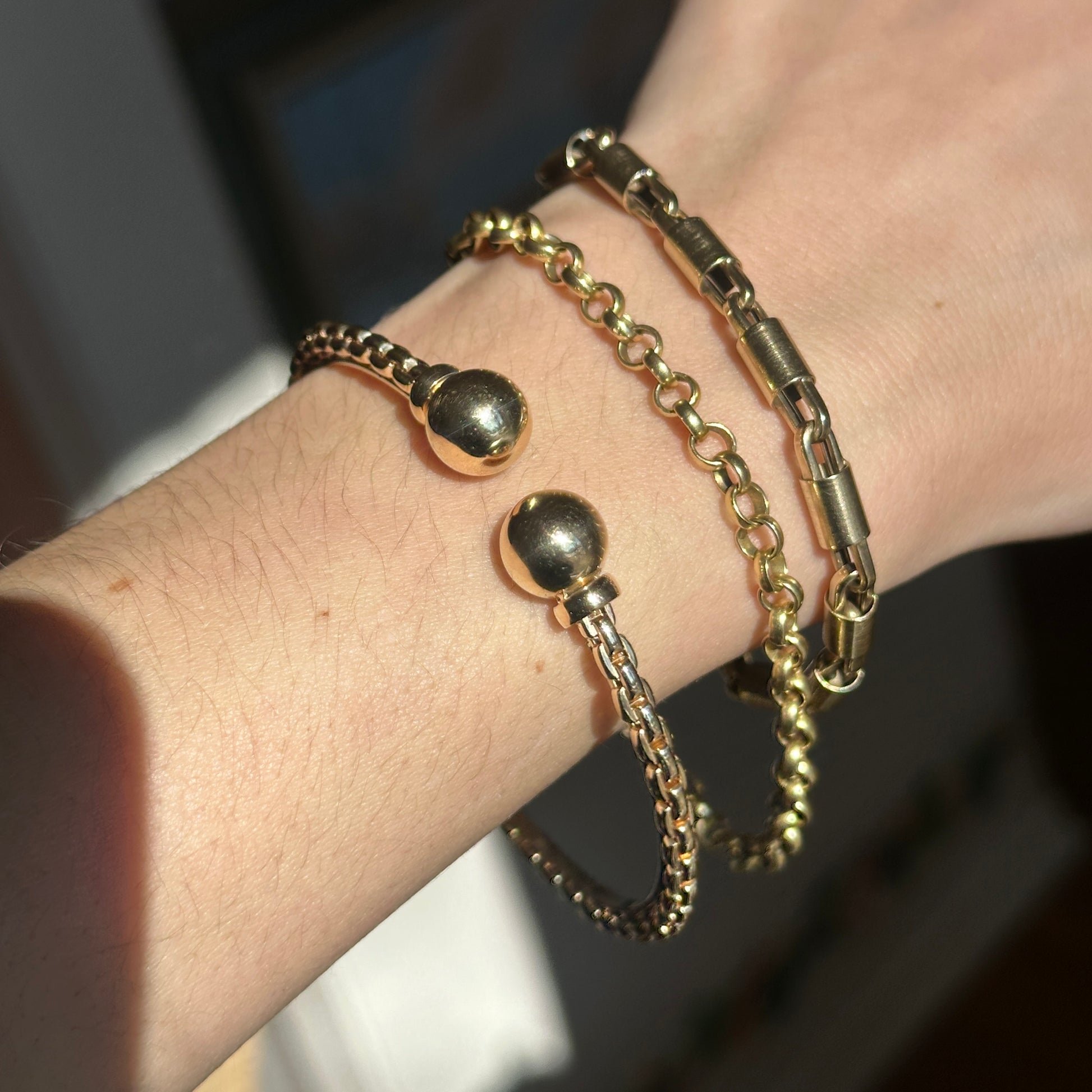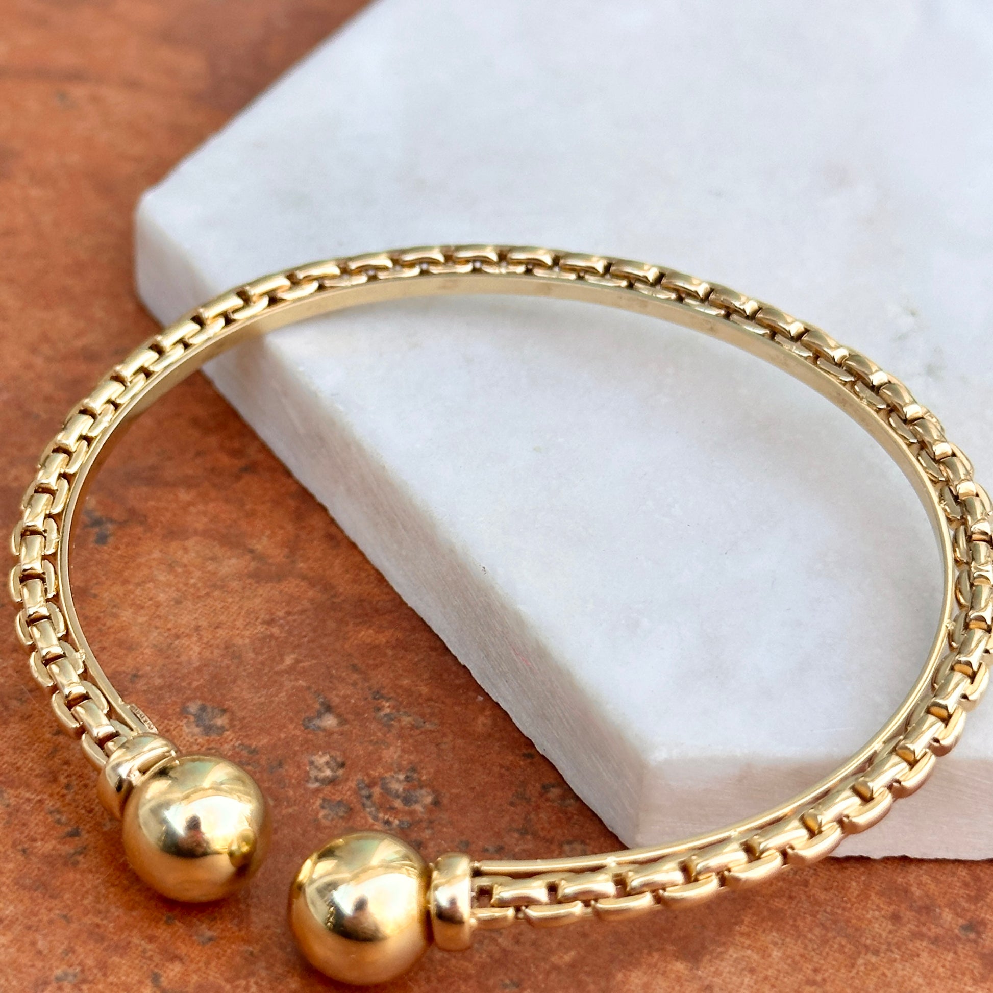 Estate Vintage 14KT Yellow Gold Open Weave “Chain” Link and Double Ball End Cap Bangle Cuff Bracelet