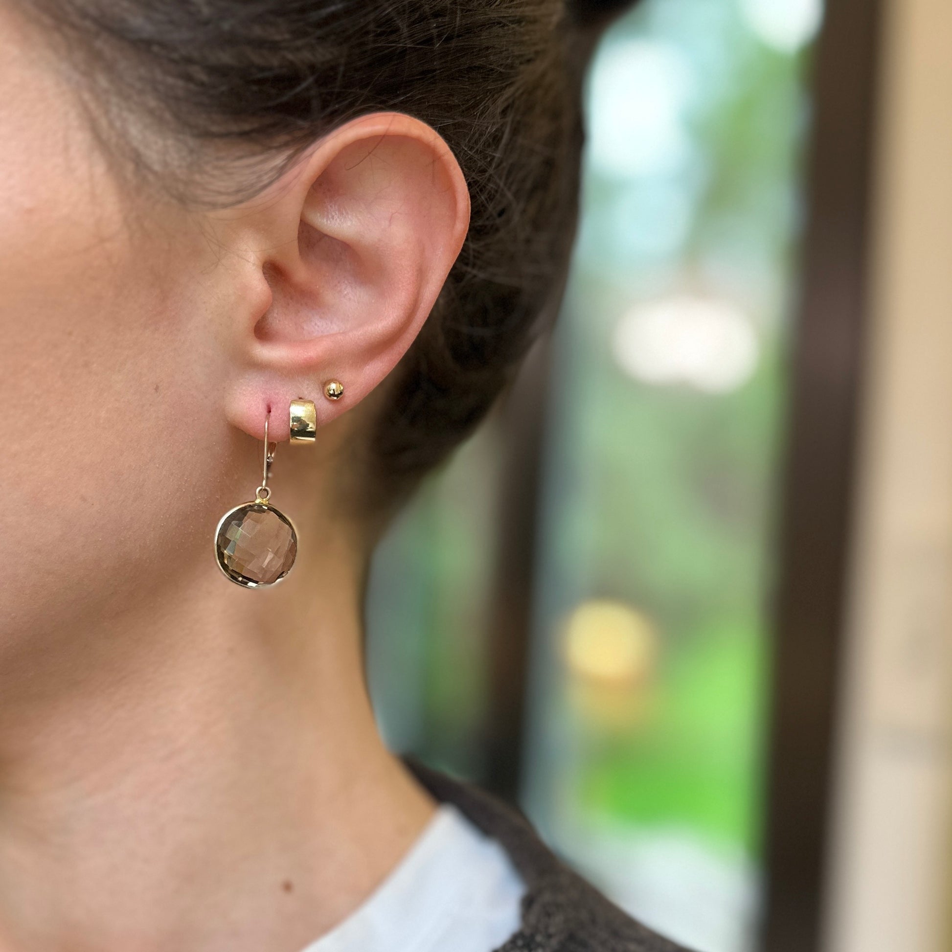 Estate 14KT Yellow Gold Round Double Sided Checkerboard Faceted Smokey Quartz Gemstone Leverback Dangle Earrings