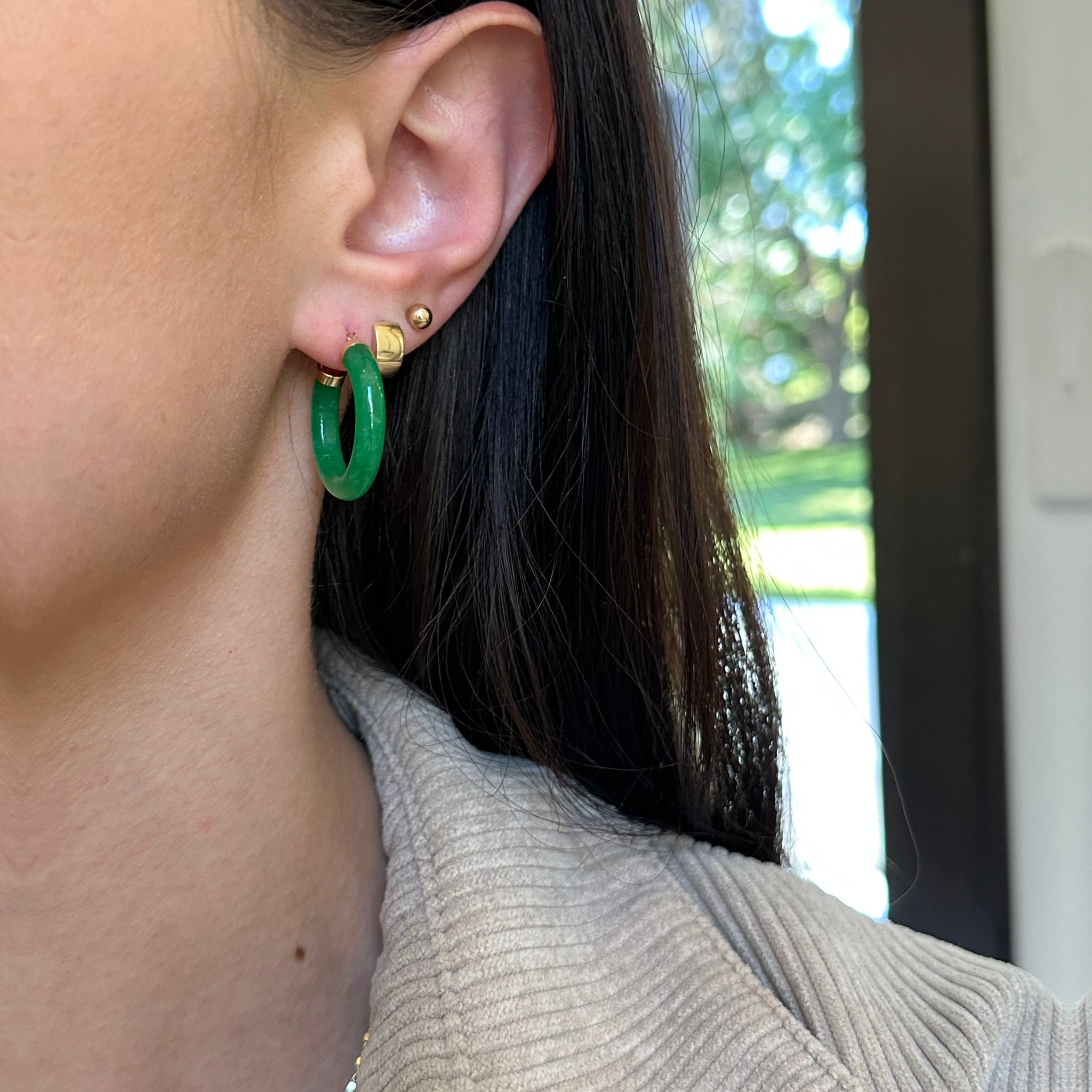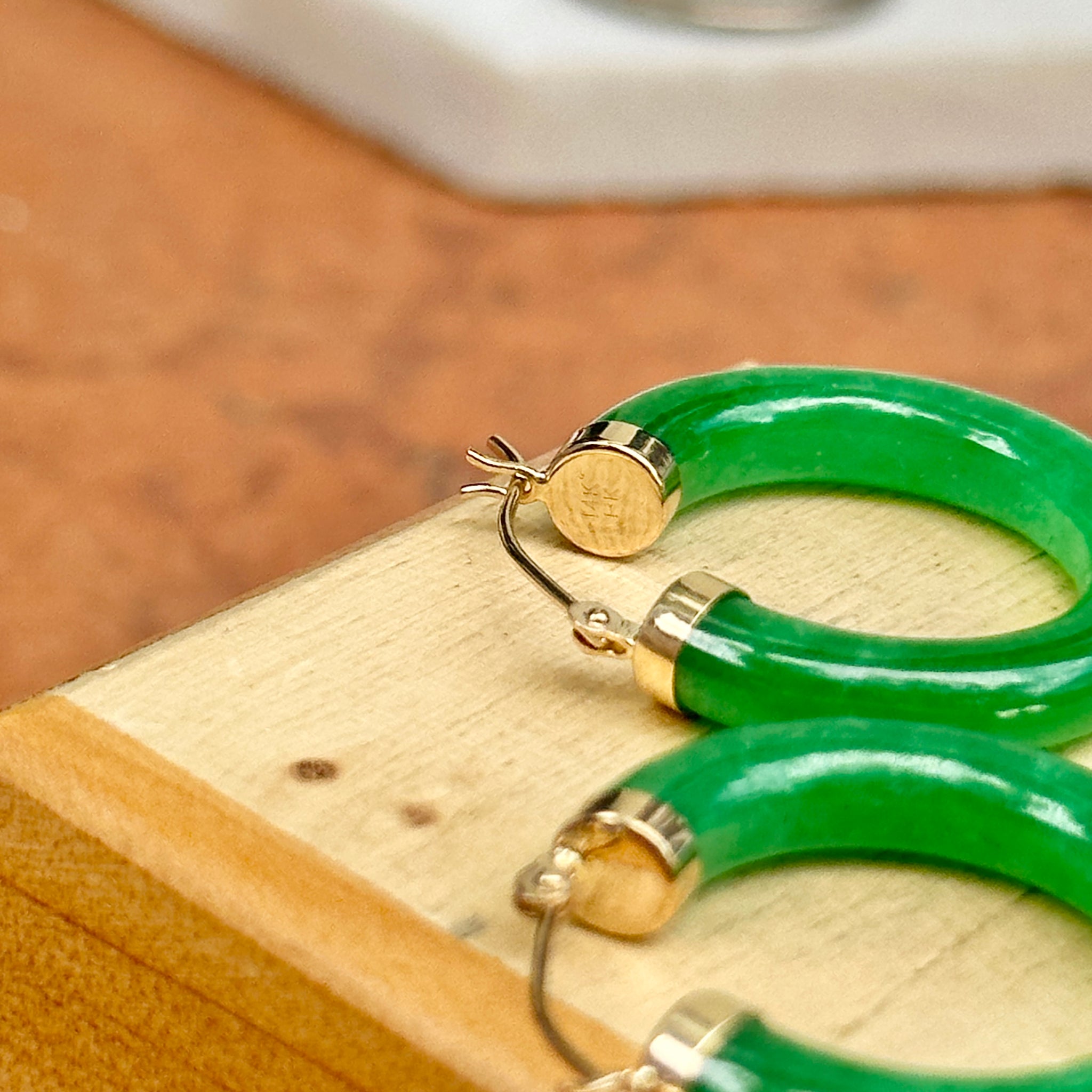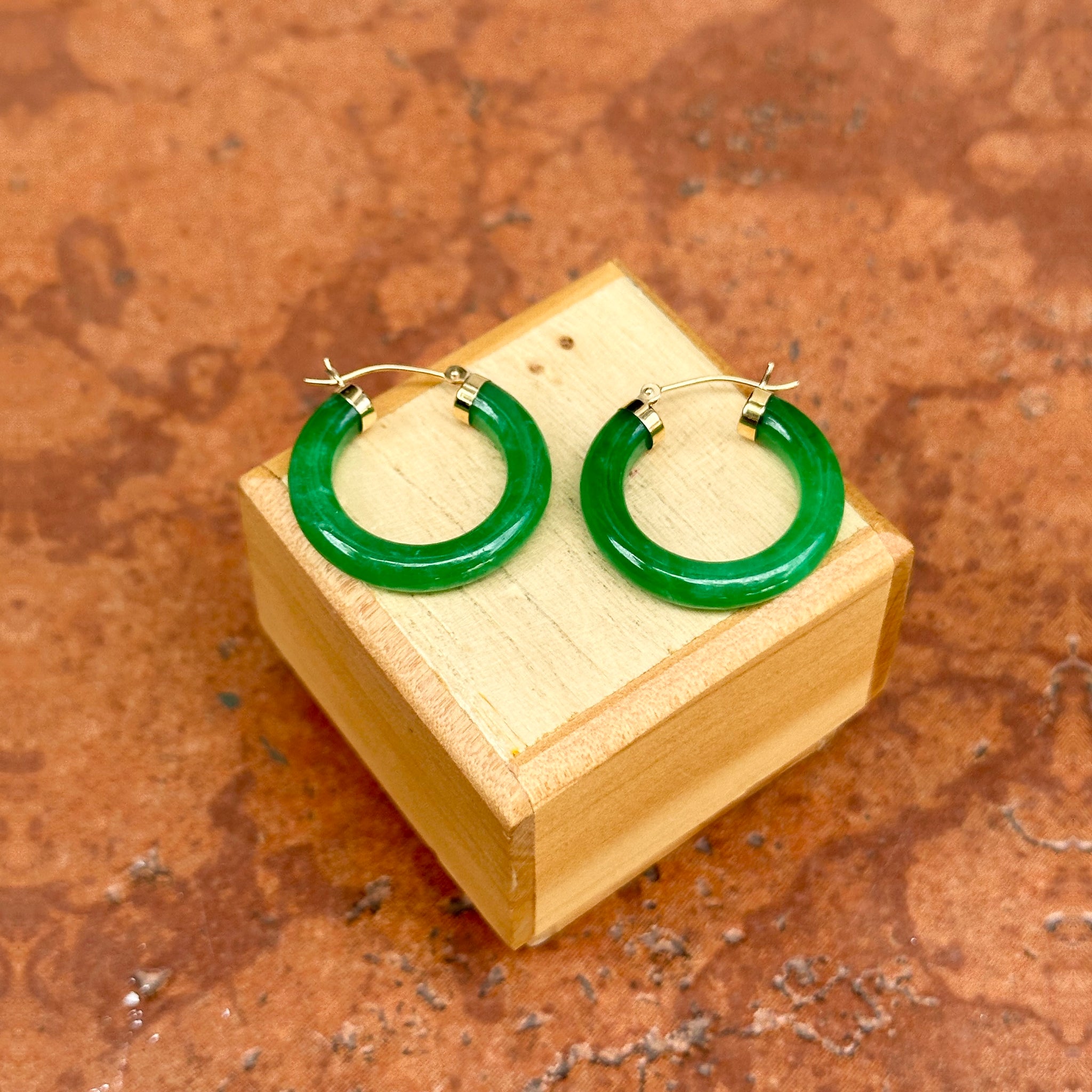Estate 14KT Yellow Gold Dark Green Jade Tube Hoop Earrings