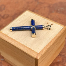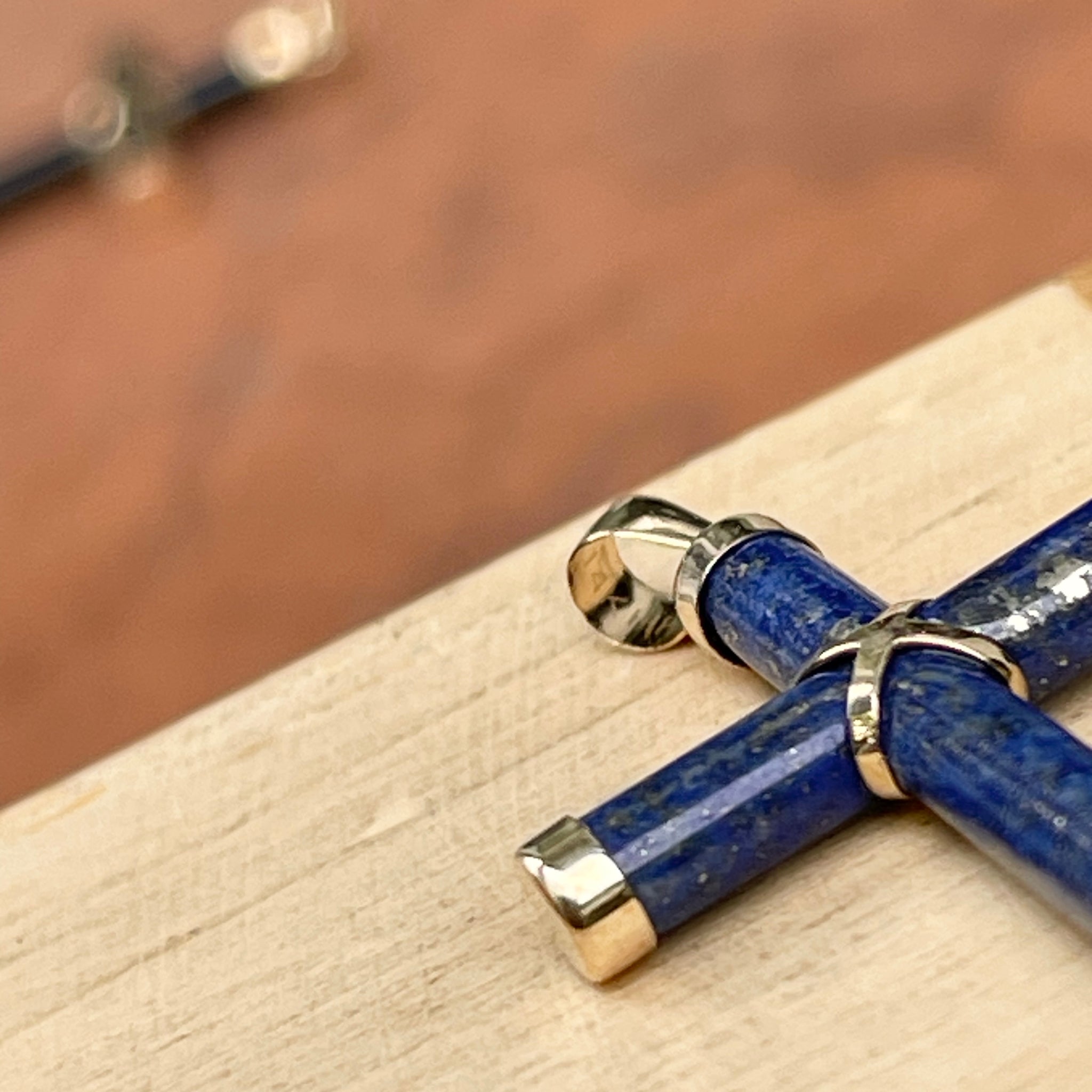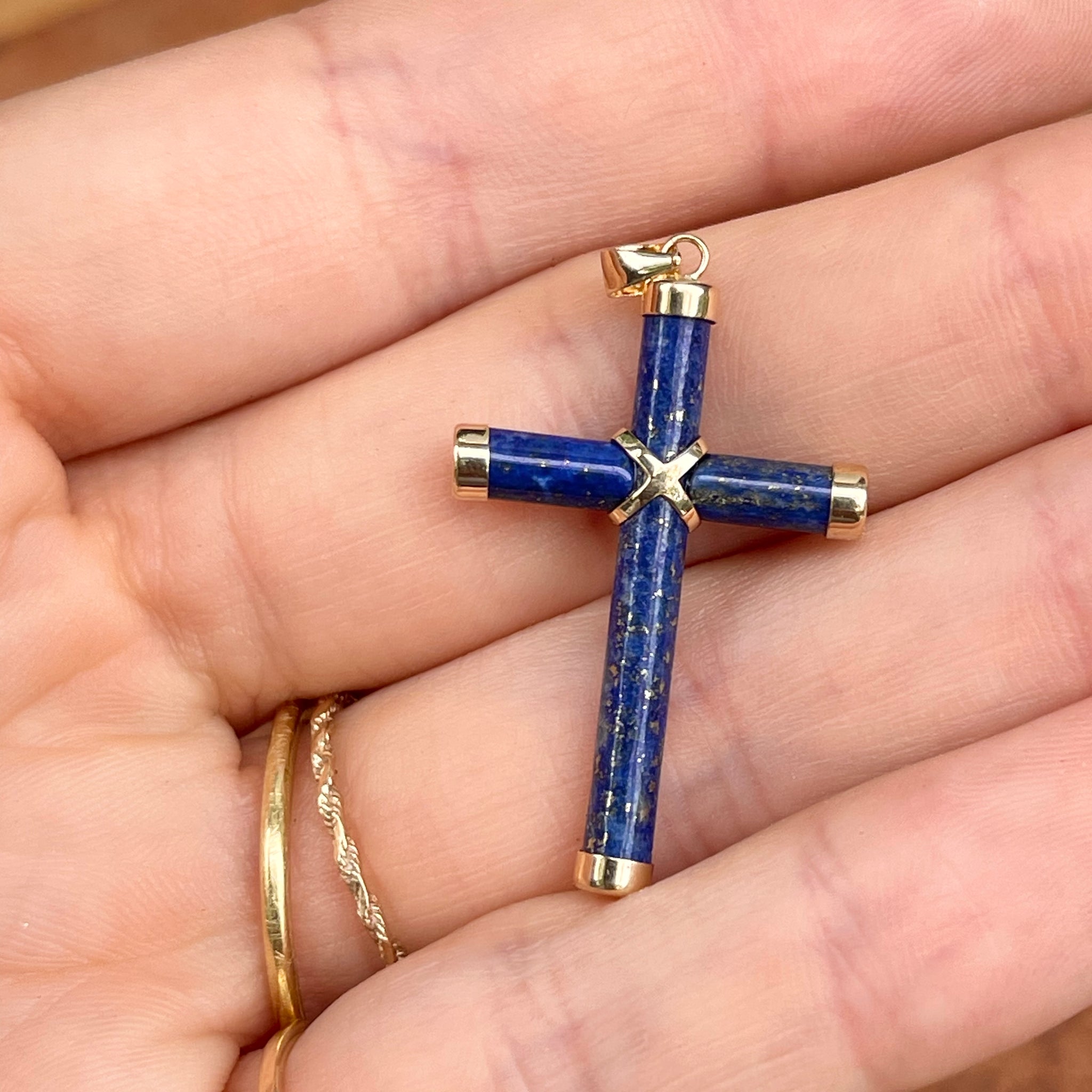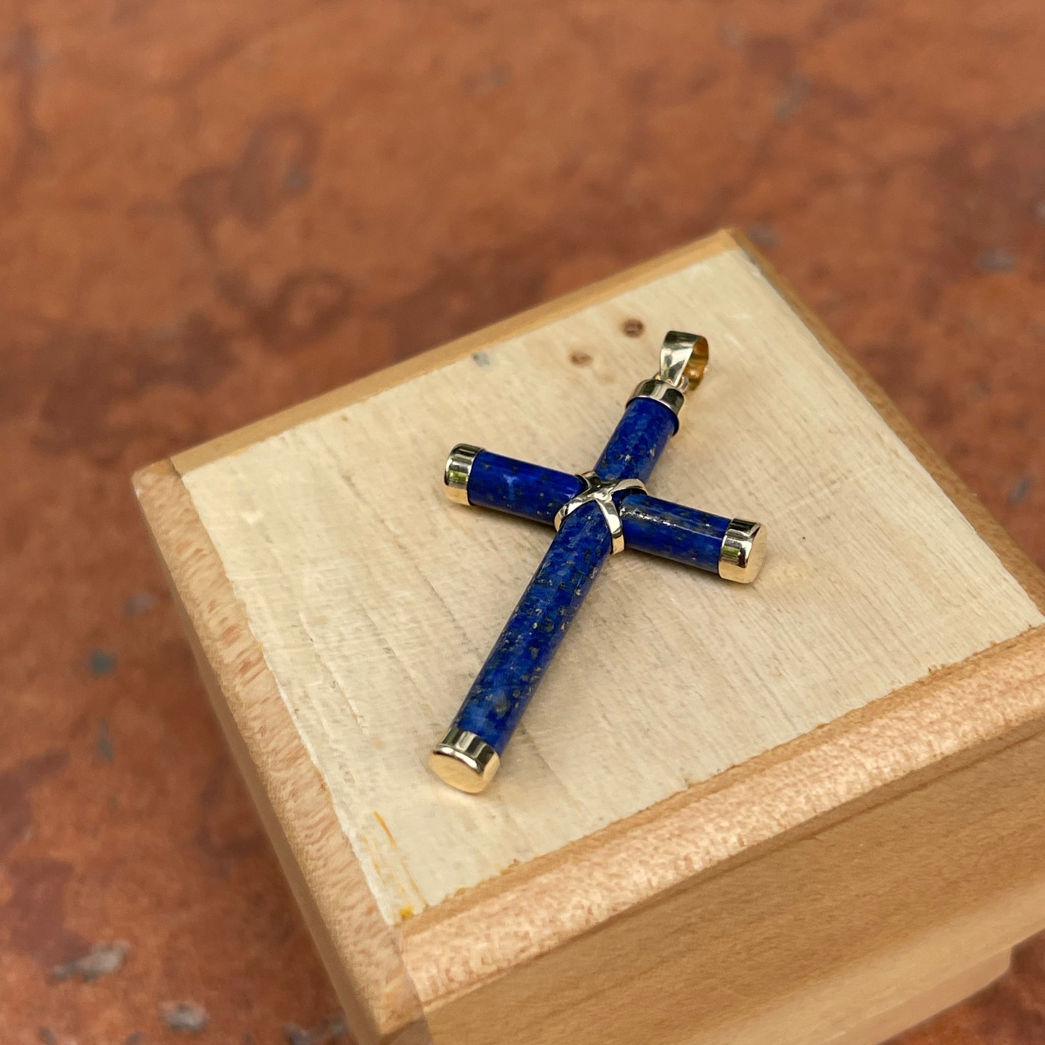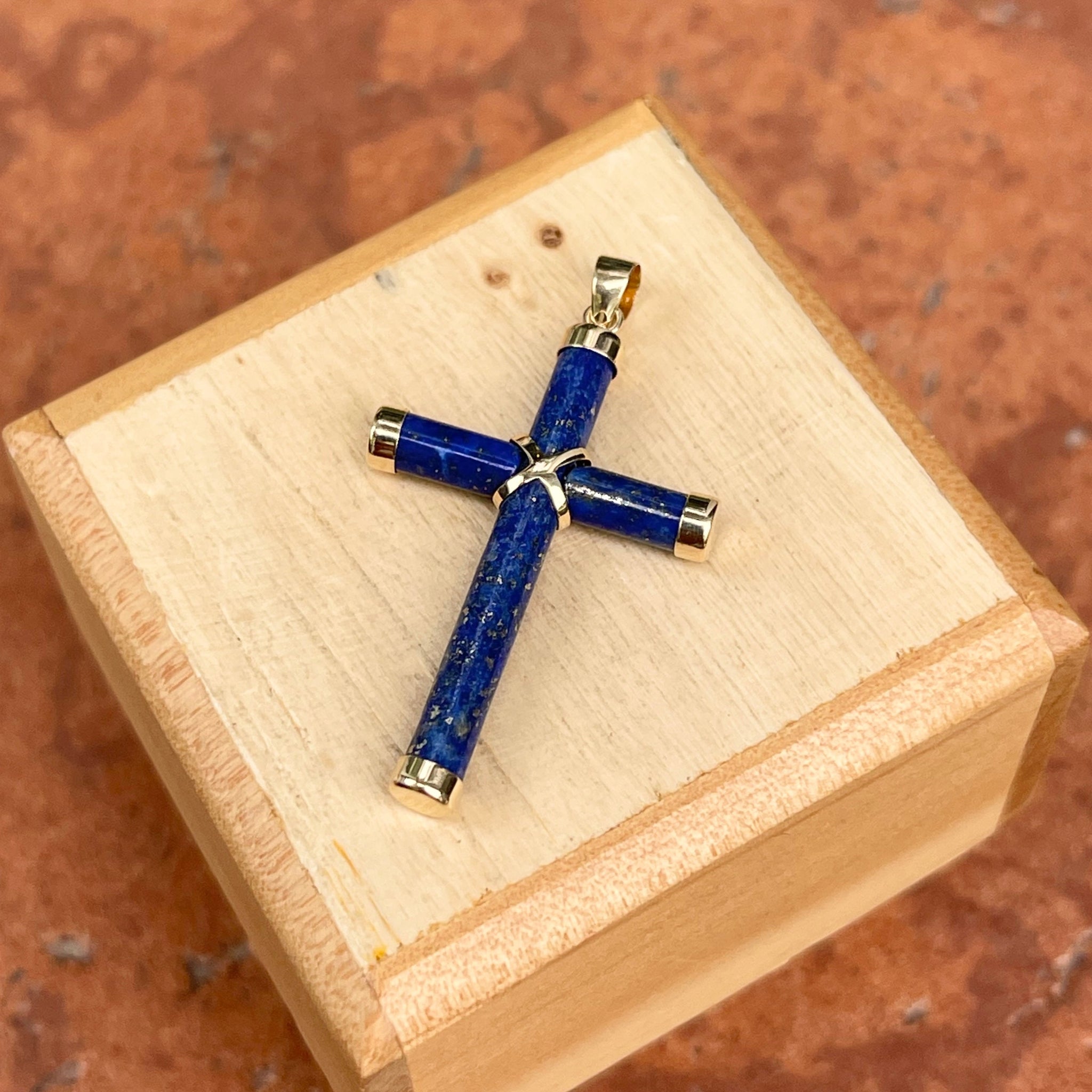 Estate 14k yellow gold detailed, genuine blue lapis cross pendant.