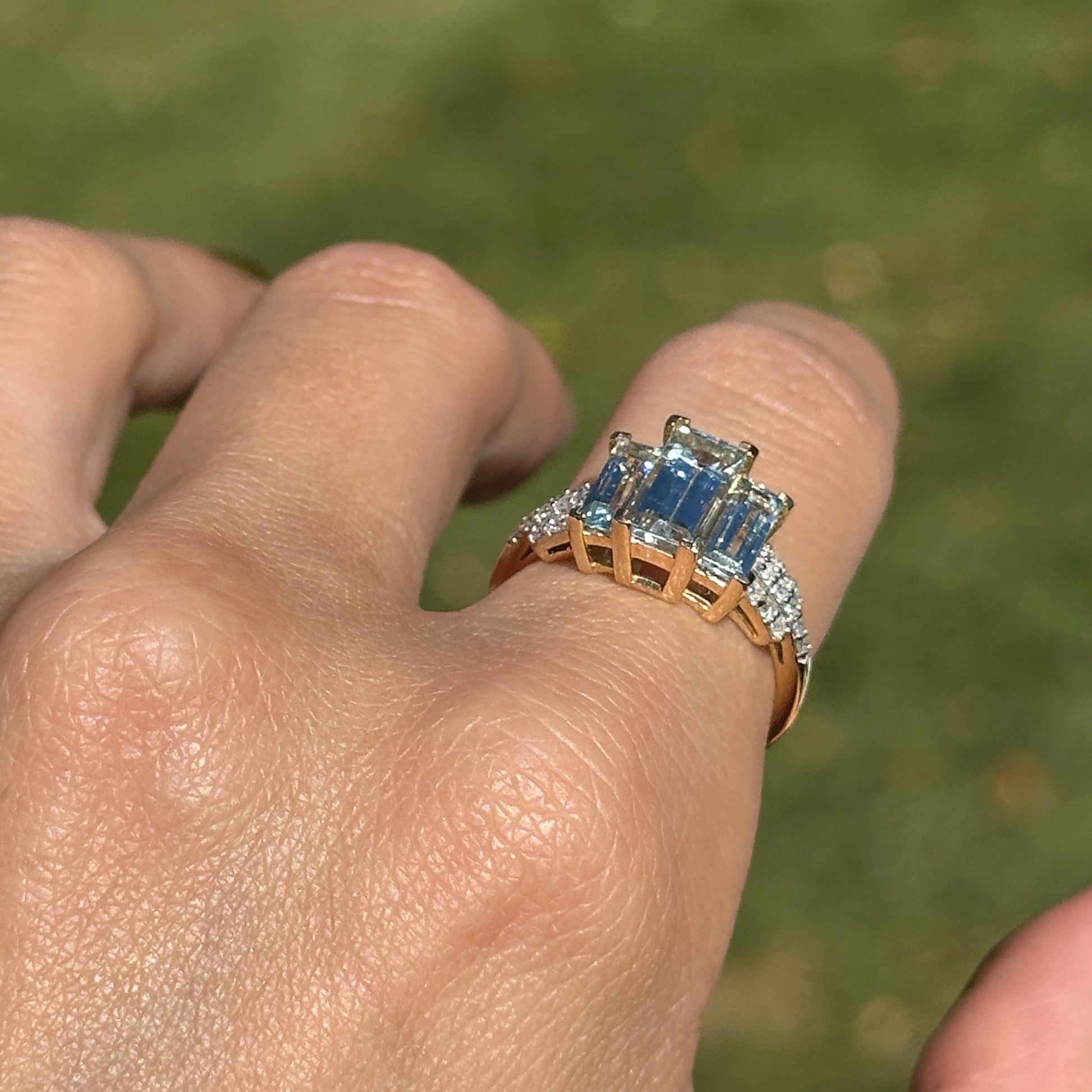 Estate/ Vintage 14KT Yellow Gold Ring with Genuine, Elongated Emerald-Cut/ Baguette Aquamarine + Diamond Accents